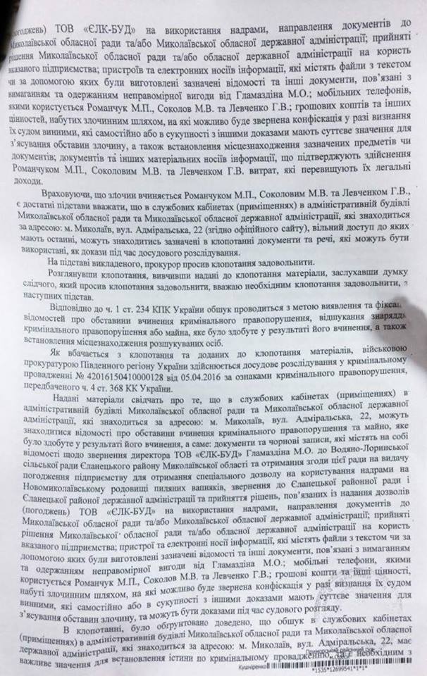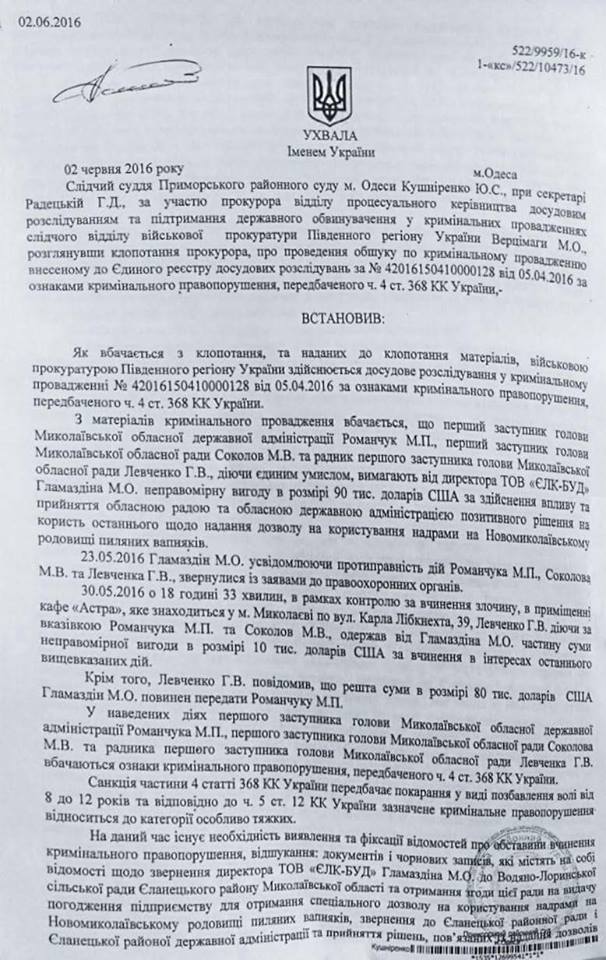 — Из материалов уголовного производства предполагается, что первый заместитель главы Николаевской облгосадминистрации Николай Романчук, первый заместитель главы Николаевского областного совета Михаил Соколов и советник главы Николаевского областного совета Левченко, действуя с единым умыслом, требовали от директора «ЕЛК-СТРОЙ» Галмаздина неправомерную выгоду в размере 90 тысяч долларов США, сказано в документе.