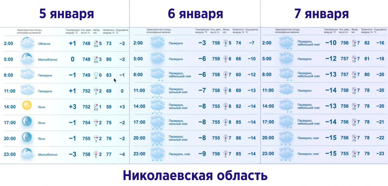 Наиболее ощутимо изменение погоды станет для николаевцев утром 6 января, начнется сильный северный ветер 6-7 м/с, а температура воздуха снизится до -7°. Тогда же ожидается начало сильного снегопада.