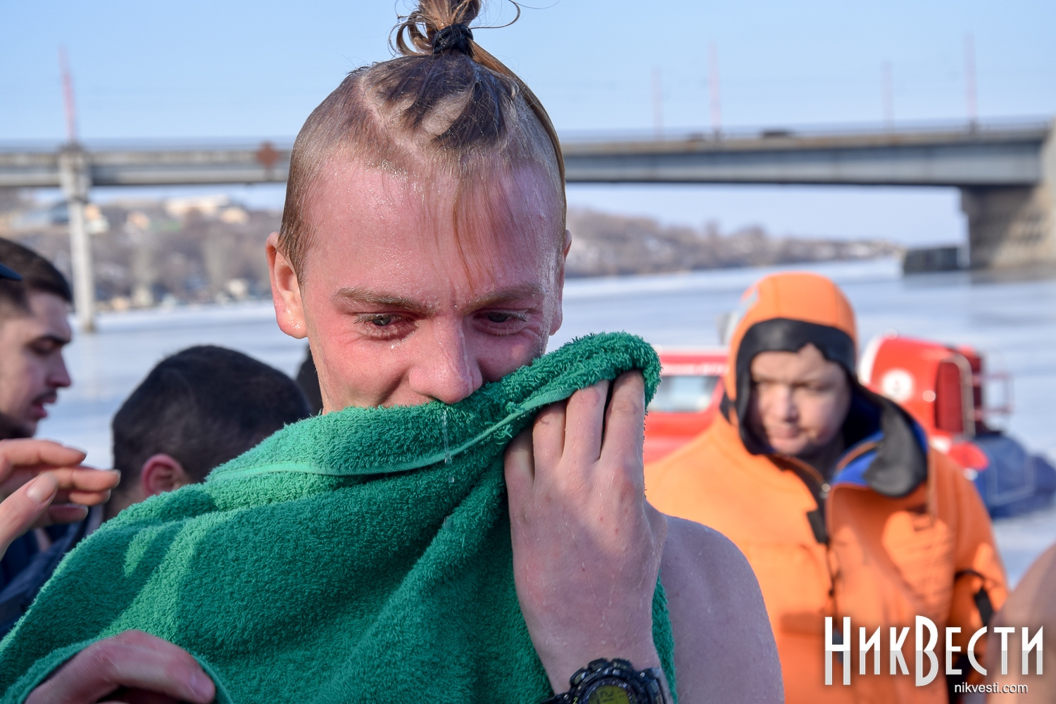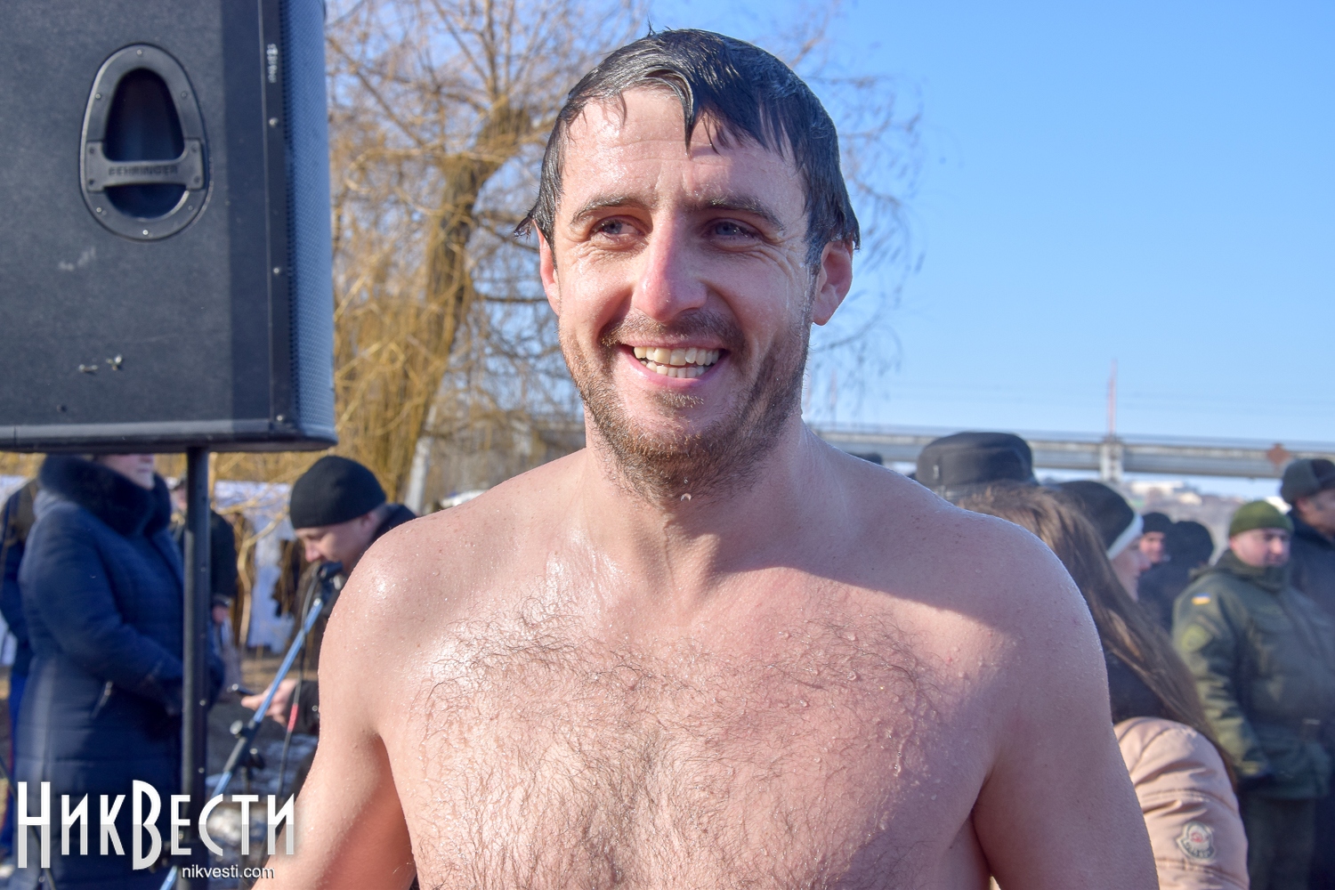Николаевец Дмитрий окунается в прорубь уже седьмой год подряд. На холод не жалуется и приглашает горожан следовать его примеру.