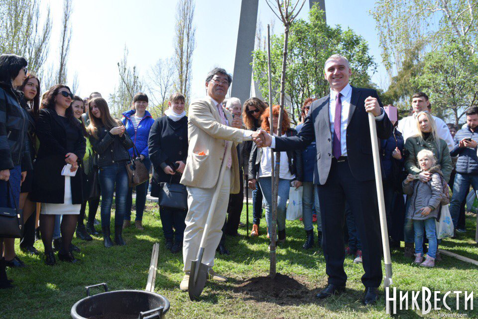 − У нас также есть большие планы не только высадить деревья и пить саке, но и через 10 лет иметь более тесное, плодотворное сотрудничество по кооперации в сфере высокотехнологических производств, будем открывать какие-то предприятия украино-японские. Я думаю, это мероприятие – это маленький шаг в будущем сотрудничестве между Николаевом и Японией, - сказал Александр Сенкевич.