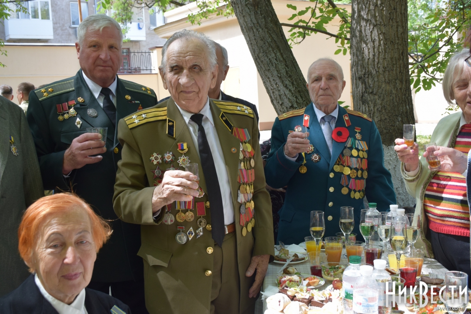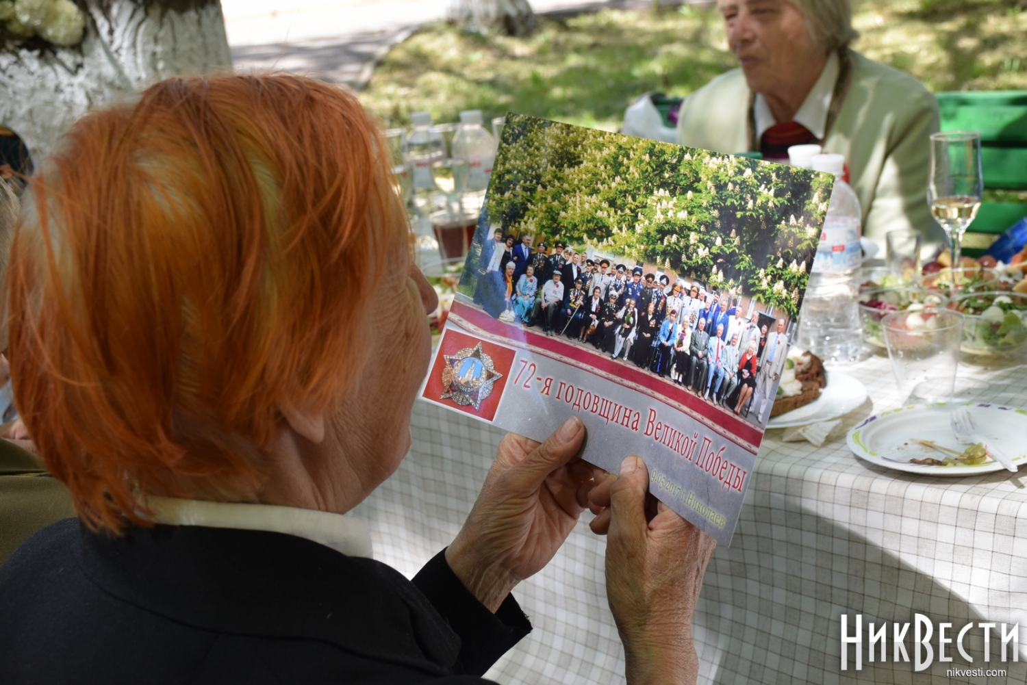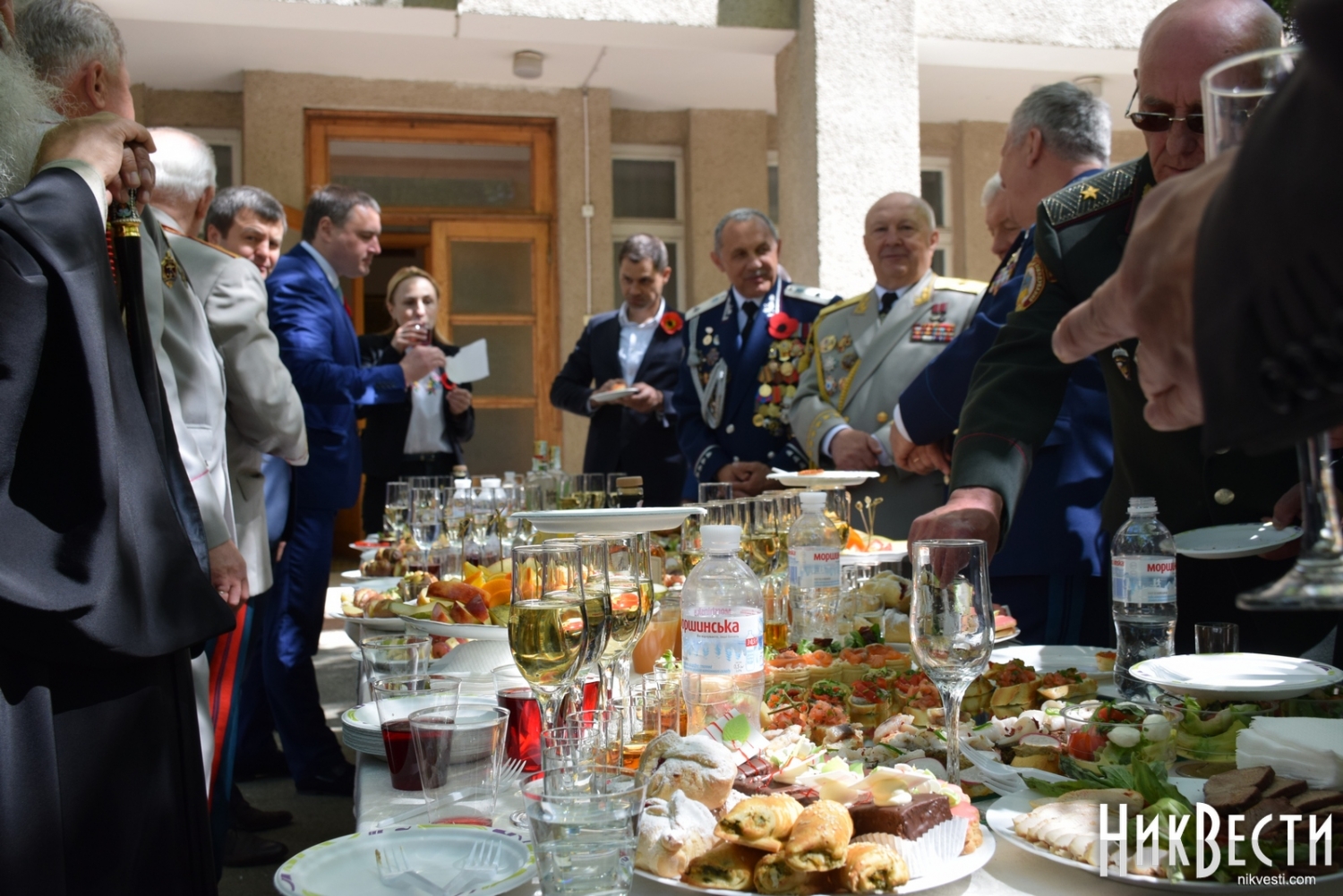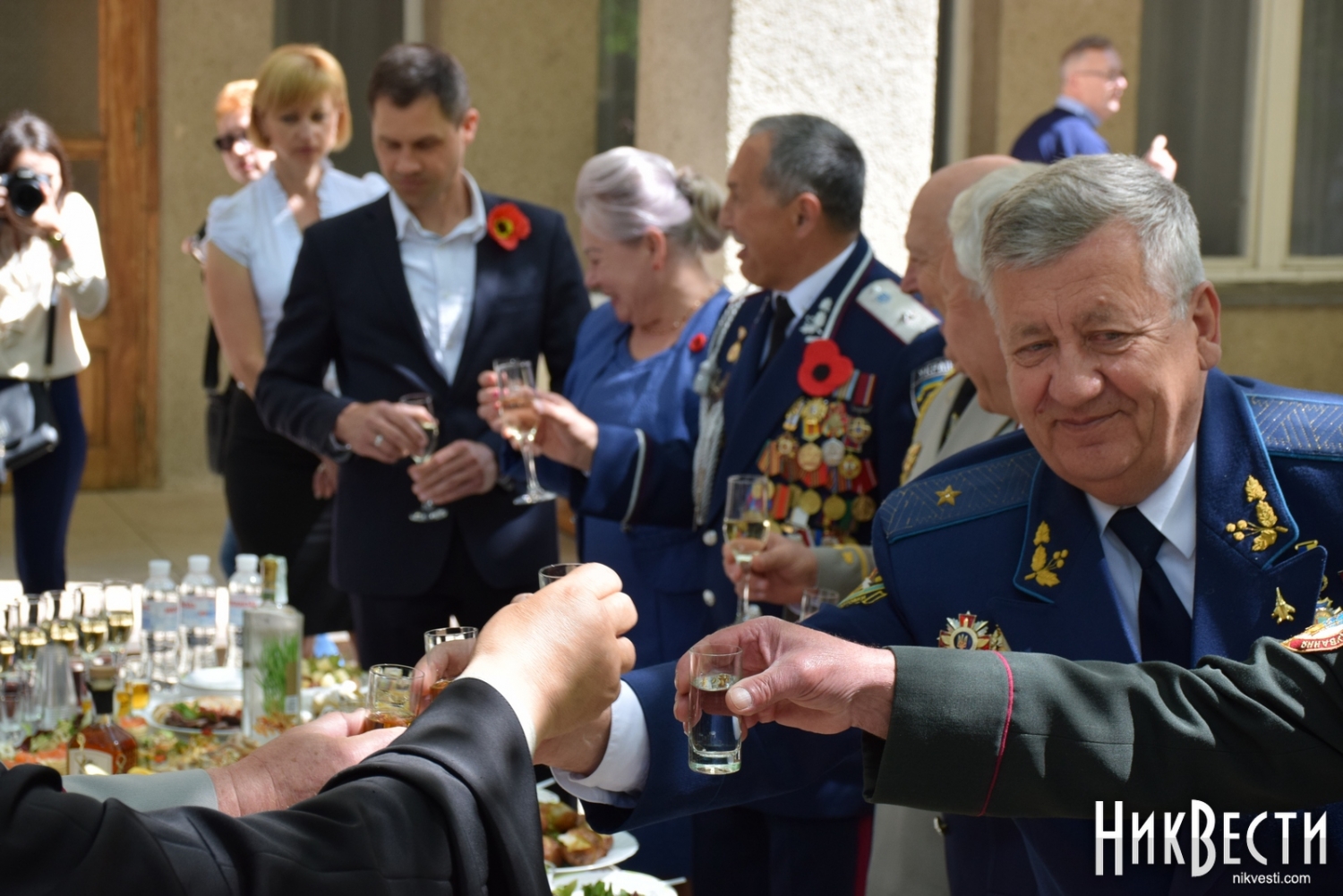 Ветераны пришли в мэрию, на задний дворик, где для них накрыли банкет. Мероприятие посетила глава Николаевского областного совета Виктория Москаленко, народный депутат Александр Жолобецкий, а также Митрополит Николаевский и Очаковский Питирим.