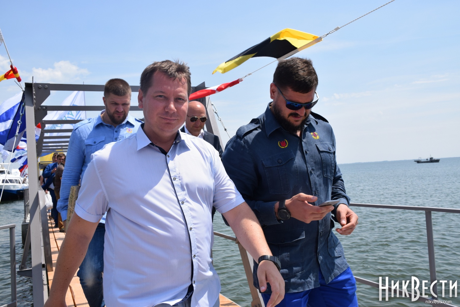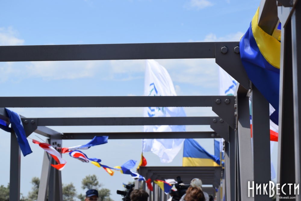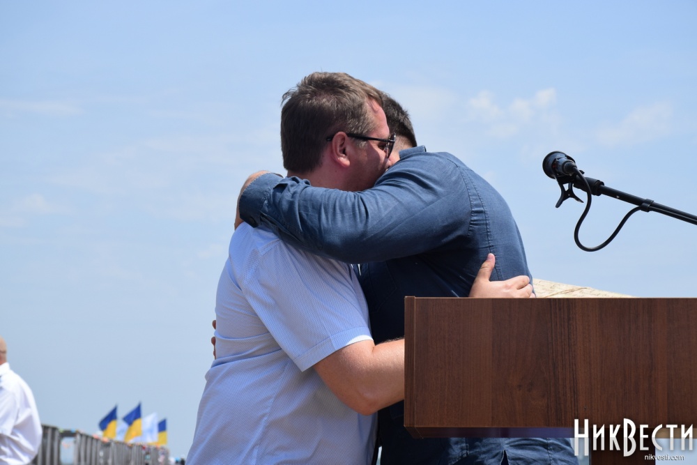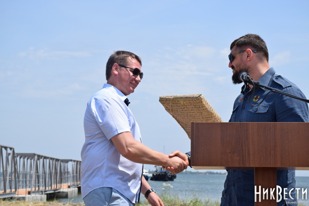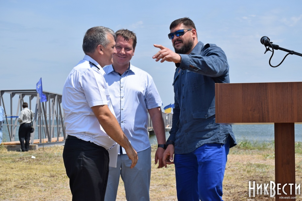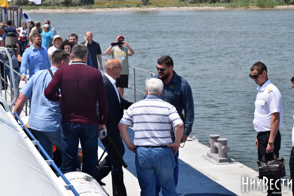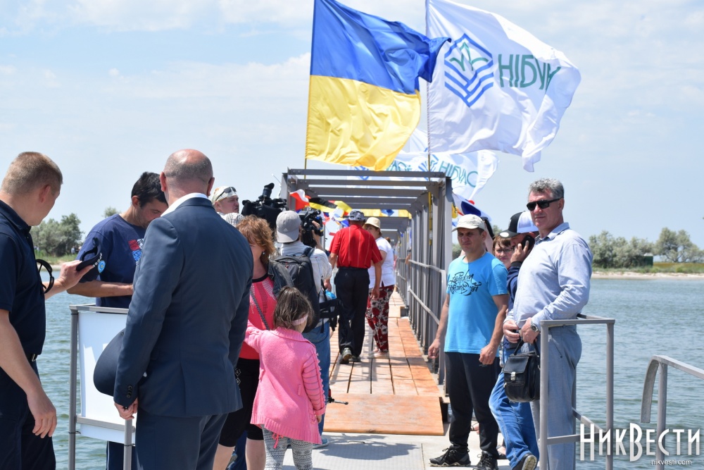 На Кинбурн одновременно прибыло сразу две «ракеты» - из Николаева и Херсона. Главу Херсонской области Андрея Гордеева на причале встретил председатель Николаевской областной государственной администрации Алексей Савченко. После встречи николаевская и херсонская делегации спустились на берег, где торжественно открыли причал.