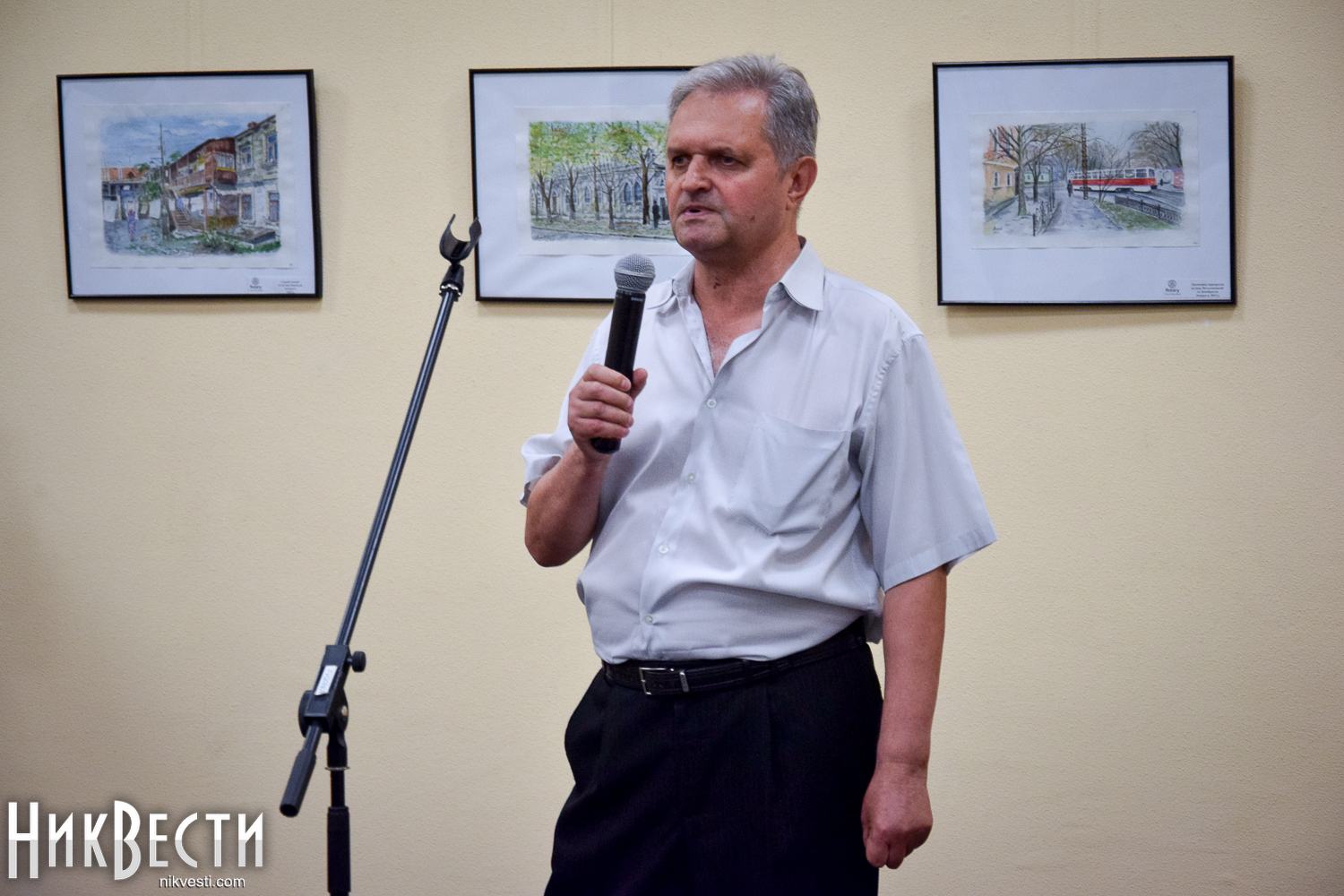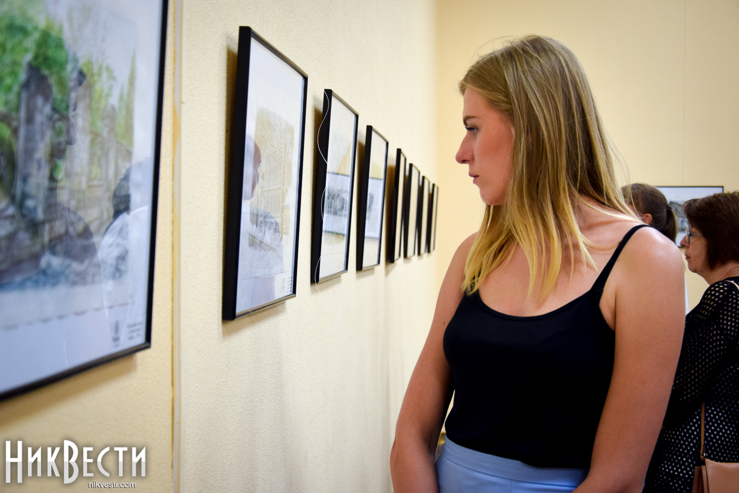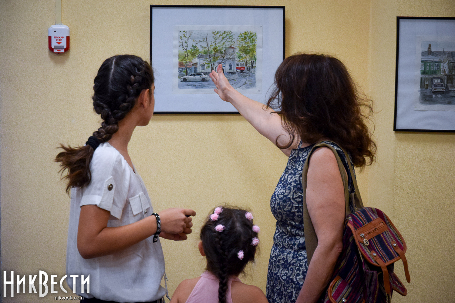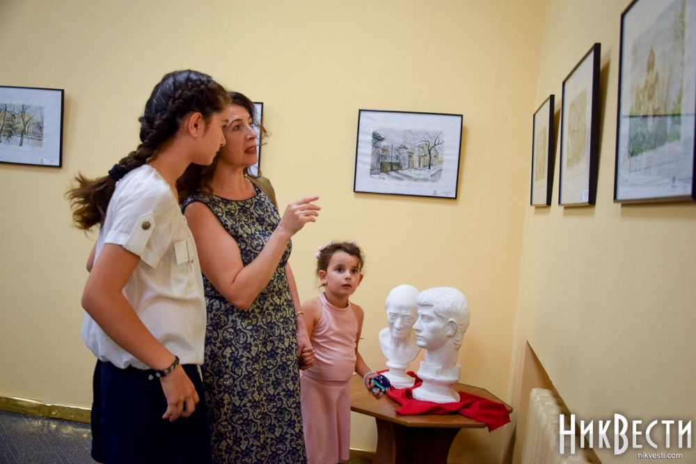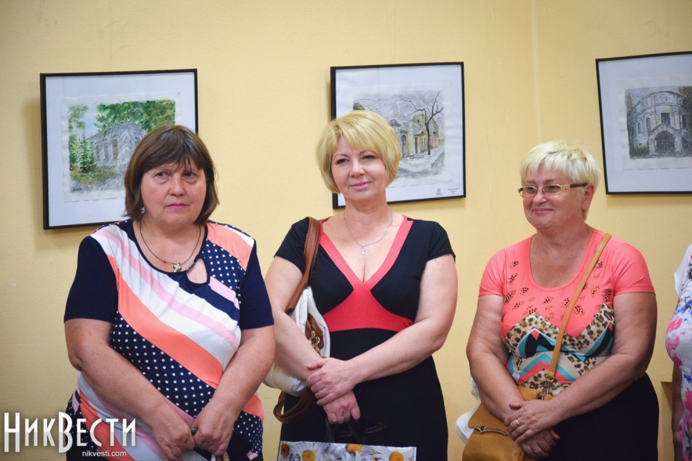 Как было сказано на открытии выставки, в работах художника можно увидеть заснеженные скверы Сухого фонтана, тенистые улочки Слободки и Потемкинской, золотые купола николаевских церквей, шумную толпу молодежи на Соборной. И всюду на картинах изображены здания с элементами старой архитектуры города.