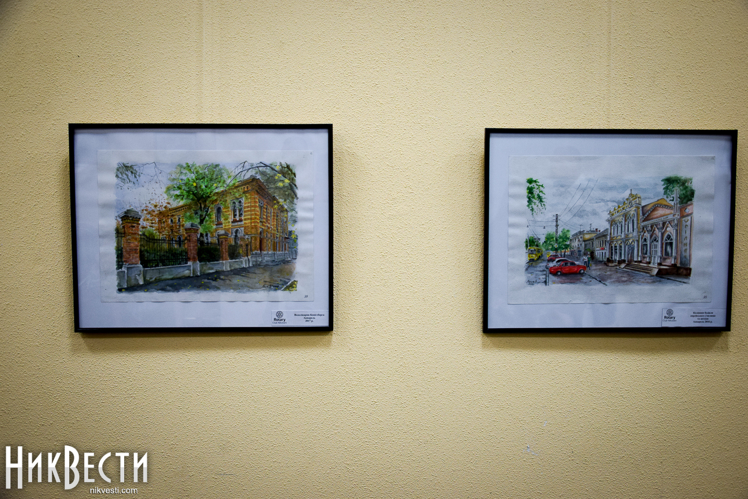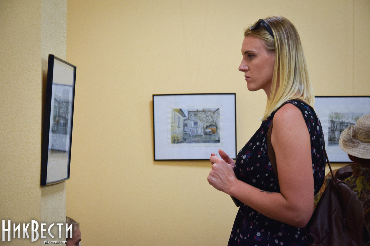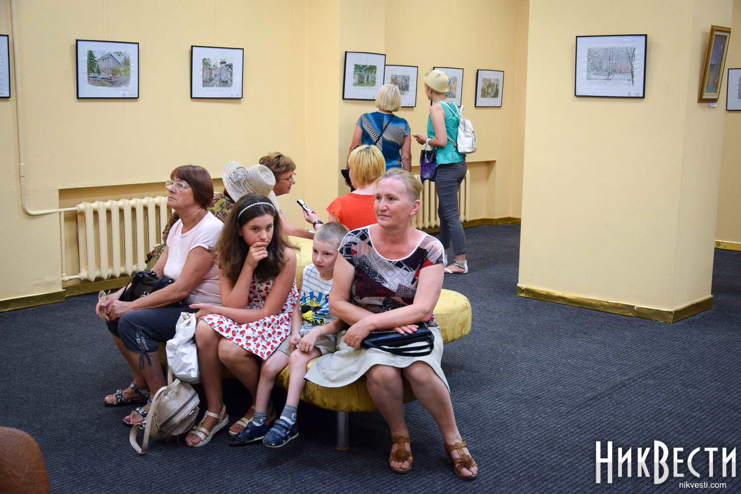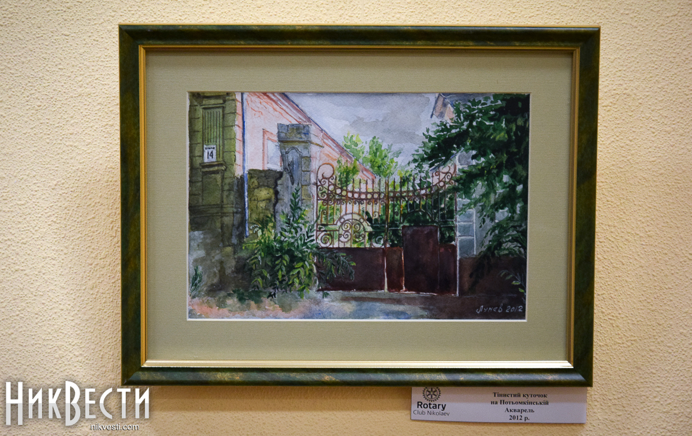 Как было сказано на открытии выставки, в работах художника можно увидеть заснеженные скверы Сухого фонтана, тенистые улочки Слободки и Потемкинской, золотые купола николаевских церквей, шумную толпу молодежи на Соборной. И всюду на картинах изображены здания с элементами старой архитектуры города.