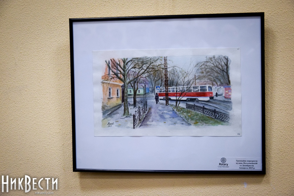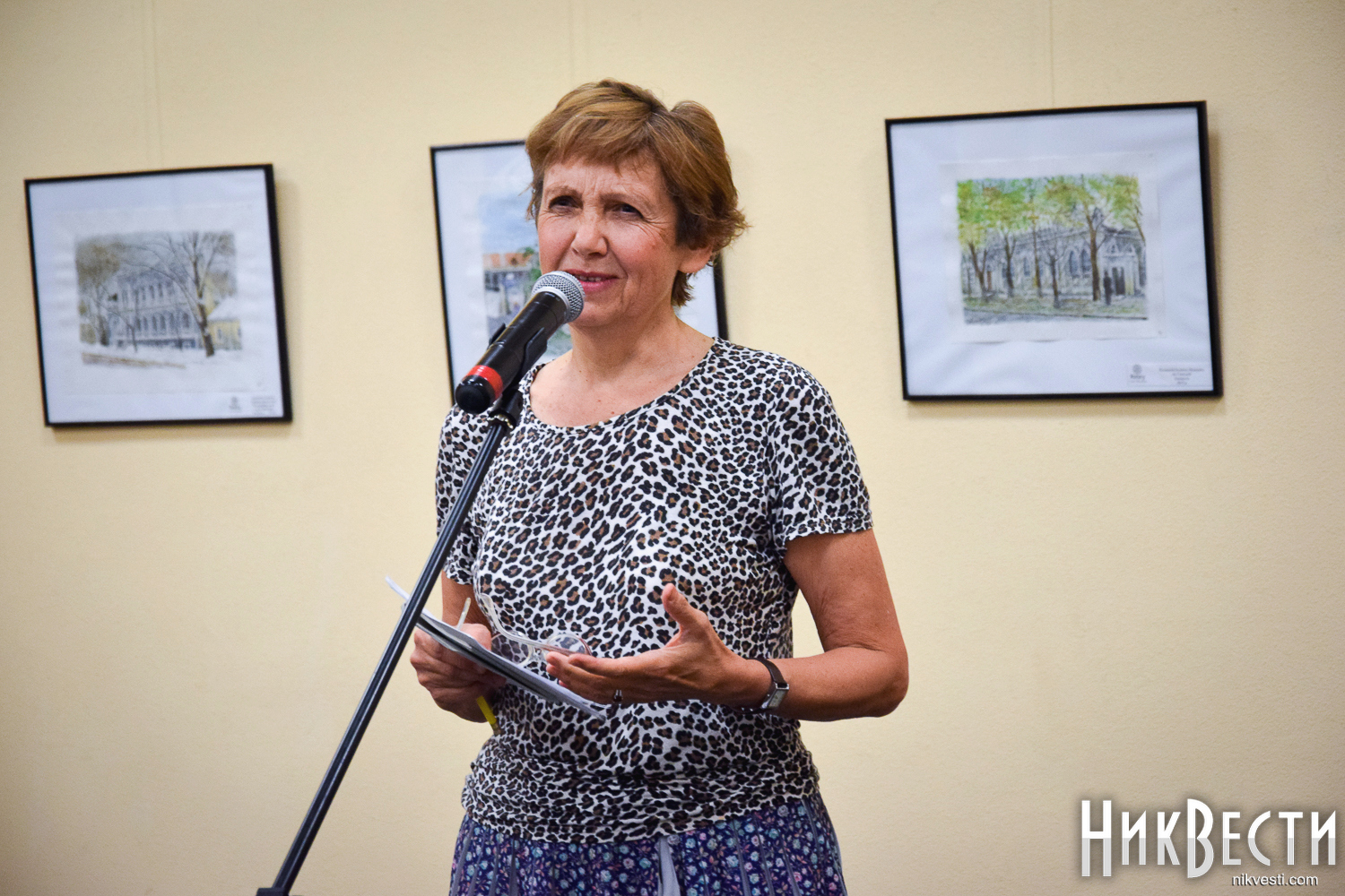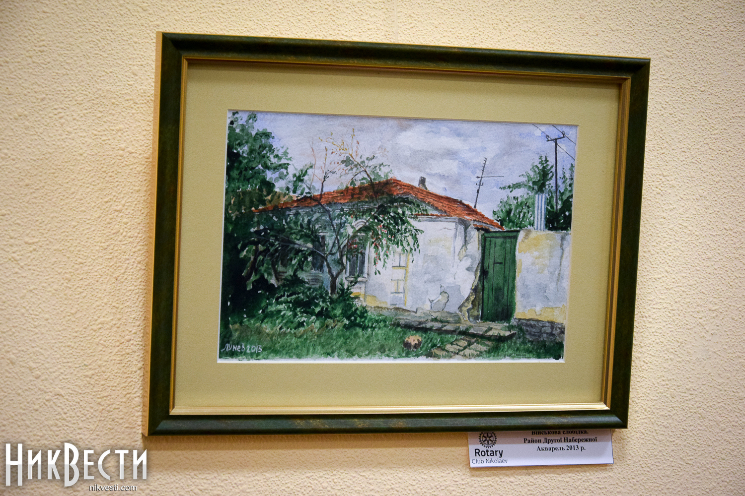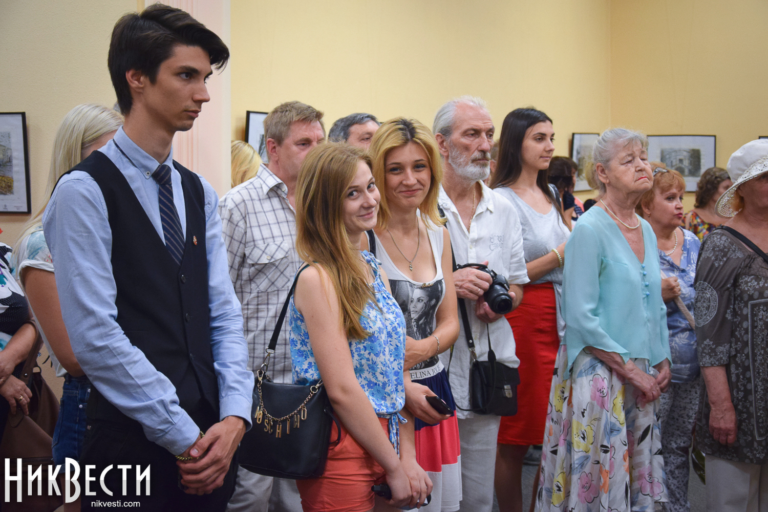 Как было сказано на открытии выставки, в работах художника можно увидеть заснеженные скверы Сухого фонтана, тенистые улочки Слободки и Потемкинской, золотые купола николаевских церквей, шумную толпу молодежи на Соборной. И всюду на картинах изображены здания с элементами старой архитектуры города.