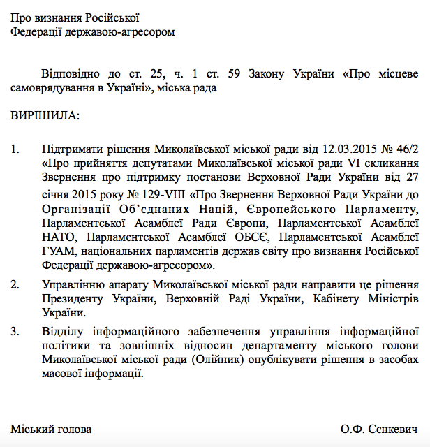 Напомним, в марте 2015 года Николаевский горсовет уже признал Россию агрессором.