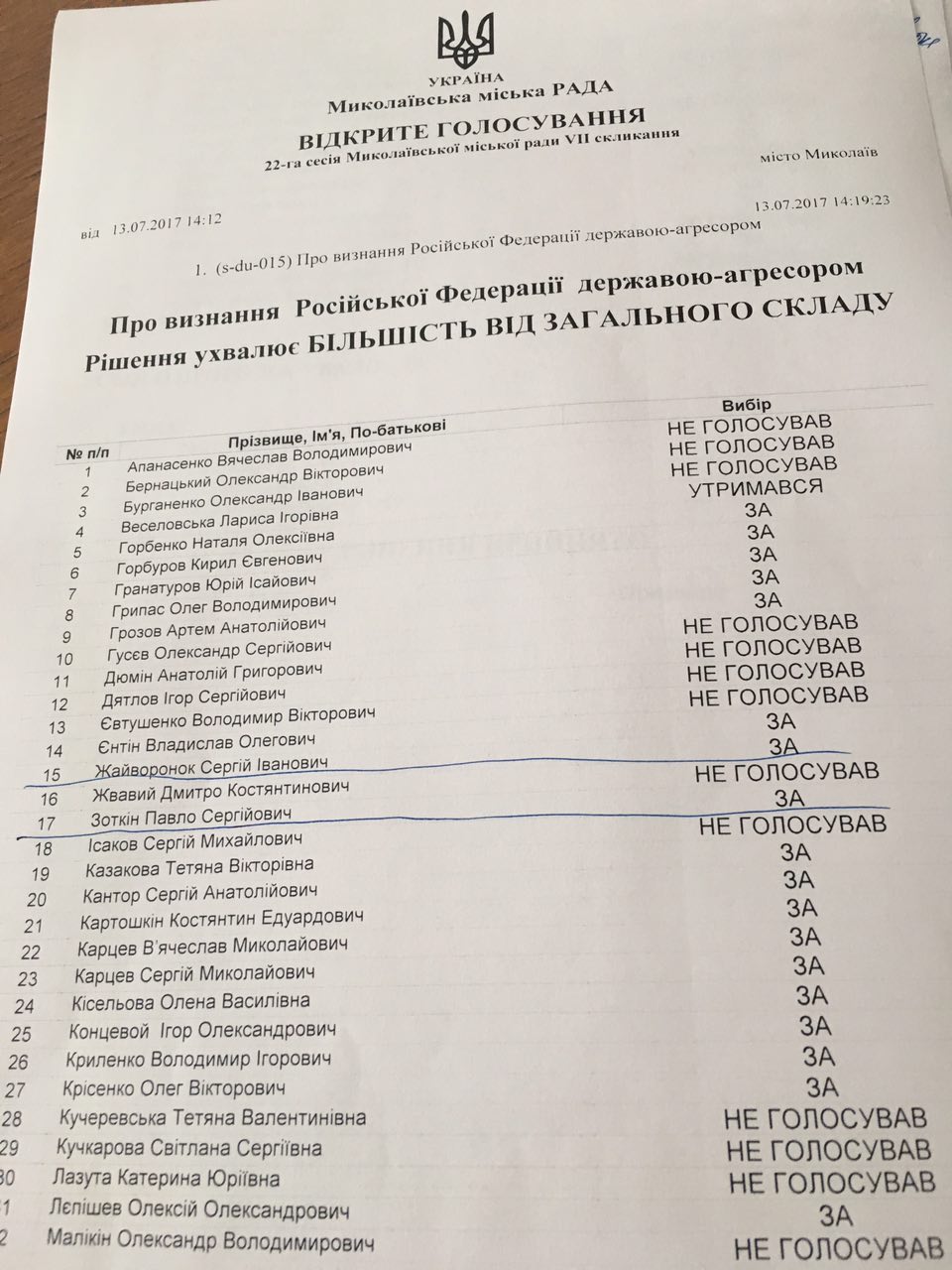 После продолжительных переговоров глав фракций с Николаевским городским головой Александр Сенкевич повторно поставил на голосование проект решения о признании Российской Федерации страной-агрессором, предложенный депутатом Сергеем Танасовым.