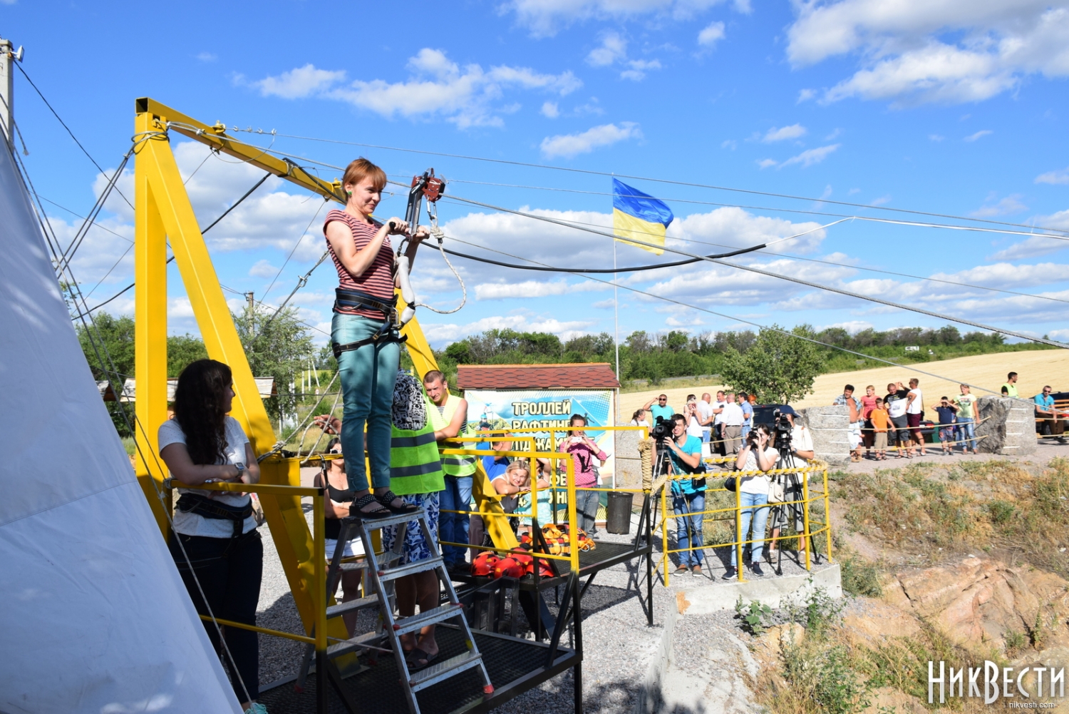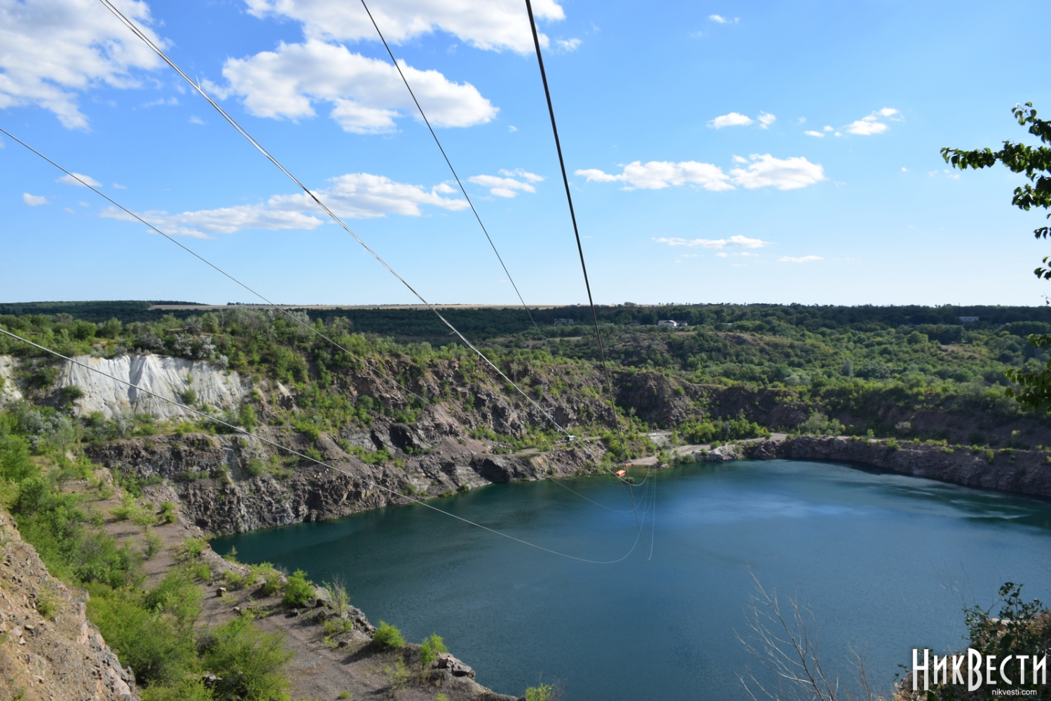 Представители власти вместе с журналистами прошлись по территории кэмпинга, постояли у каньона и даже устроили небольшой «обеденный перерыв» прямо на природе, у воды. После этого все желающие могли подняться на смотровую площадку, где туристы уже вовсю катались на троллее над Радоновым озером. Каждый, кто хотел опробовать новый туристический аттракцион, имел возможность это сделать. Сам троллей считается самым высоким и самым быстрым в Украине – высота каната над водой составляет 72 метра, человек на нем развивает скорость до 110 километров в час. Длинна каната – 457 метров. Начальник управления по вопросам молодежи и туризма Александр Максименко рассказал о новом развлечении для туристов подробнее.