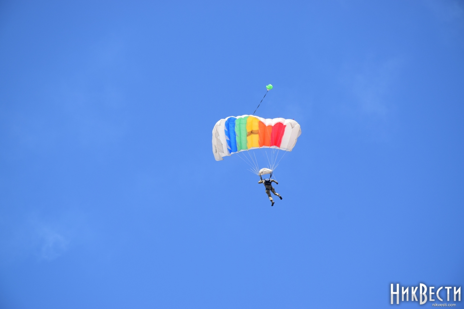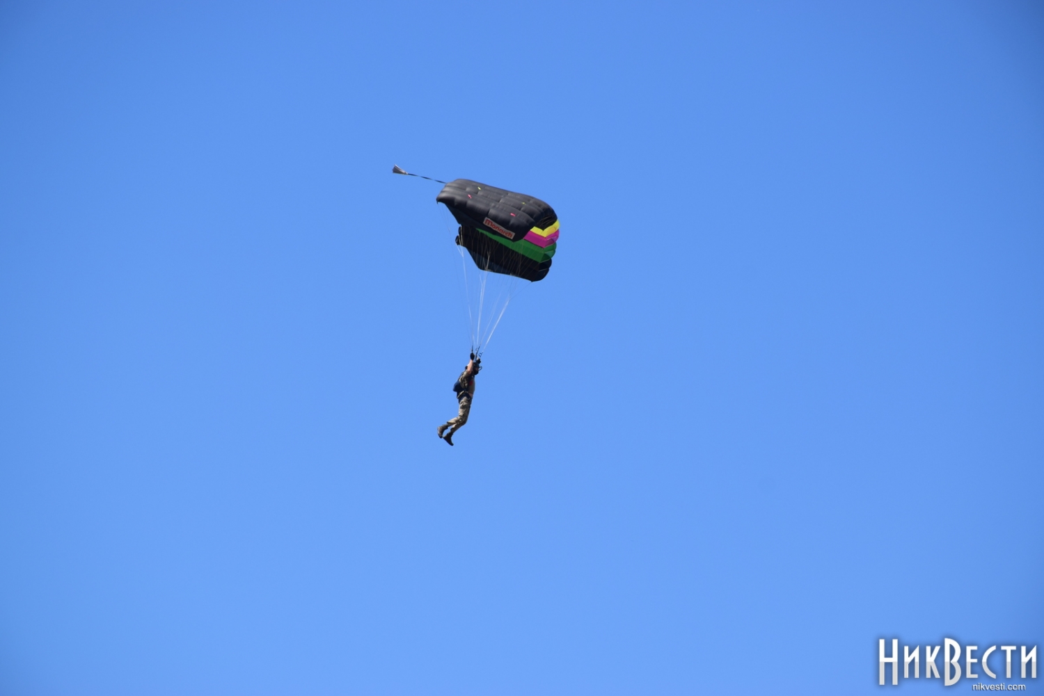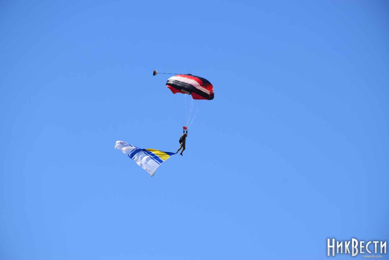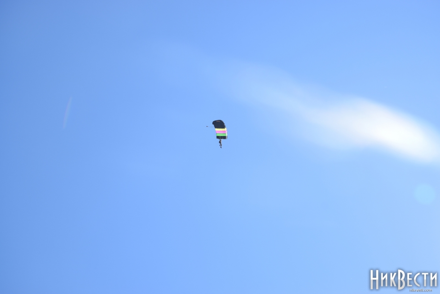 За службу народу морпехов также поблагодарила глава Николаевского областного совета Виктория Москаленко, отметив и тех, кто ждет воинов дома. После поздравительных речей неожиданно для всех с неба начали спускаться парашютисты. Таким образом, морские пехотинцы на деле показали свое мастерство, которое никого из присутствующих не оставило равнодушным.