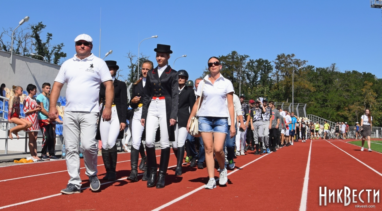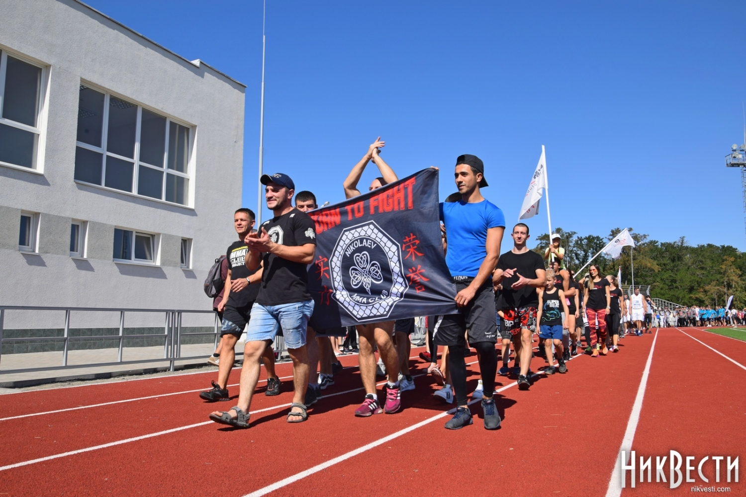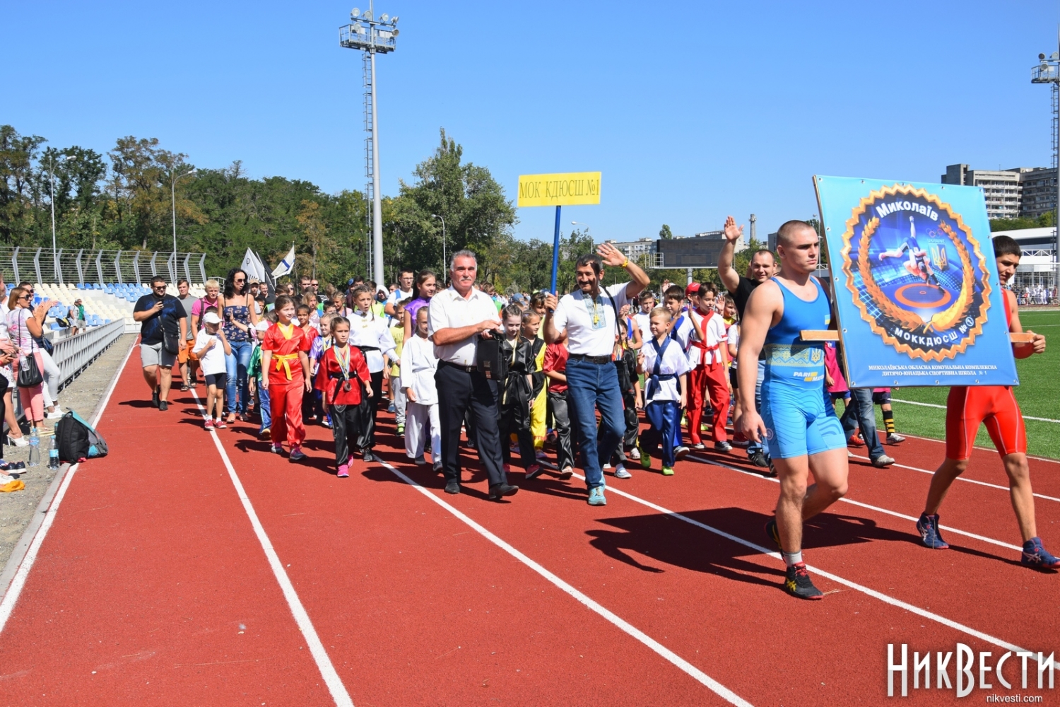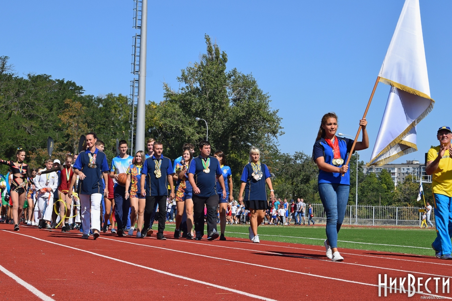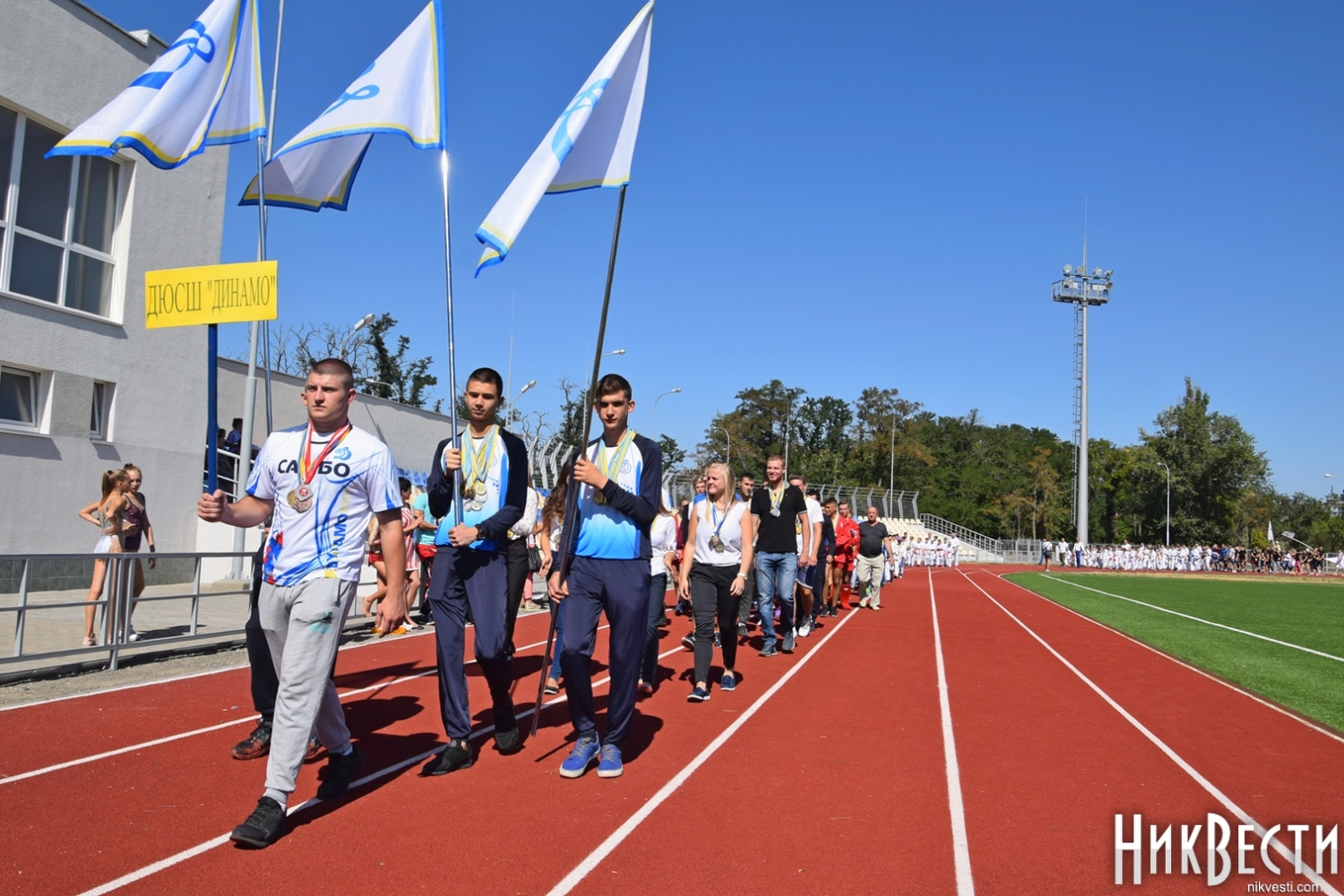 Торжественное открытие стадиона началось с парада всех николаевских спортивных школ, федераций и клубов. Гимнасты, футболисты, баскетболисты, борцы, велосипедисты, фехтовальщики, шахматисты и многие другие прошлись по реконструированному стадиону, тем самым показав громадный спортивный потенциал города и области. Своих спортсменов представили МОК КДЮСШ №1, МО ШВСМ, ОСДЮШОР областной яхт-клуб, ДЮСШ «Динамо», Николаевская федерация шахмат, Николаевский клуб MMA, спортивно-танцевальный клуб Slice, паралимпийские спортсмены, а также федерация киокушин карате.