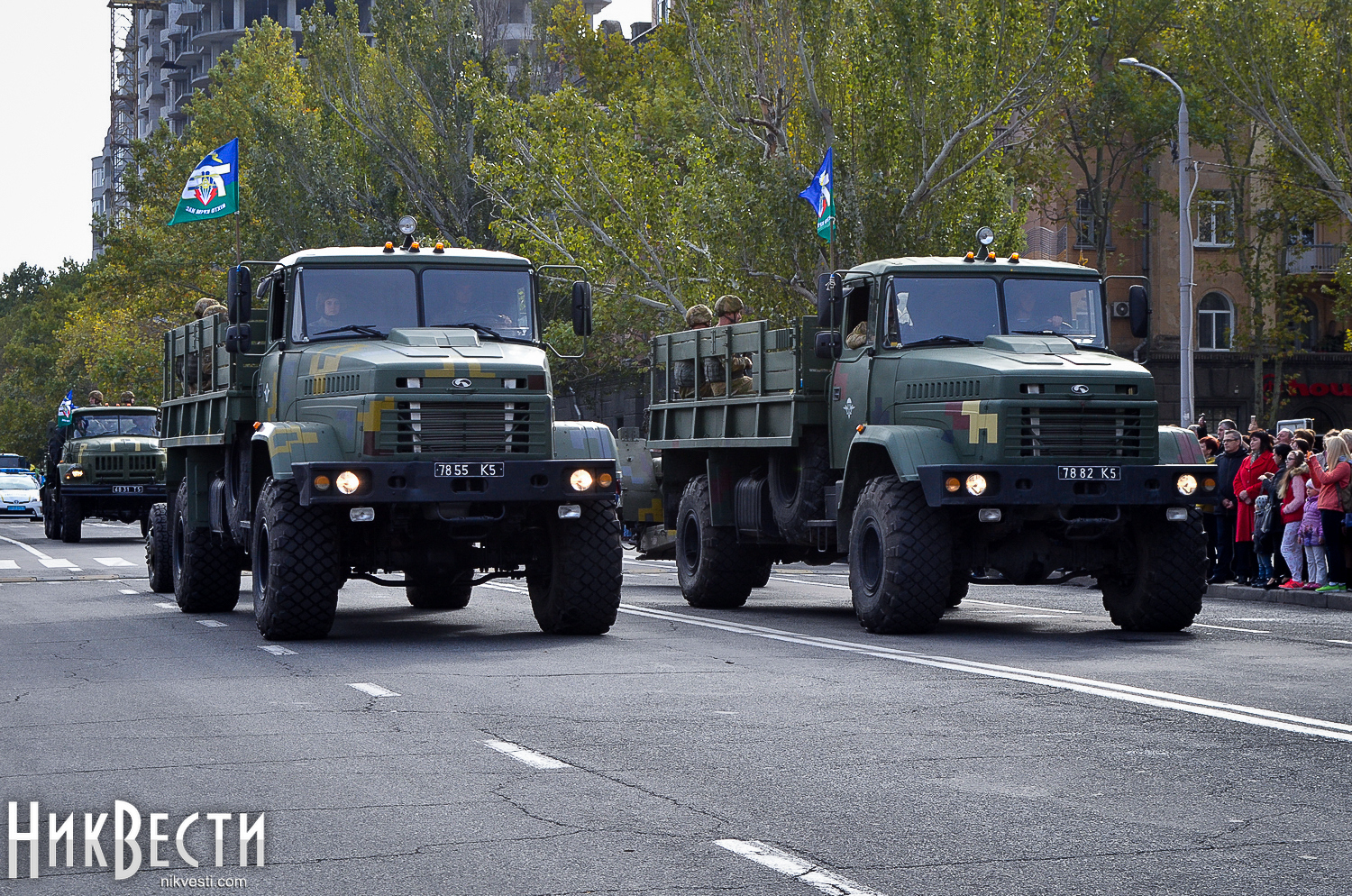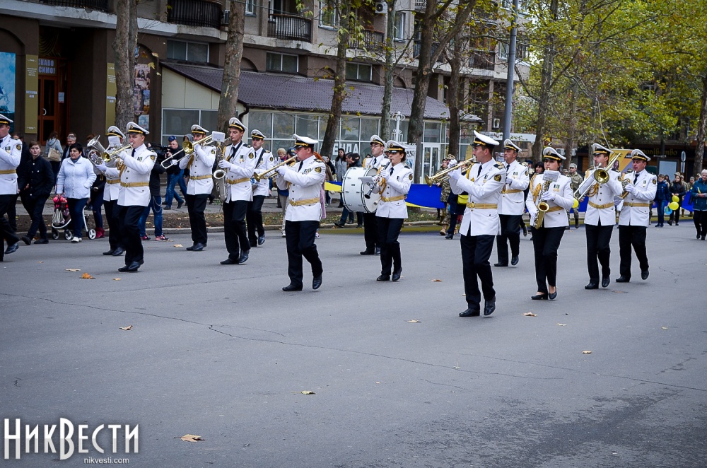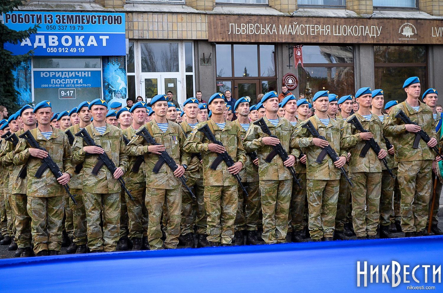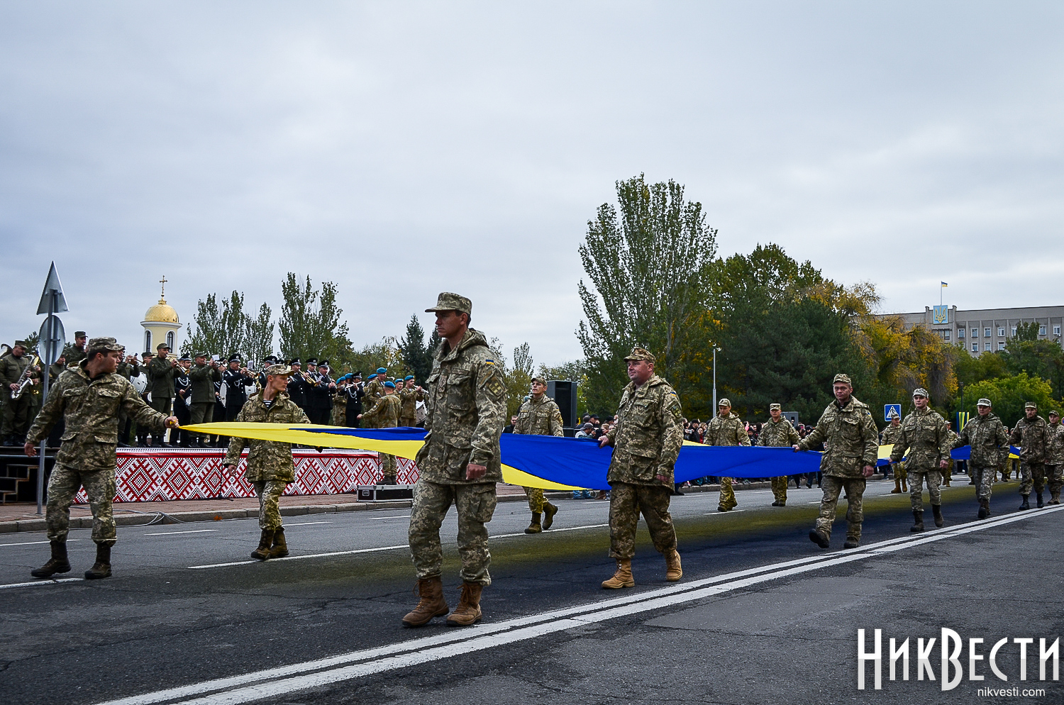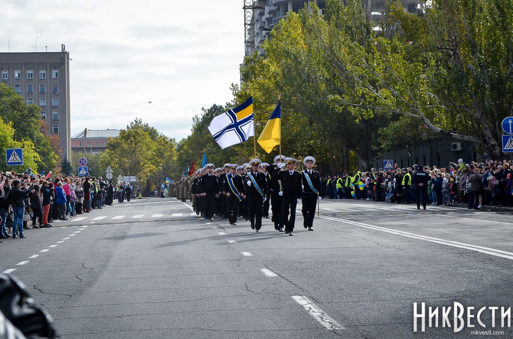 Утром Соборной площадью прошагали колонны личного состава Николаевского гарнизона, Нацгвардии, Нацполиции, Государственной службы по чрезвычайным ситуациям, в том числе, военнослужащие ВМС Вооруженных Сил Украины, высокомобильные Десантные Войска ВСУ и представители Николаевского военного госпиталя. После официальной части мероприятия центром города проехала боевая техника.