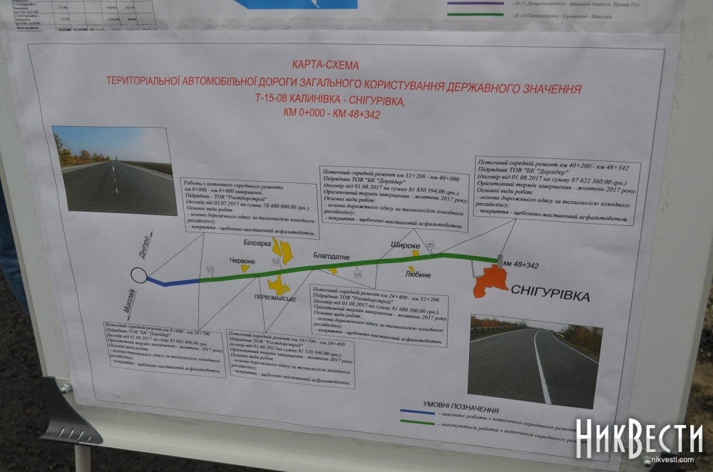 Перед этим глава Николаевской облгосадминистрации Алексей Савченко, докладывая премьер-министру Украины Владимиру Гройсману о ходе ремонтных работ на дорогах области, объявил, что эту трассу отремонтируют до 20 октября.