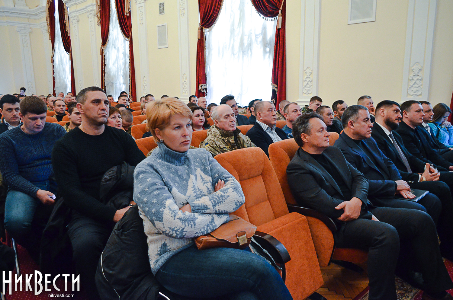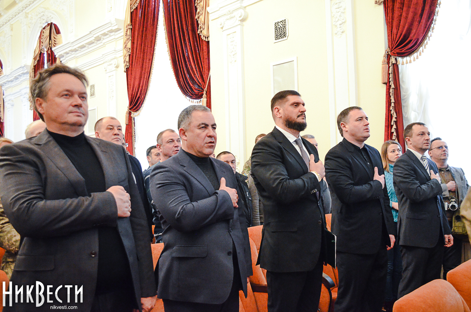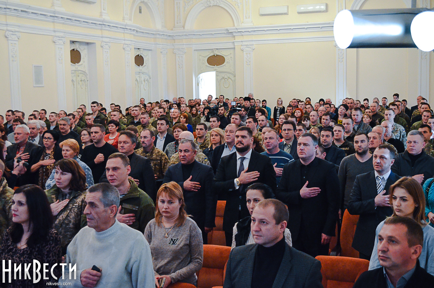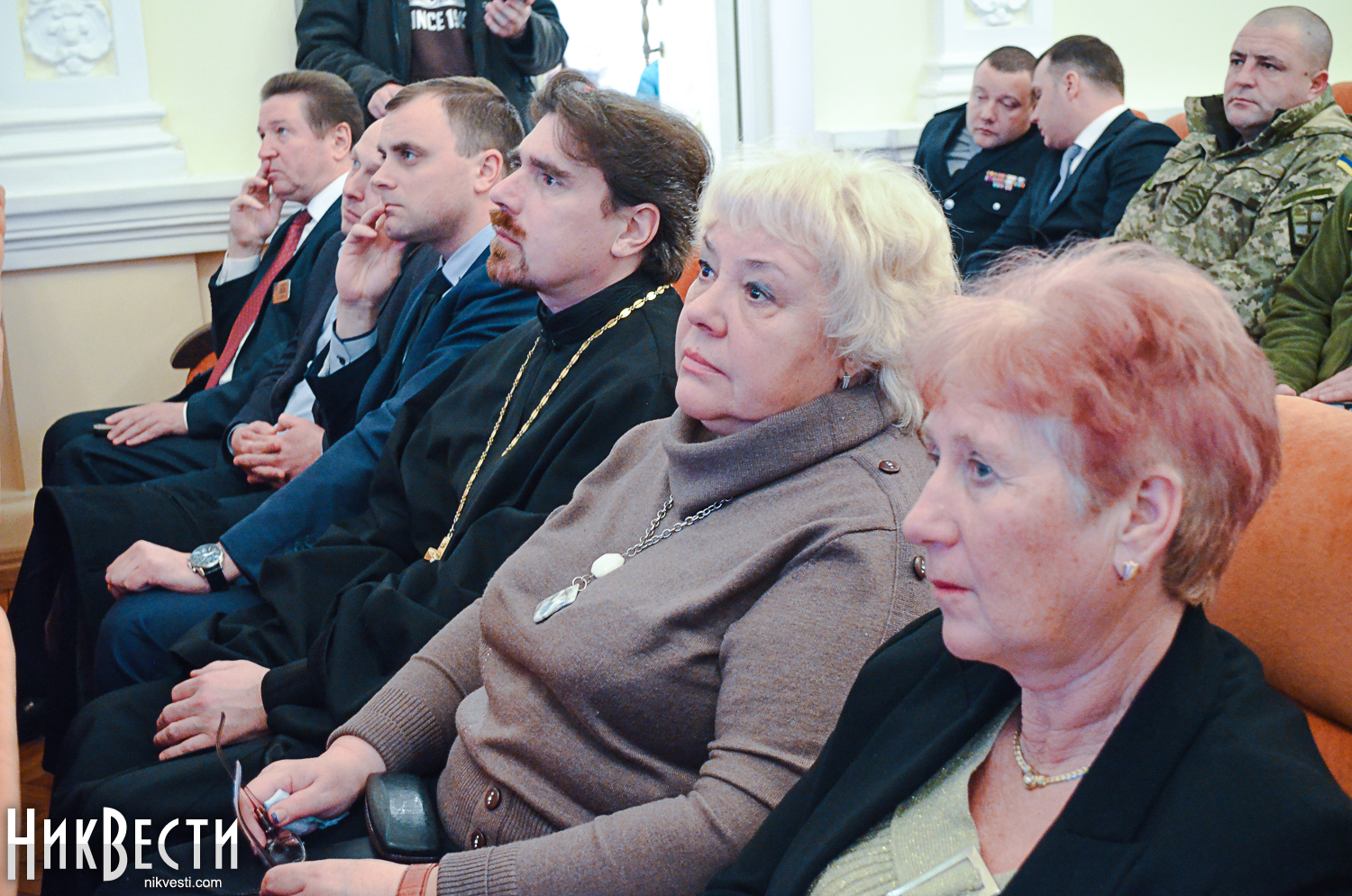 Среди гостей мероприятия - председатель Николаевской облгосадминистрации Алексей Савченко, руководитель аппарата ОГА Юрий Гранатуров, советник председателя ОГА Евгений Шевченко, заместитель городского головы Николаева Юрий Степанец, народные депутаты Украины Тарас Креминь, Игорь Бриченко, экс-начальник Главного управления Национальной полиции в Николаевской области Виталий Гончаров, члены семей погибших воинов, волонтеры, участники АТО, студенты, общественные деятели.