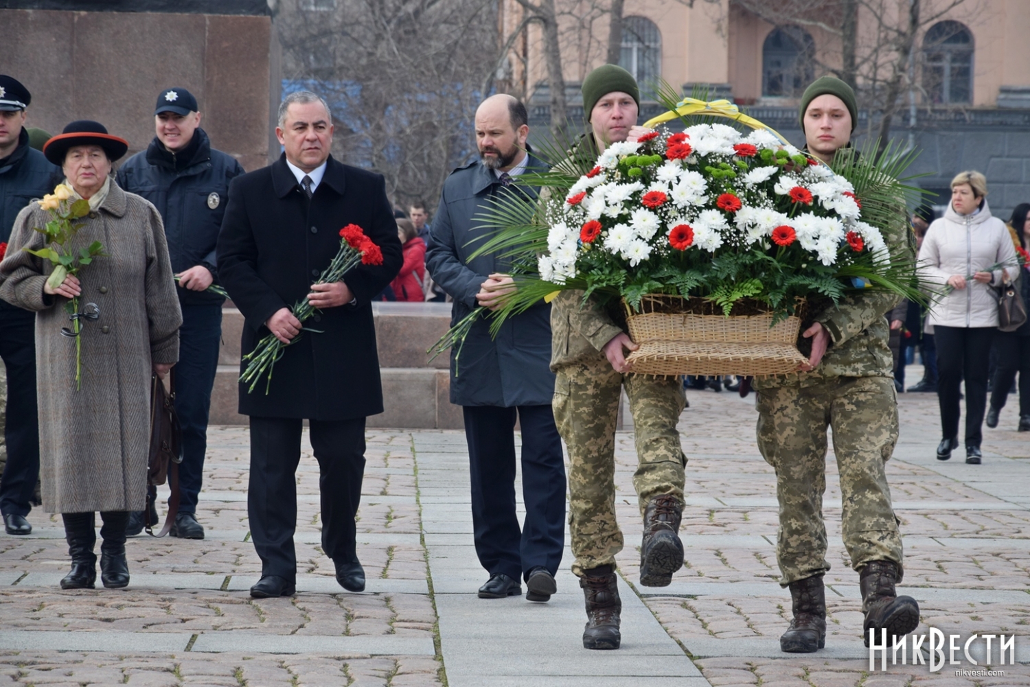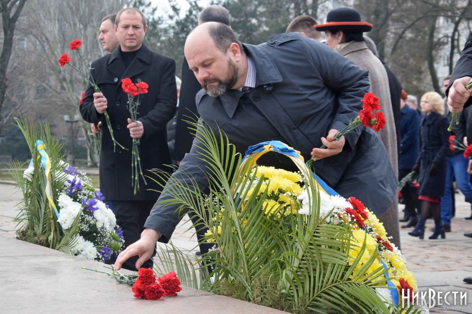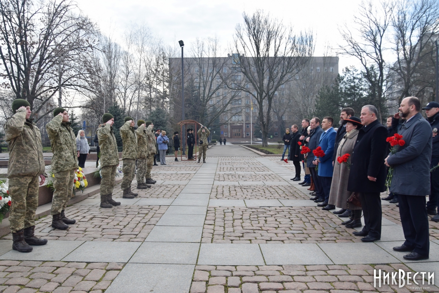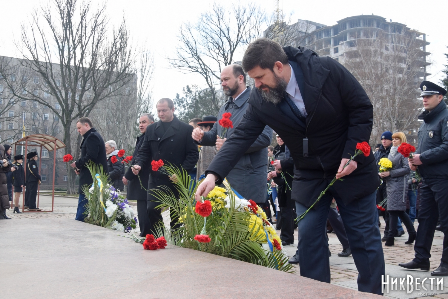 На церемонии возложения присутствовали первый заместитель председателя Николаевской облгосадминистрации Вячеслав Бонь, руководитель аппарата облгосадминистрации Юрий Гранатуров, советник главы области Евгений Шевченко, заместители главы Николаевского облсовета Иван Кухта и Андрей Кротов, первый заместитель Николаевского городского головы Владимир Крыленко, вице-мэры Юрий Степанец и Александр Омельчук, а также депутаты областного и городского совета и жители города.