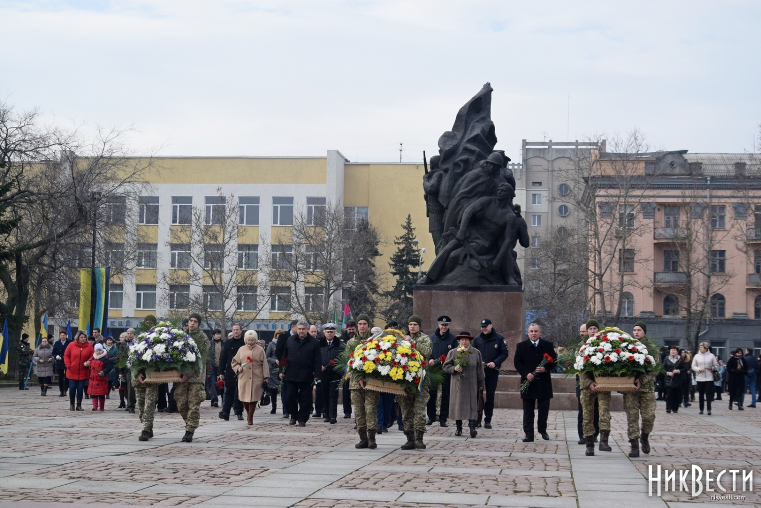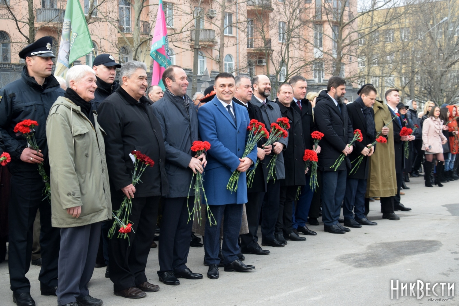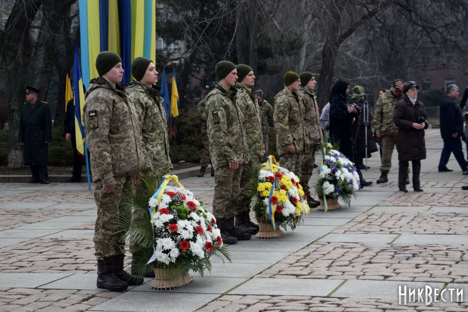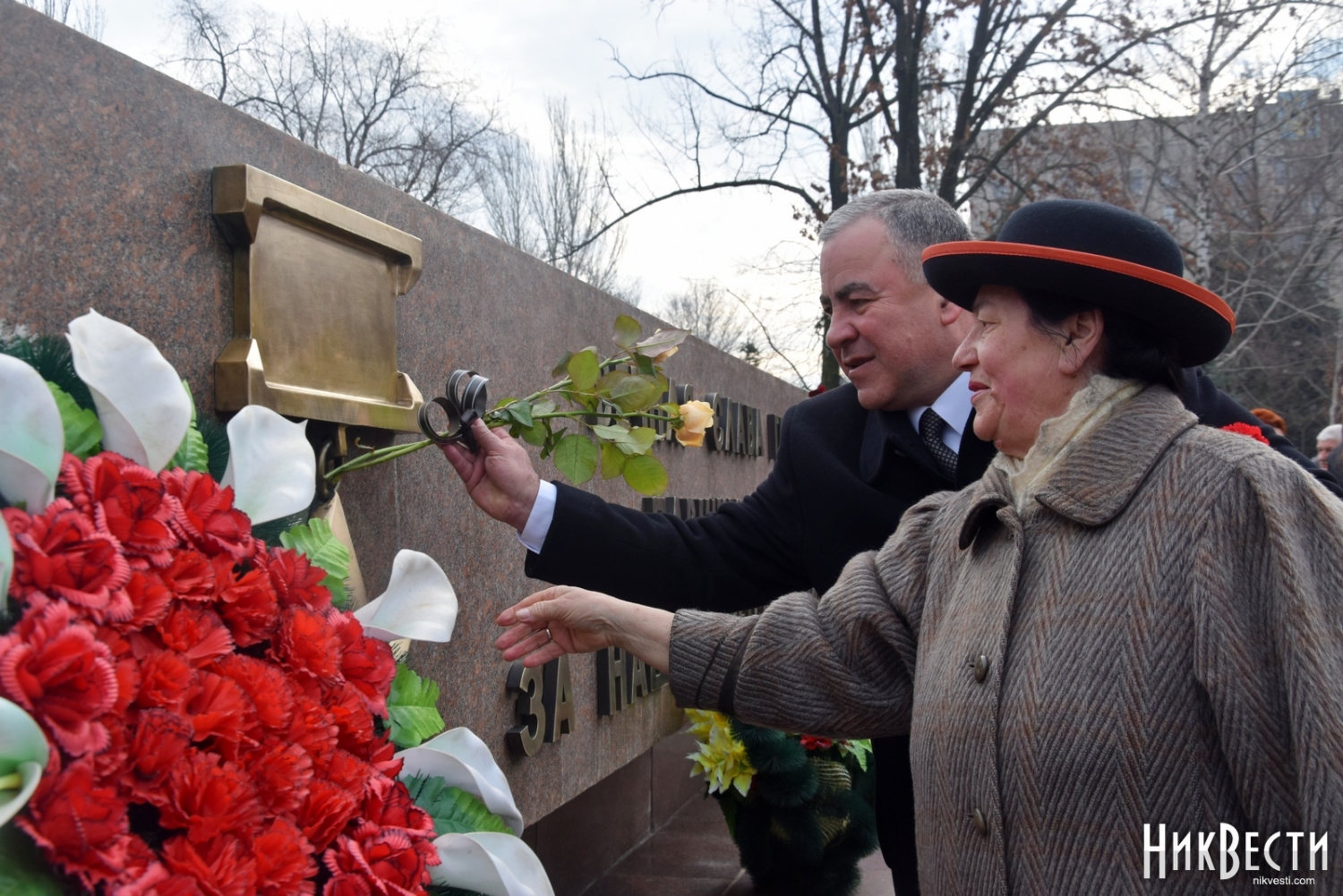 На церемонии возложения присутствовали первый заместитель председателя Николаевской облгосадминистрации Вячеслав Бонь, руководитель аппарата облгосадминистрации Юрий Гранатуров, советник главы области Евгений Шевченко, заместители главы Николаевского облсовета Иван Кухта и Андрей Кротов, первый заместитель Николаевского городского головы Владимир Крыленко, вице-мэры Юрий Степанец и Александр Омельчук, а также депутаты областного и городского совета и жители города.