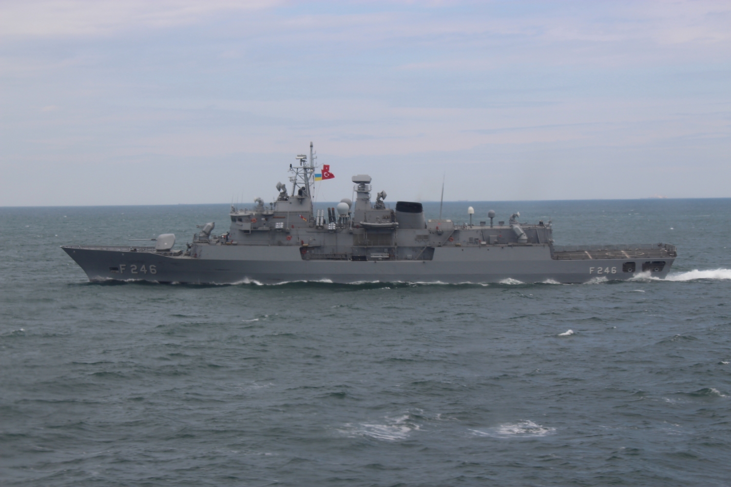 К тренировке от Украины были привлечены фрегат "Гетьман Сагайдачный" и вертолет Ка-27пр, а от турецкой - корвет TCG "Buyukada" (F-152) и фрегат TCG "Salihreis" (F-246).