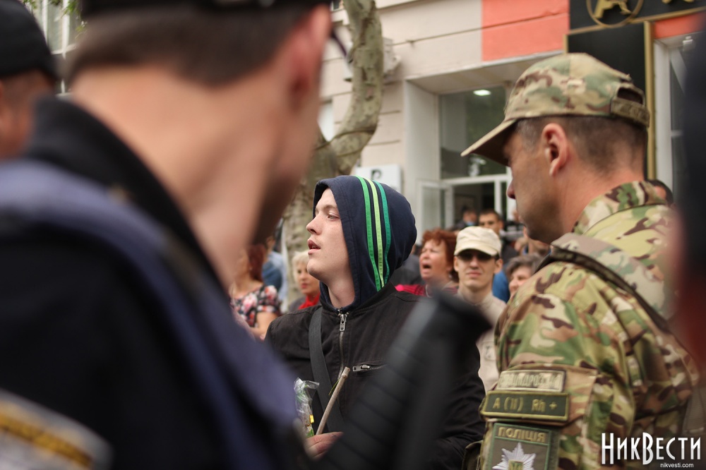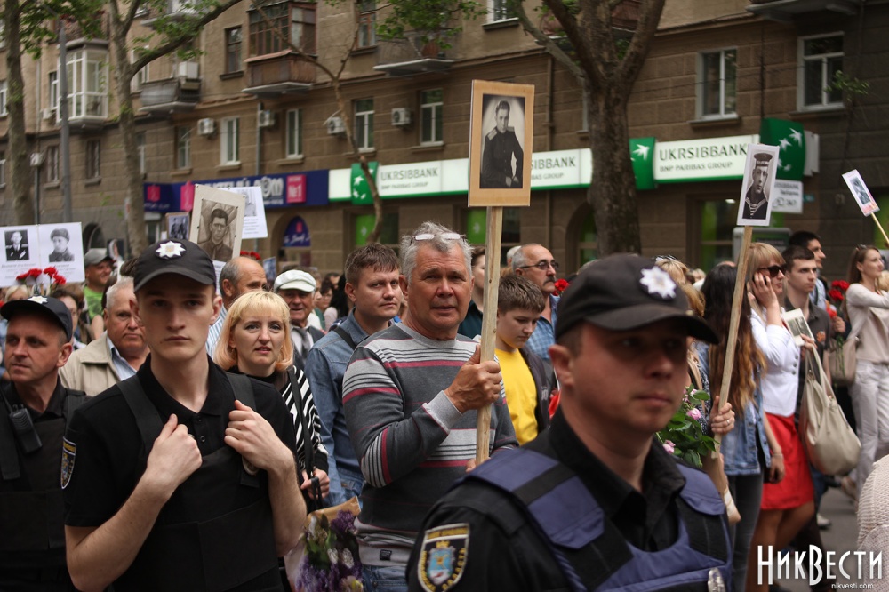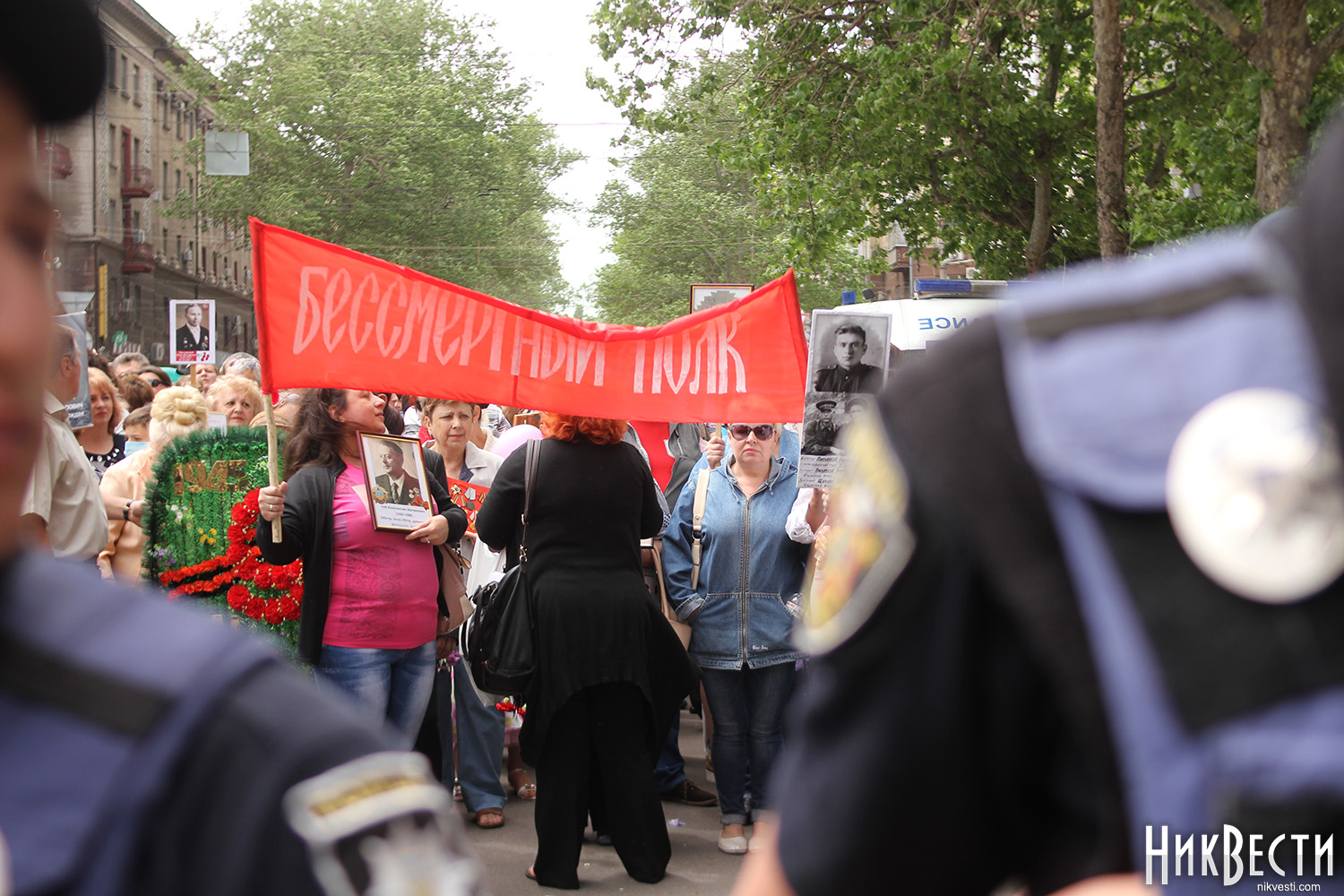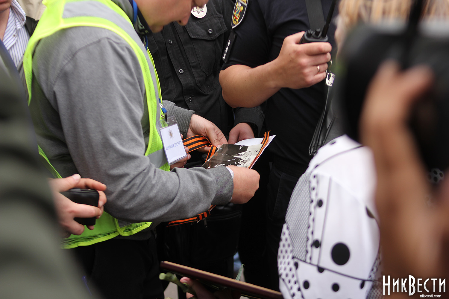 В 11:30 на пересечении улиц Соборной и проспекта Центрального в Николаеве начала формироваться колонна из участников акции «Бессмертный полк». Несколько граждан пронесли на акцию запрещенную символику в виде «георгиевских лент», которую сотрудники полиции пытались отобрать, из-за чего между участниками акции и правоохранителями вспыхнул конфликт.