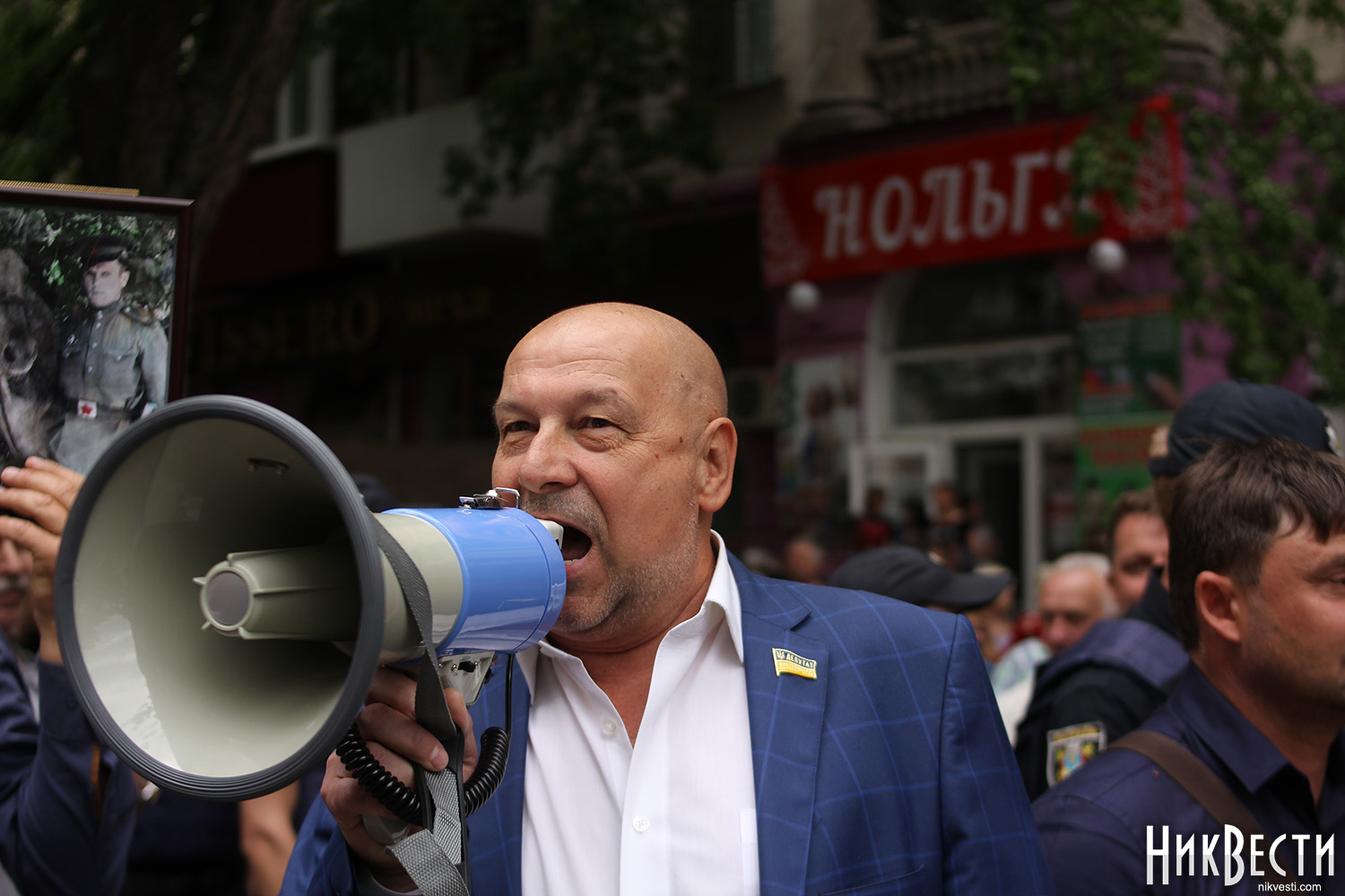 Участие в шествии также приняли депутаты Николаевского областного совета от фракции «Оппозиционный блок» Николай Кравченко и Владимир Фроленко, которых после окончания акции представители националистических организаций облили кефиром. Обливших кефиром «задержали» активисты из организации «Бугский гард». Задержали двух человек в камуфляже. Одним из задержанных является Владимир Губский – представитель партии «Свобода».