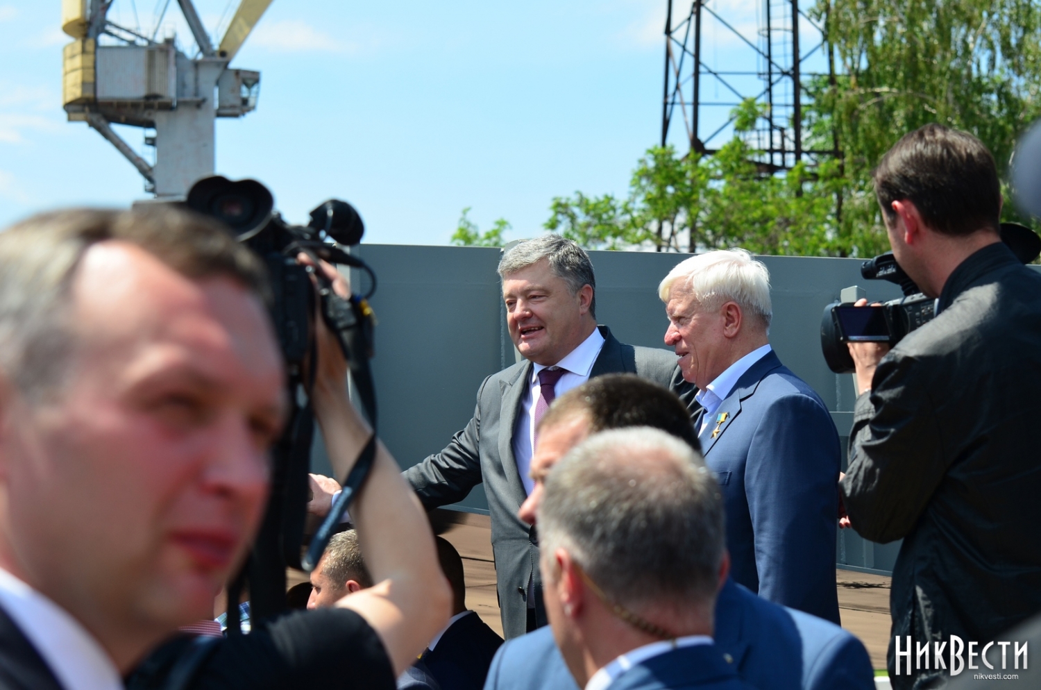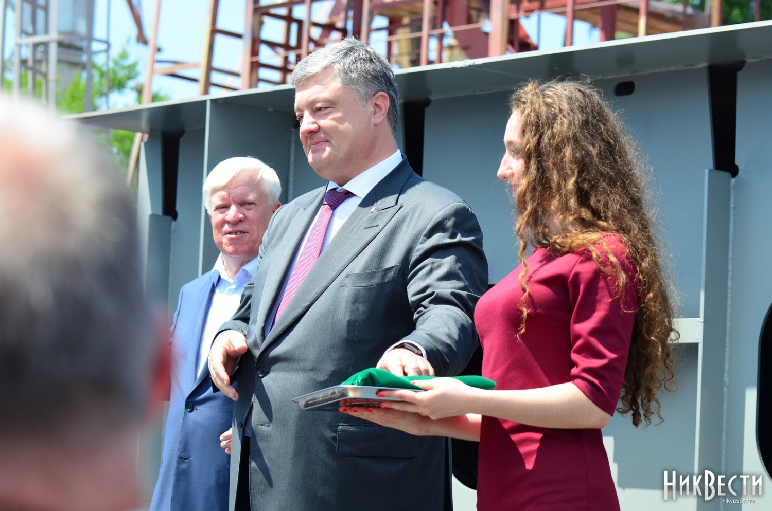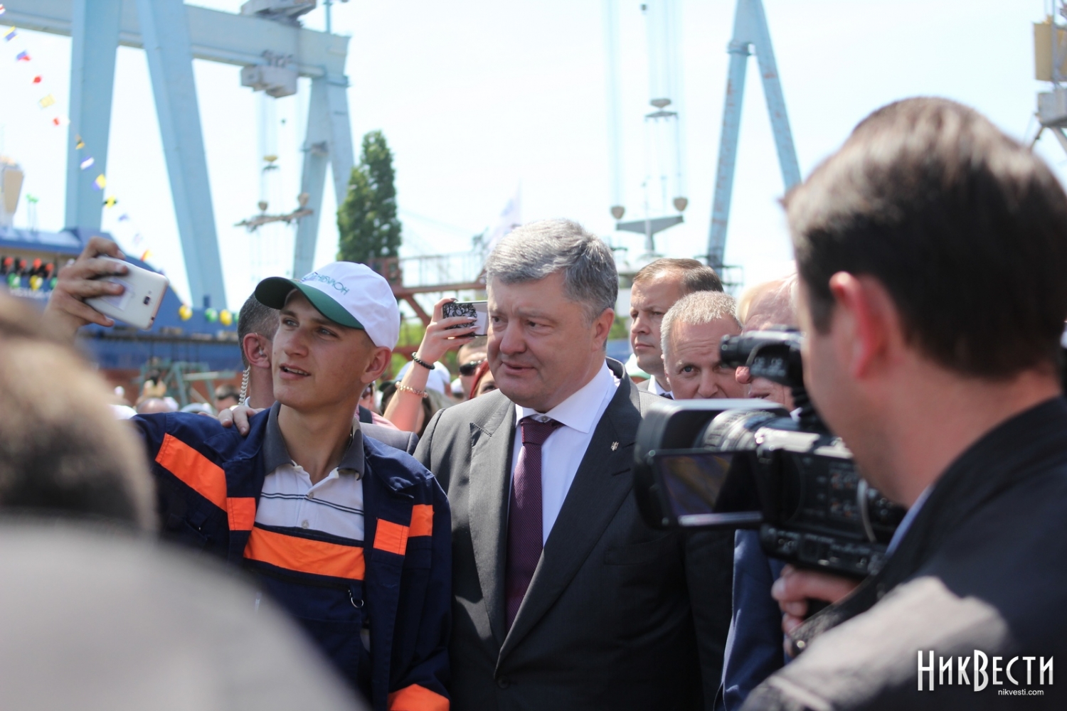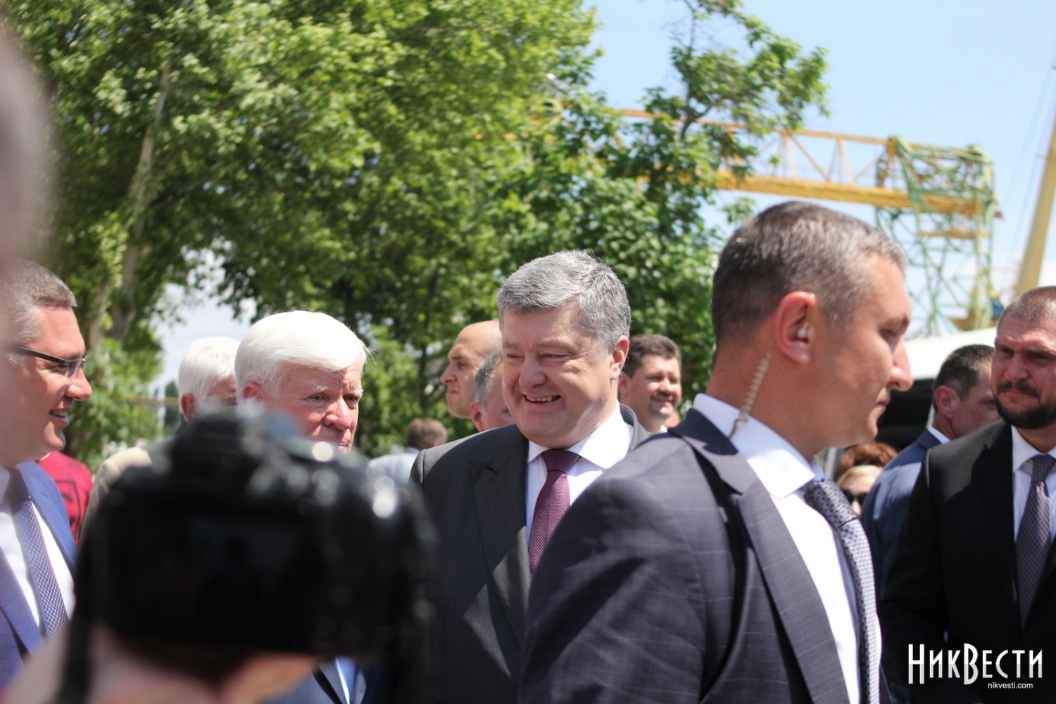 Также Петр Порошенко принял участие в торжественной закладке первого 140-метрового самоходного перегружателя проекта П-140. Кроме этого, Президент заложил линейный буксир проекта POSS-115, закладка которого тоже состоялась на заводе. Буксир предназначен для перевозки грузов по реке Днепр и караванами по 2 единицы несамоходных судов грузовместимостью 5 тысяч и 2 тысячи тонн. В общем, Президент и гости предприятия могли подняться на самоходное сверхмощное дноуглубительное судно «Николаевец», оценить масштаб 100-метрового несамоходного судна проекта В5000, способного снять с украинских дорог более 200 грузовиков за один рейс, а также прогуляться на высокоскоростных пассажирских судах «НИБУЛОН Экспресс».