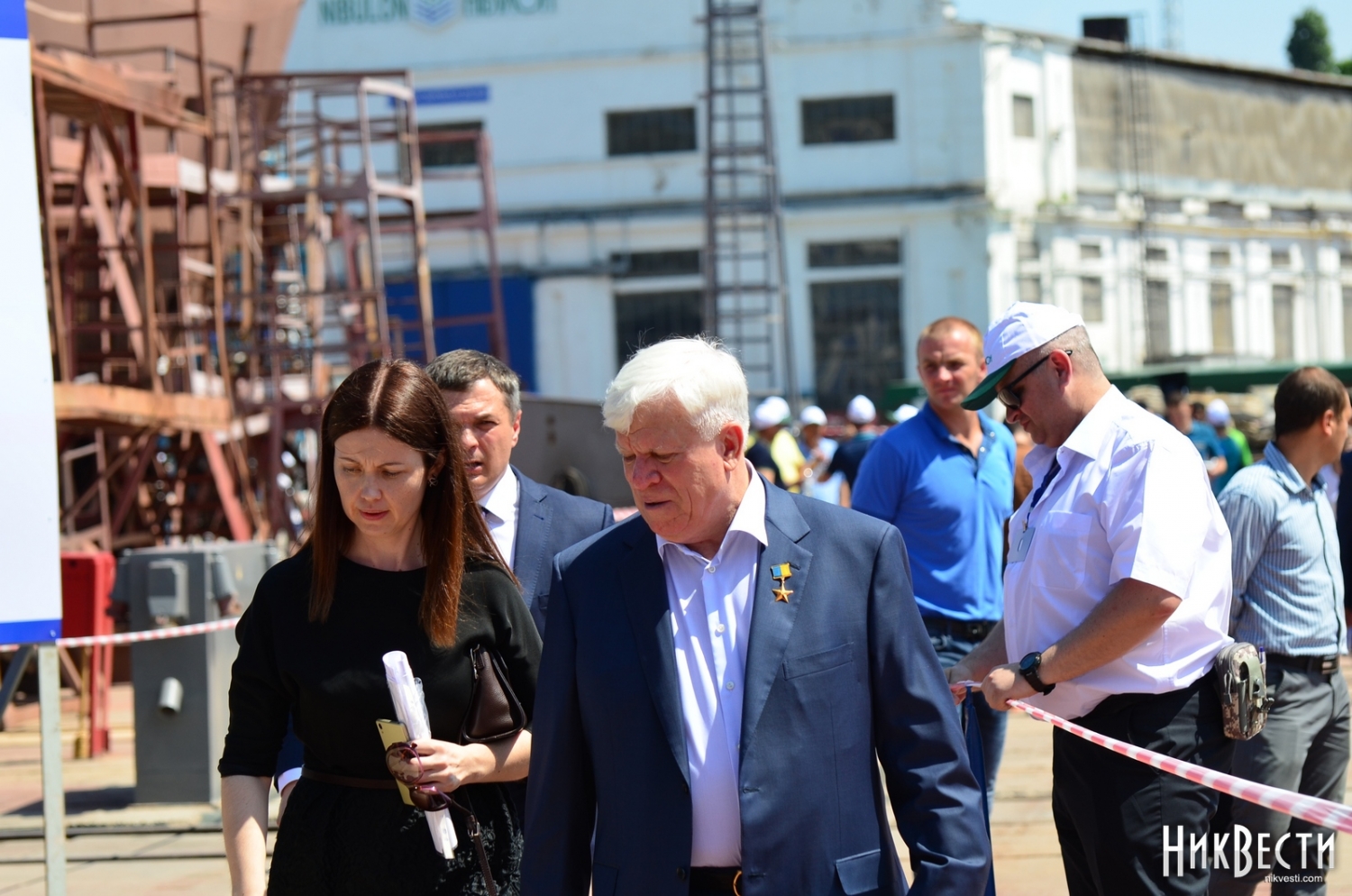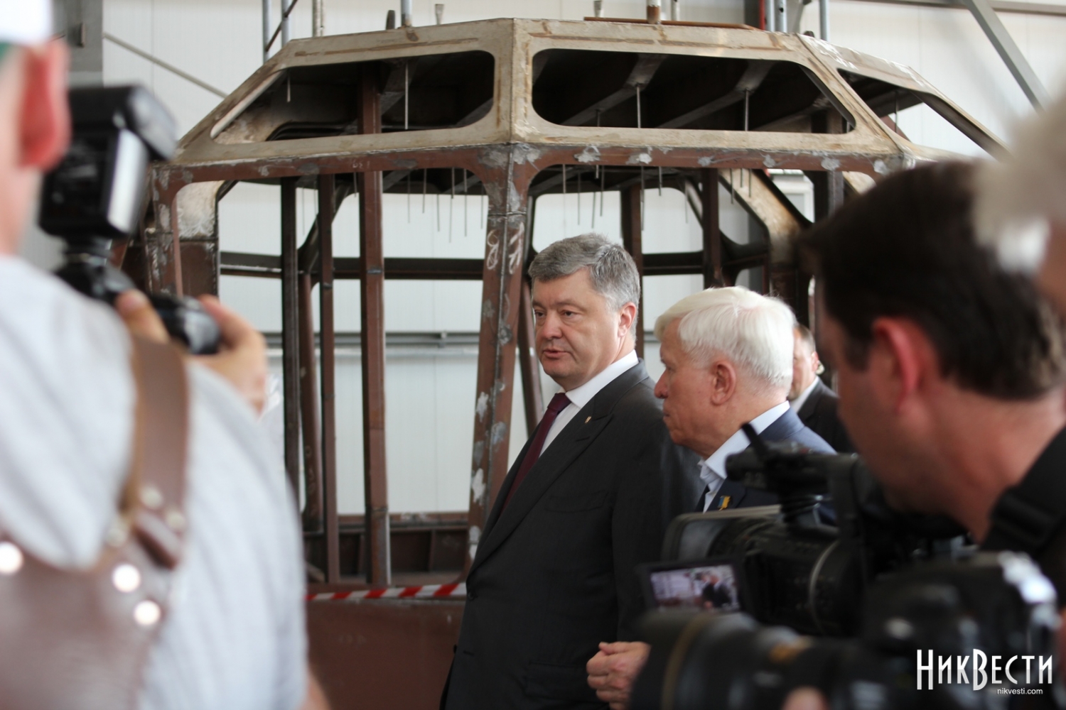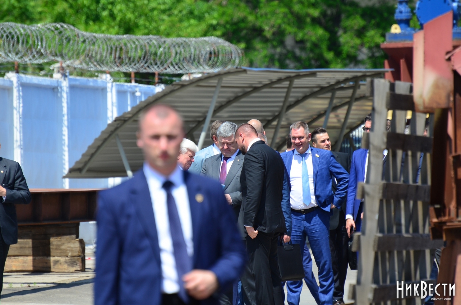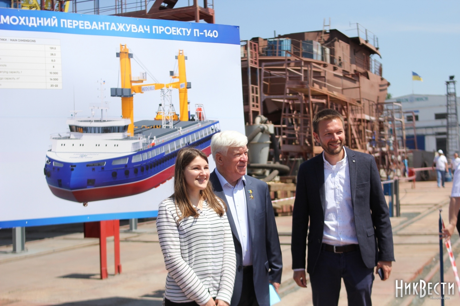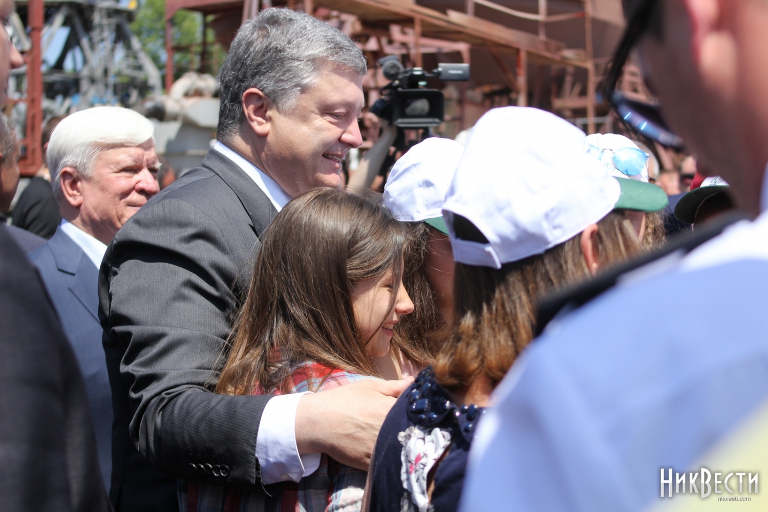 Также Петр Порошенко принял участие в торжественной закладке первого 140-метрового самоходного перегружателя проекта П-140. Кроме этого, Президент заложил линейный буксир проекта POSS-115, закладка которого тоже состоялась на заводе. Буксир предназначен для перевозки грузов по реке Днепр и караванами по 2 единицы несамоходных судов грузовместимостью 5 тысяч и 2 тысячи тонн. В общем, Президент и гости предприятия могли подняться на самоходное сверхмощное дноуглубительное судно «Николаевец», оценить масштаб 100-метрового несамоходного судна проекта В5000, способного снять с украинских дорог более 200 грузовиков за один рейс, а также прогуляться на высокоскоростных пассажирских судах «НИБУЛОН Экспресс».
