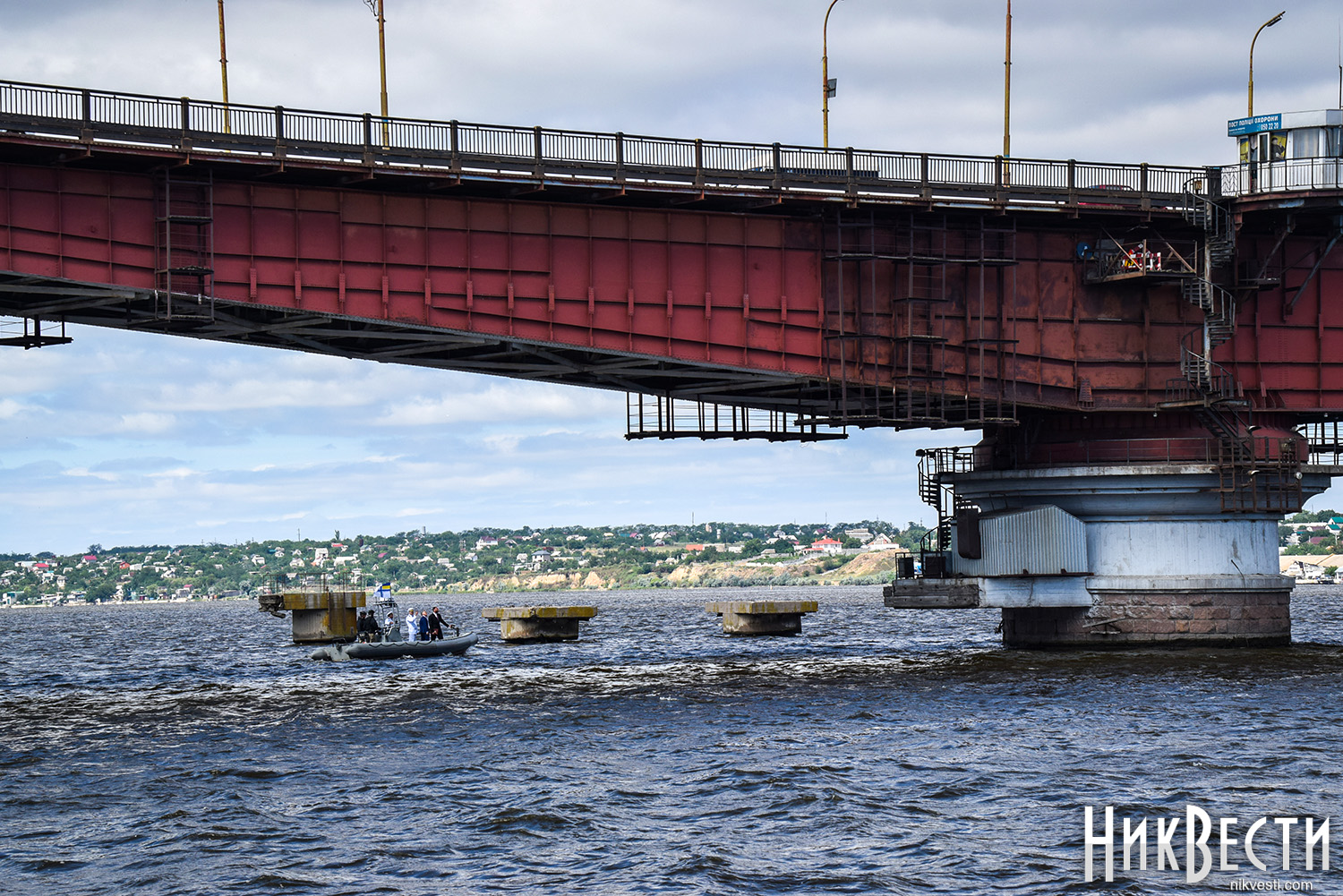 На скоростной моторной лодке Sea Force 11М американского производства чиновники с разных сторон осмотрели конструкции моста и обсудили необходимость срочного ремонта моста.