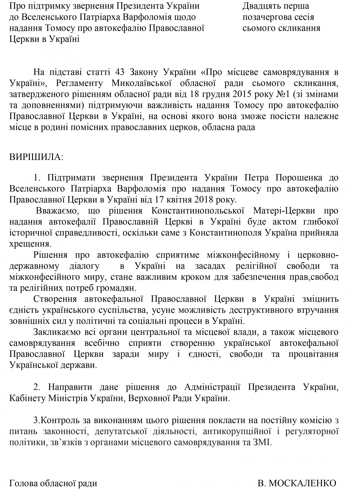 Председатель Николаевской областной государственной администрации Алексей Савченко поблагодарил депутатов за сознательное решение и отметил, что поддержка обращения Президента по автокефалии является движением к объединению страны.