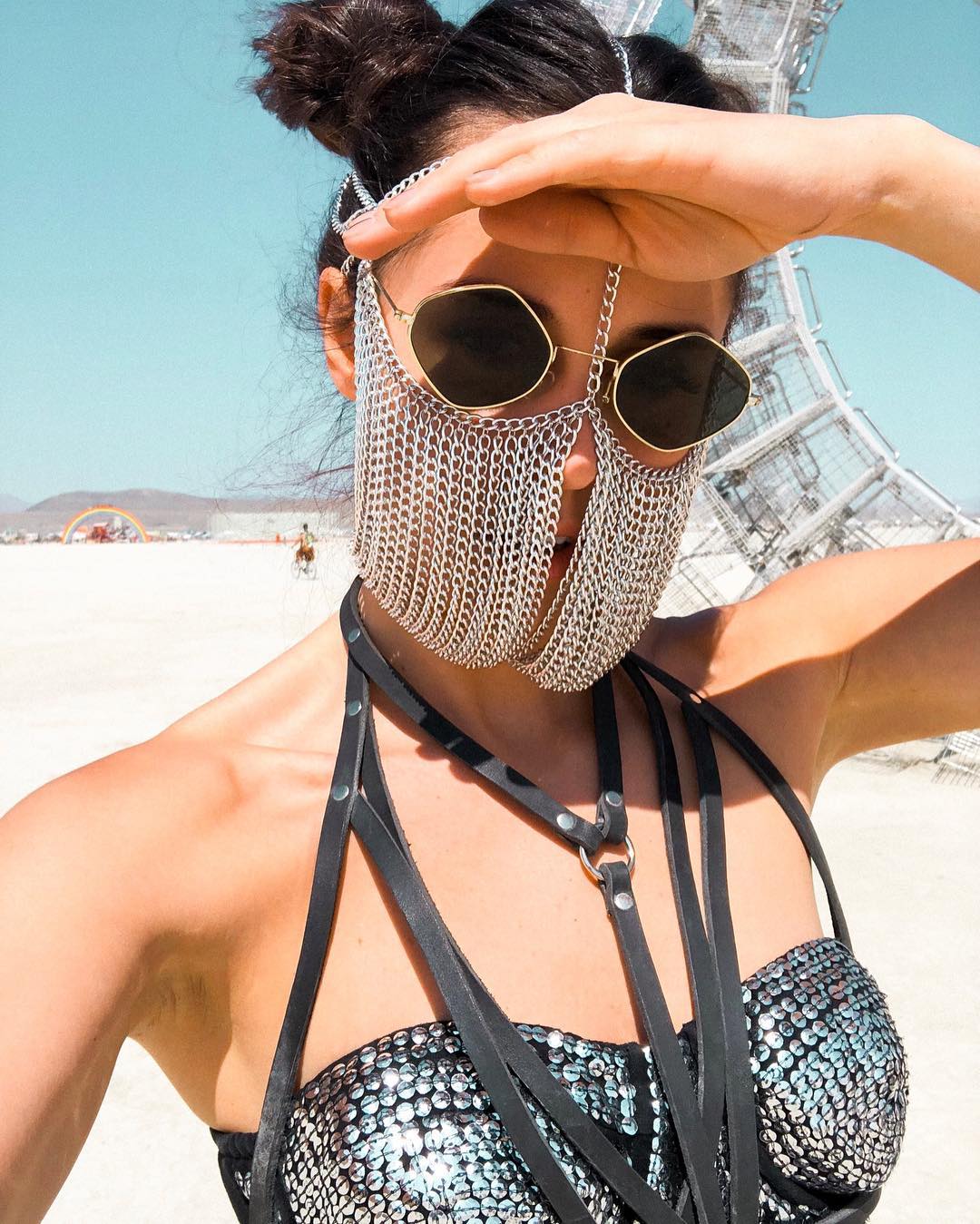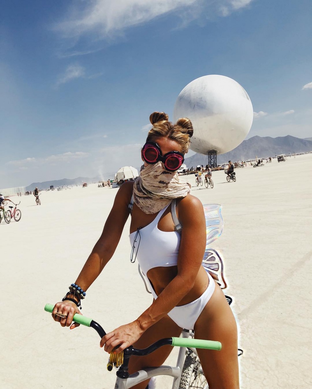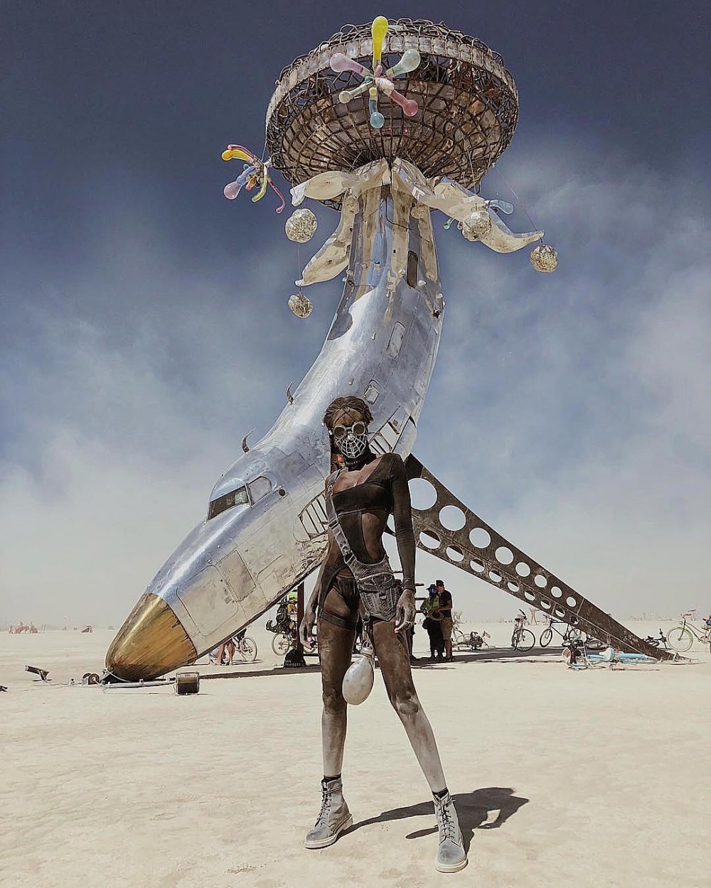 Погодные условия в пустыне не из легких: жара, ветер и мелкий белый песок, проникающий абсолютно всюду. Защитить глаза — вот главная задача всех гостей фестиваля. В ход идут маски, очки, платки и даже пластиковые шары на голову. Костюмы для Burning Man — еще один способ самовыражения. И не забыть про фото для Instagram, конечно!