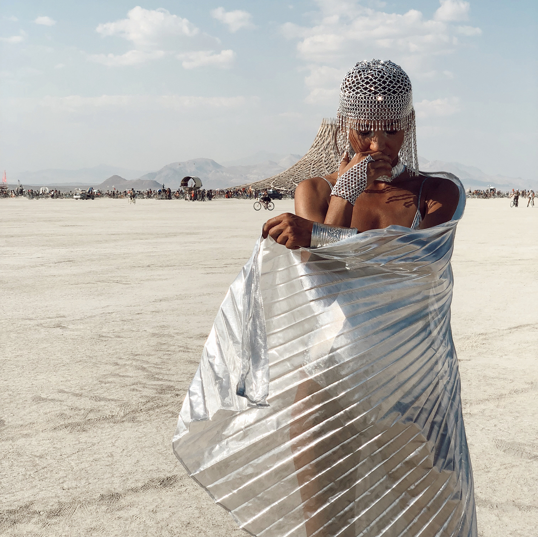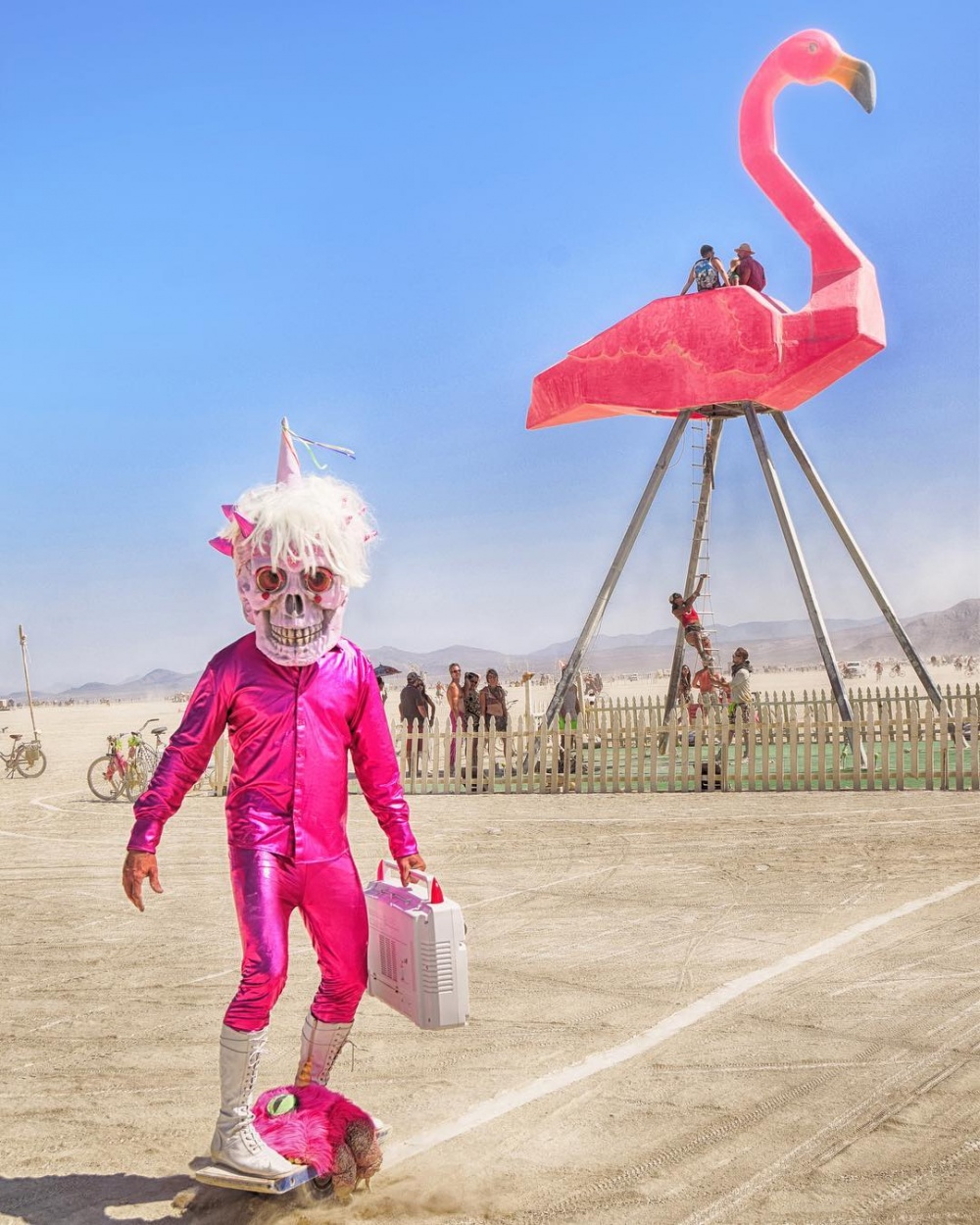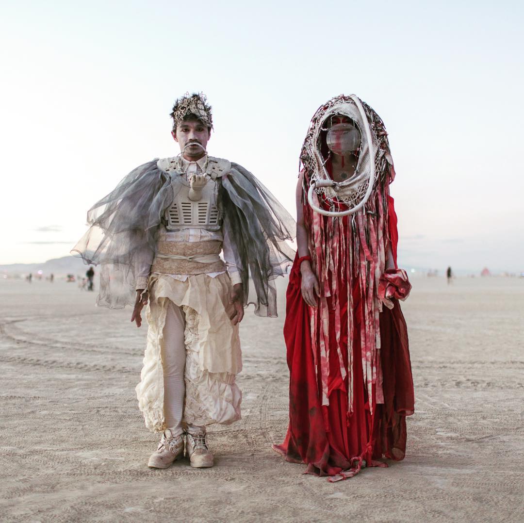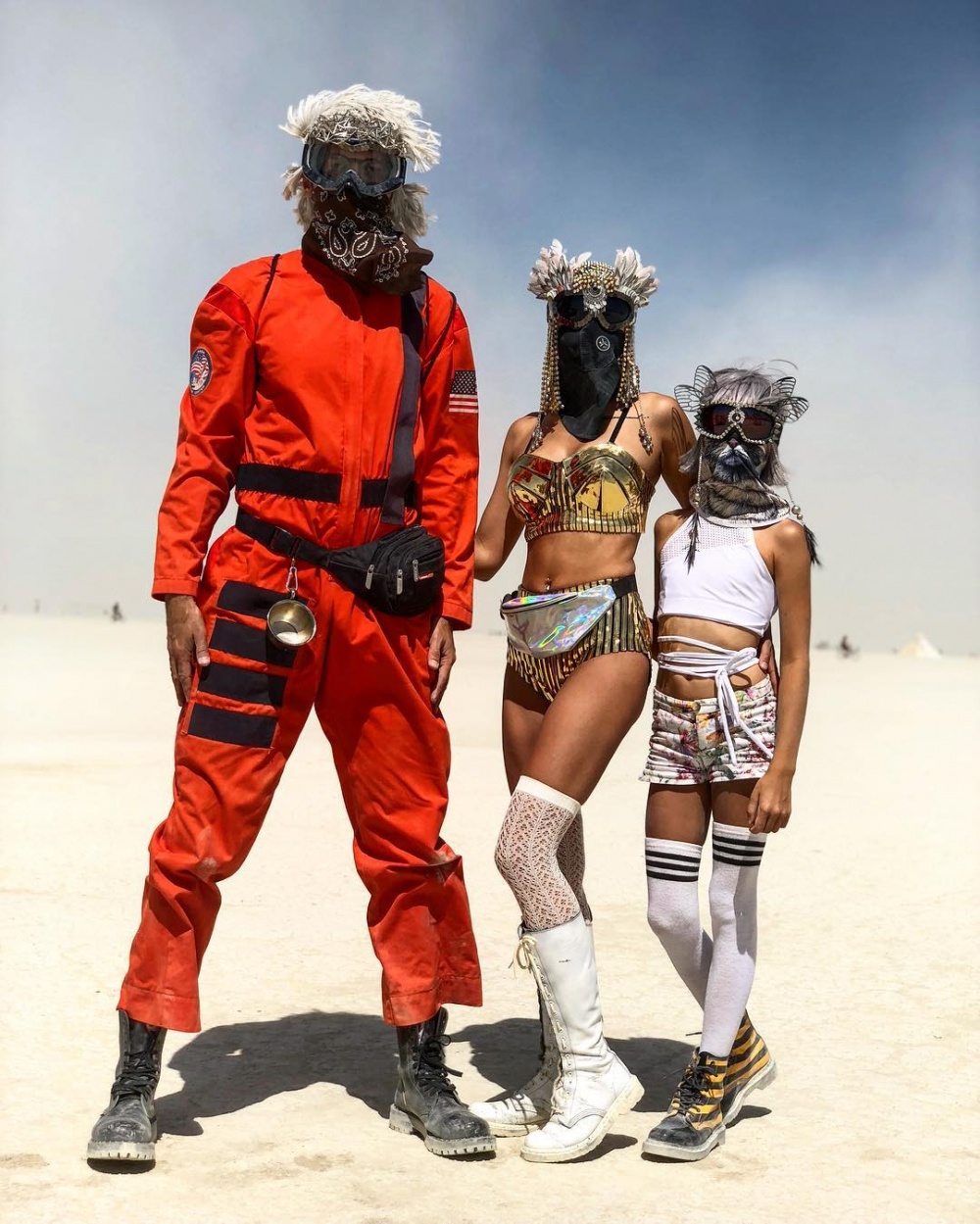 Погодные условия в пустыне не из легких: жара, ветер и мелкий белый песок, проникающий абсолютно всюду. Защитить глаза — вот главная задача всех гостей фестиваля. В ход идут маски, очки, платки и даже пластиковые шары на голову. Костюмы для Burning Man — еще один способ самовыражения. И не забыть про фото для Instagram, конечно!