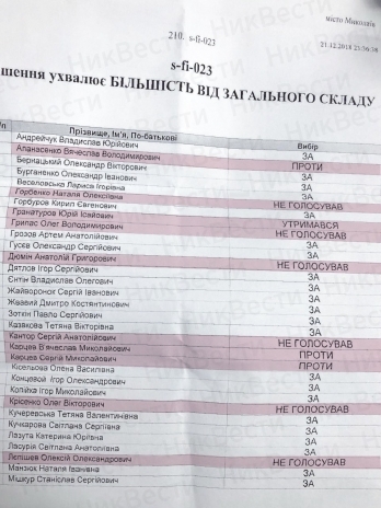 7 депутатов от фракции «Самопомощь» не дали голоса «За» бюджет Николаева - 2019: Вячеслав Апанасенко, Наталья Горбенко, Алексей Лепишев, Федор Панченко, Александр Репин, Дмитрий Сичко, Светлана Таранова.