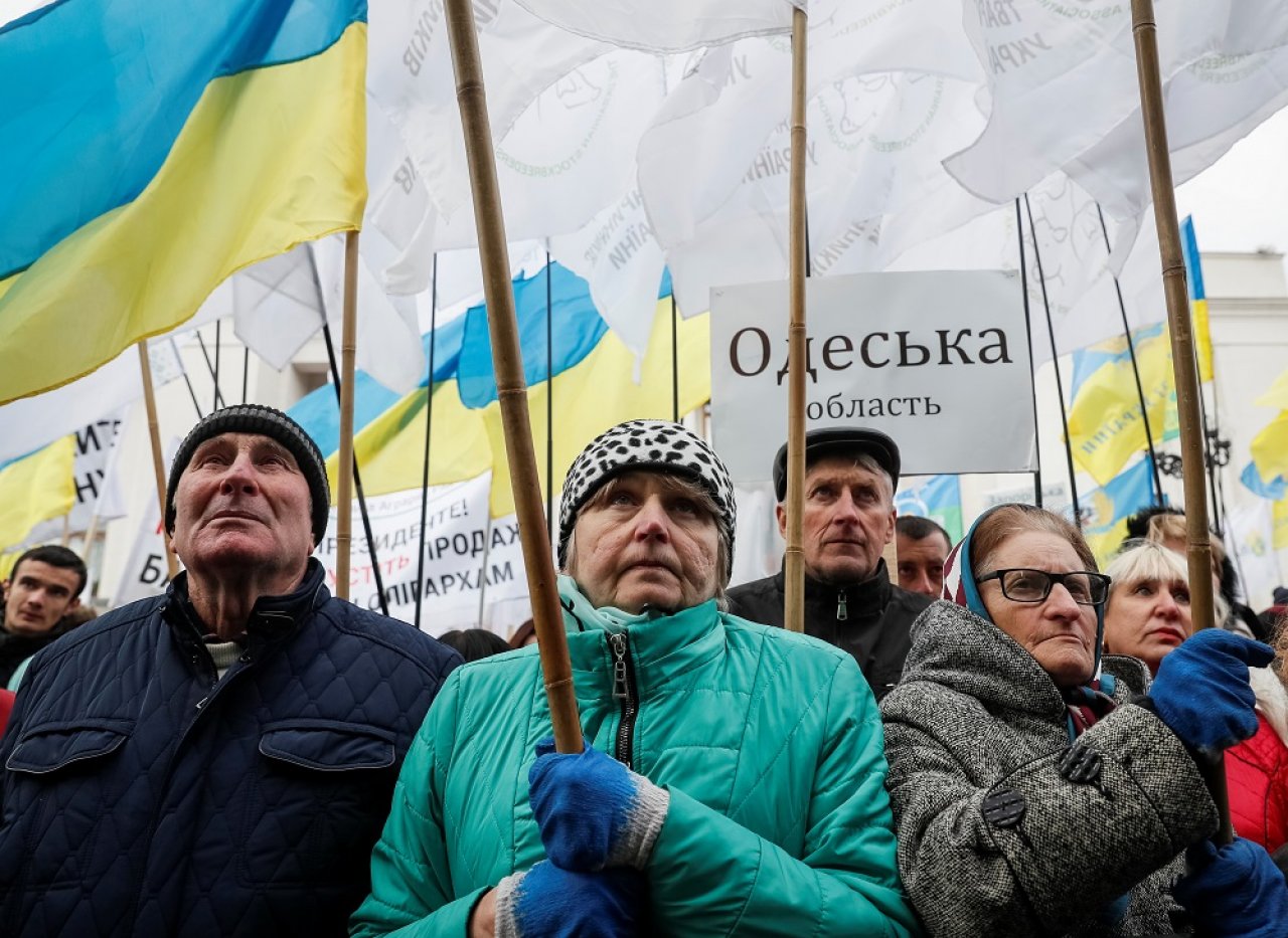 1. Группа людей с флагами и плакатами протестует против земельной реформы перед Верховной Радой.