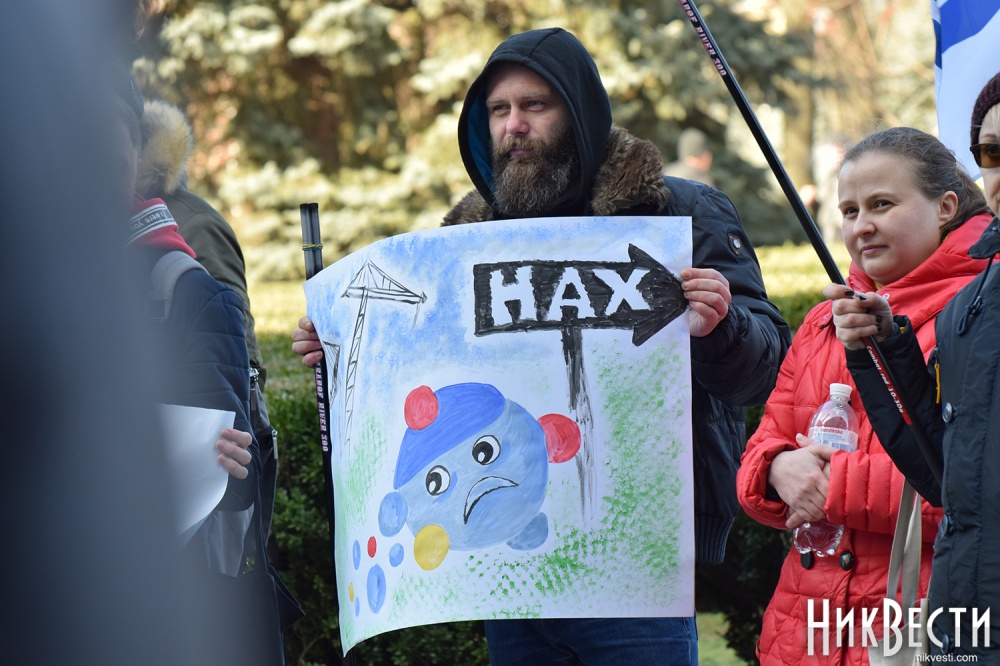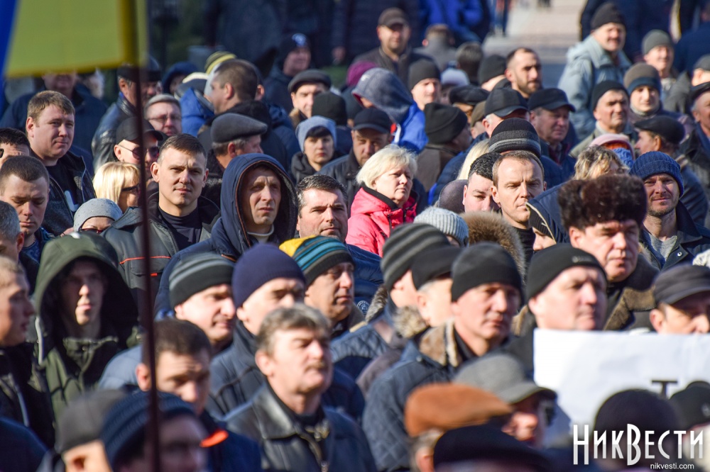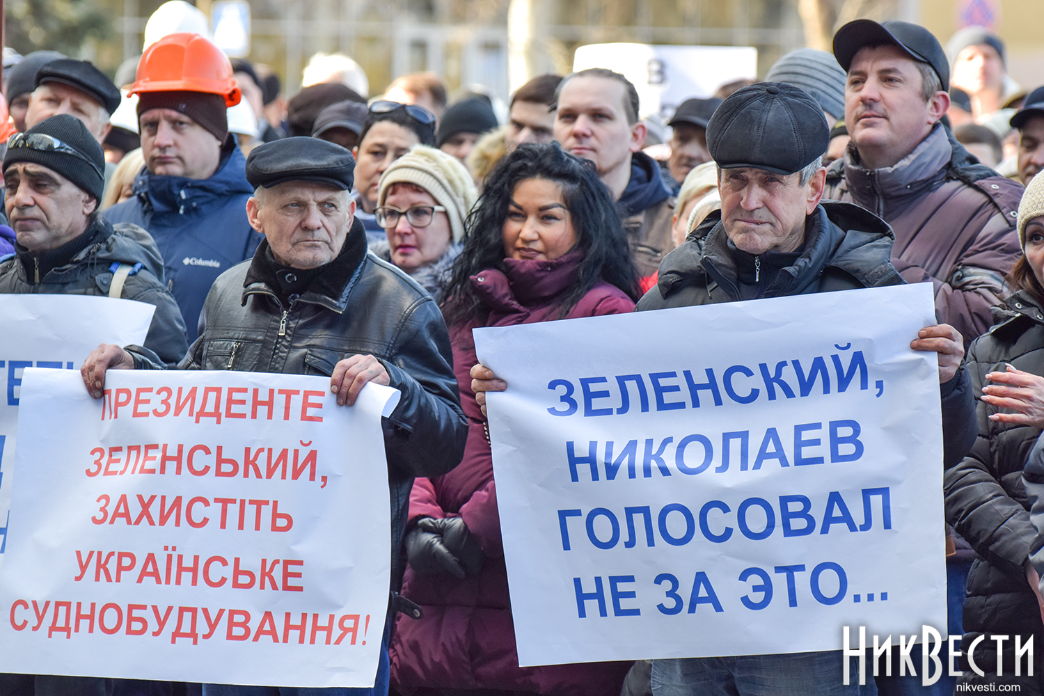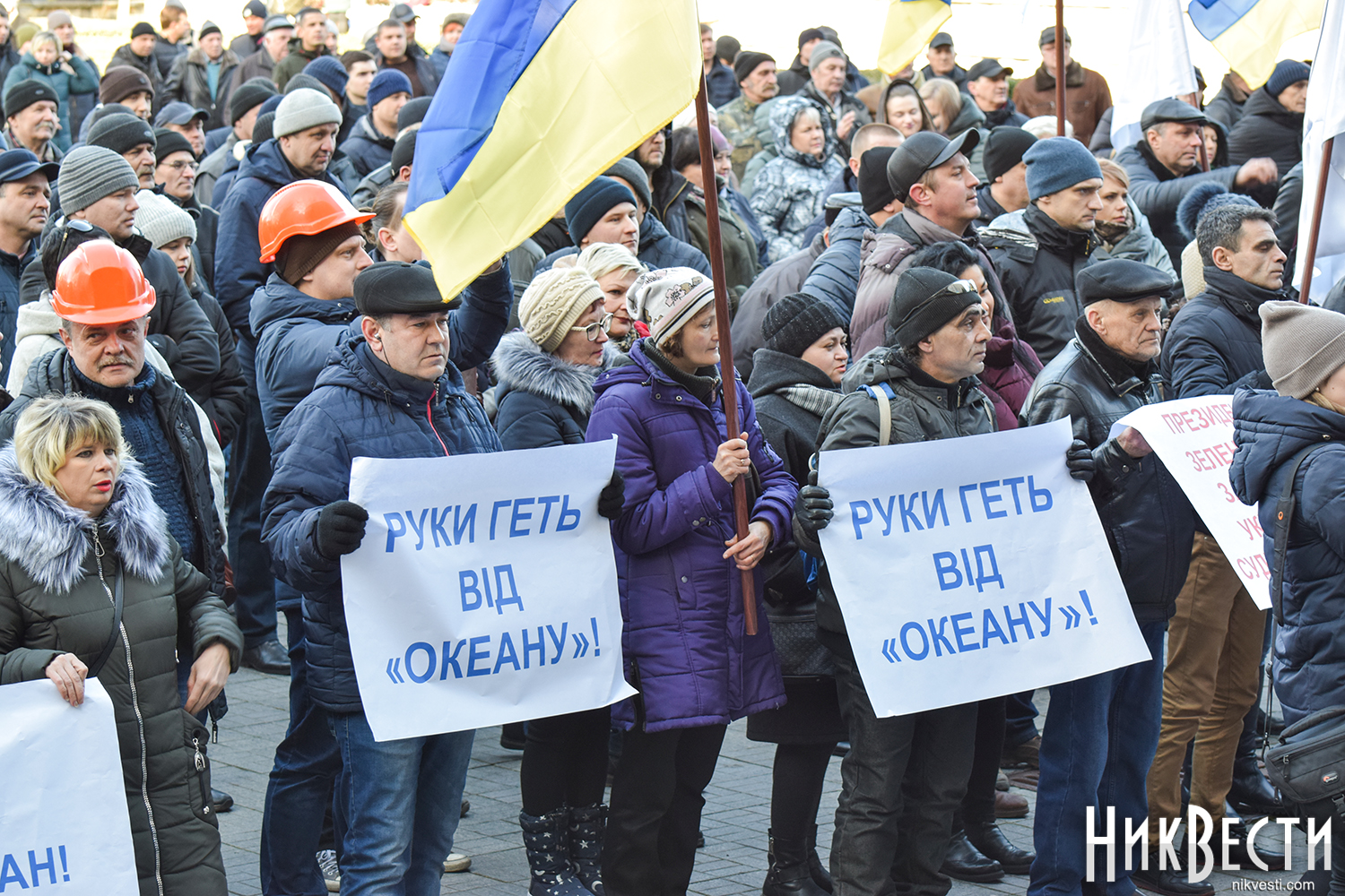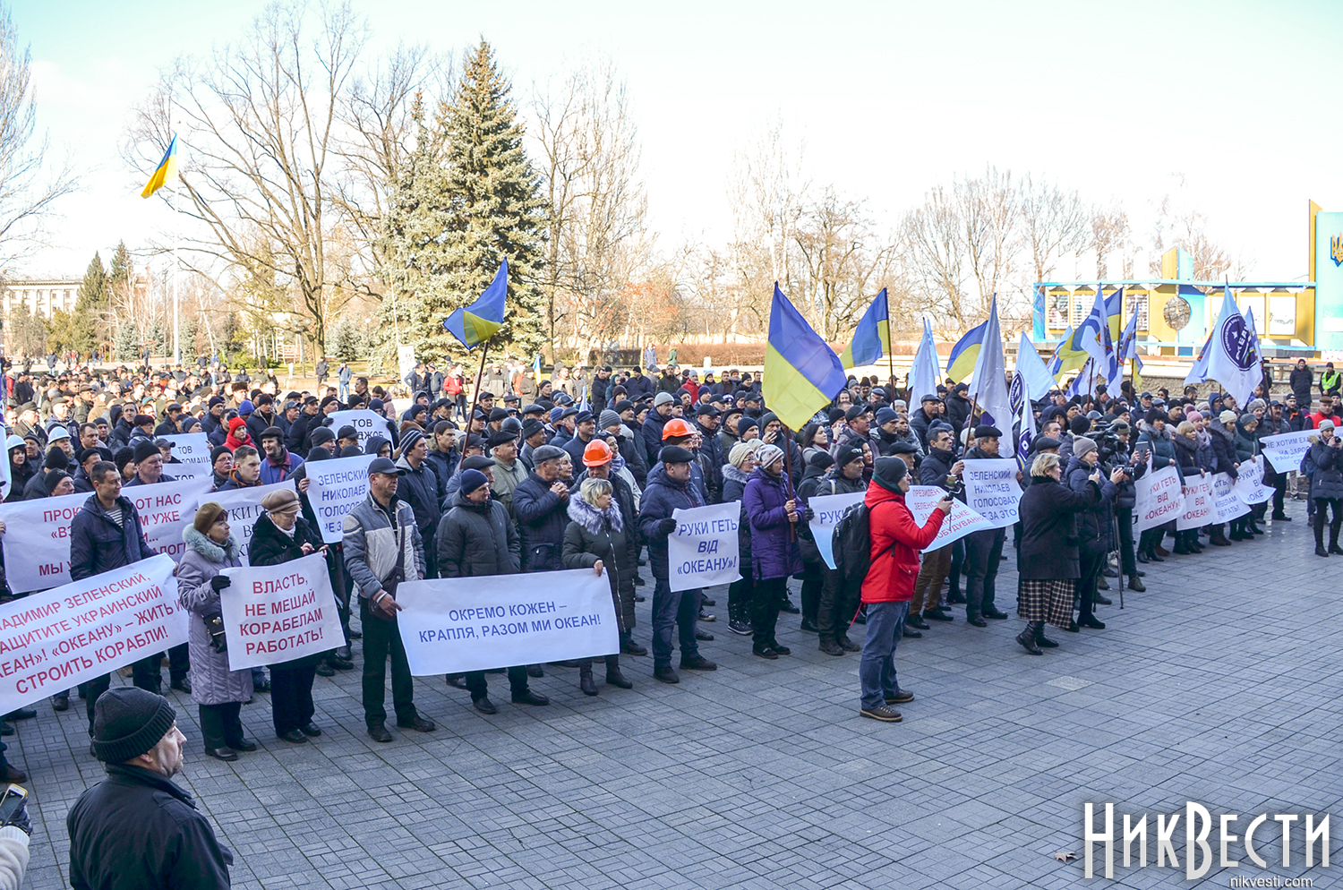 Работники завода вышли на митинг с плакатами: «Зеленский, Николаев голосовал не за это», «Отдельно каждый из нас капля, вместе мы - «Океан», «Руки прочь от «Океана», «Власть, не мешай корабелам работать».