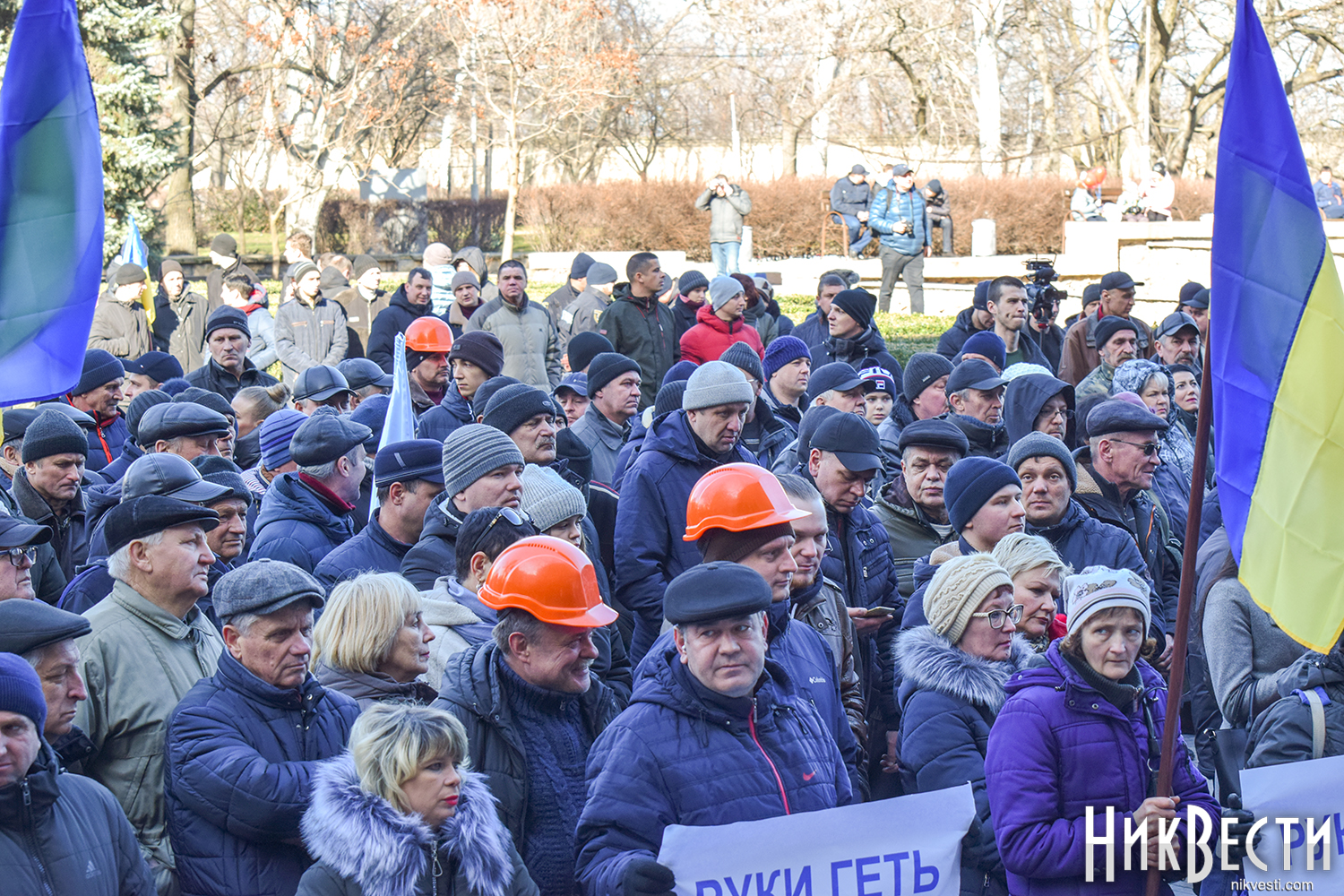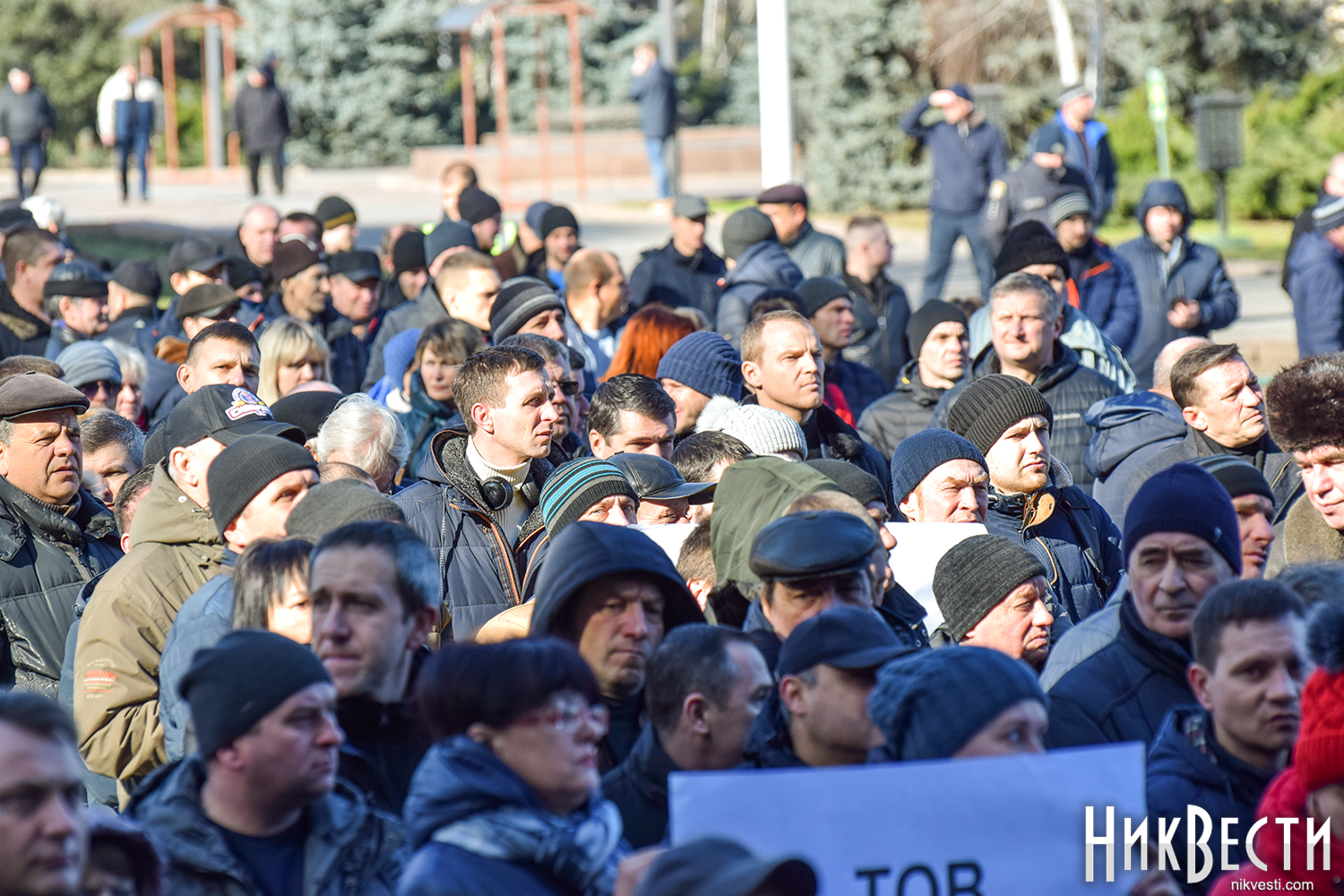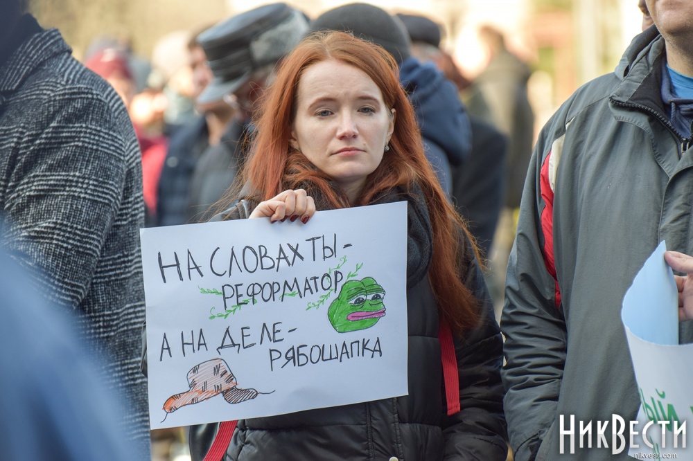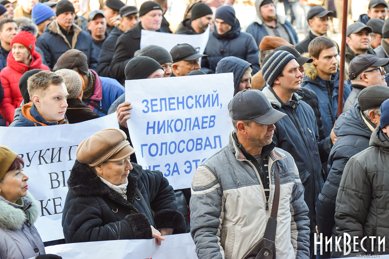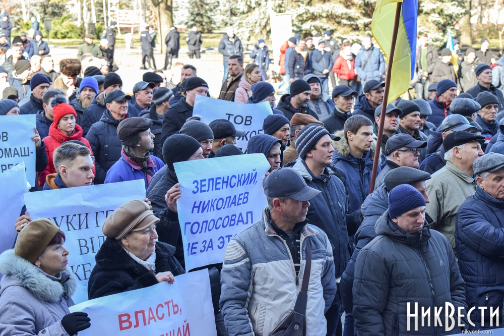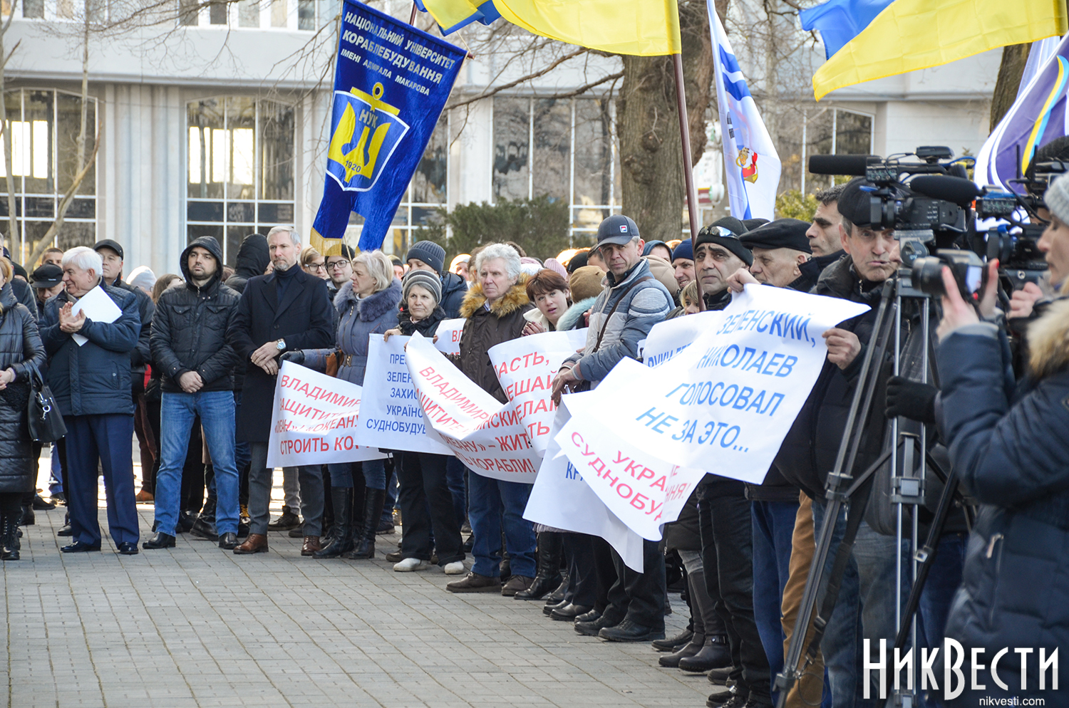 Работники завода вышли на митинг с плакатами: «Зеленский, Николаев голосовал не за это», «Отдельно каждый из нас капля, вместе мы - «Океан», «Руки прочь от «Океана», «Власть, не мешай корабелам работать».