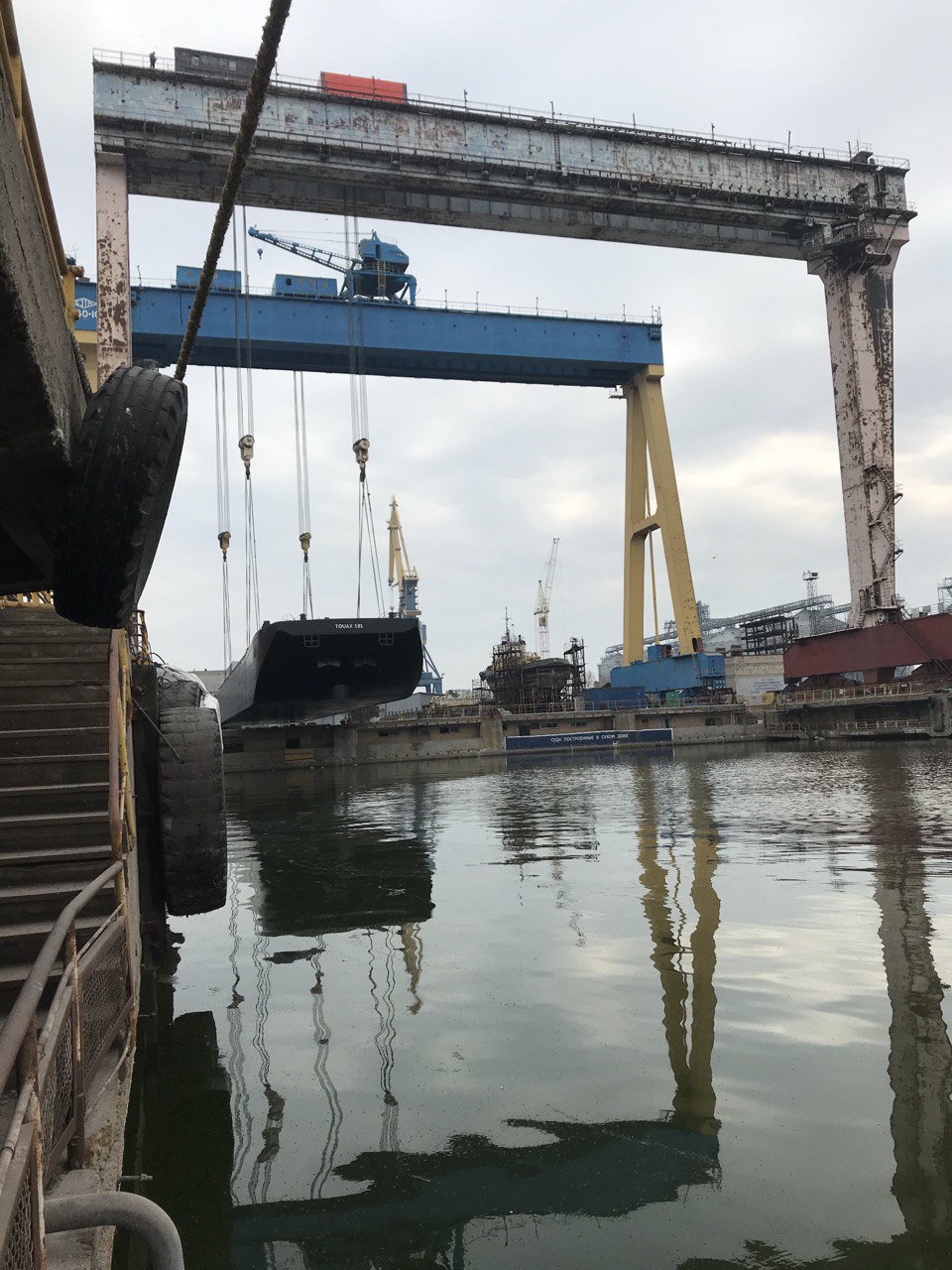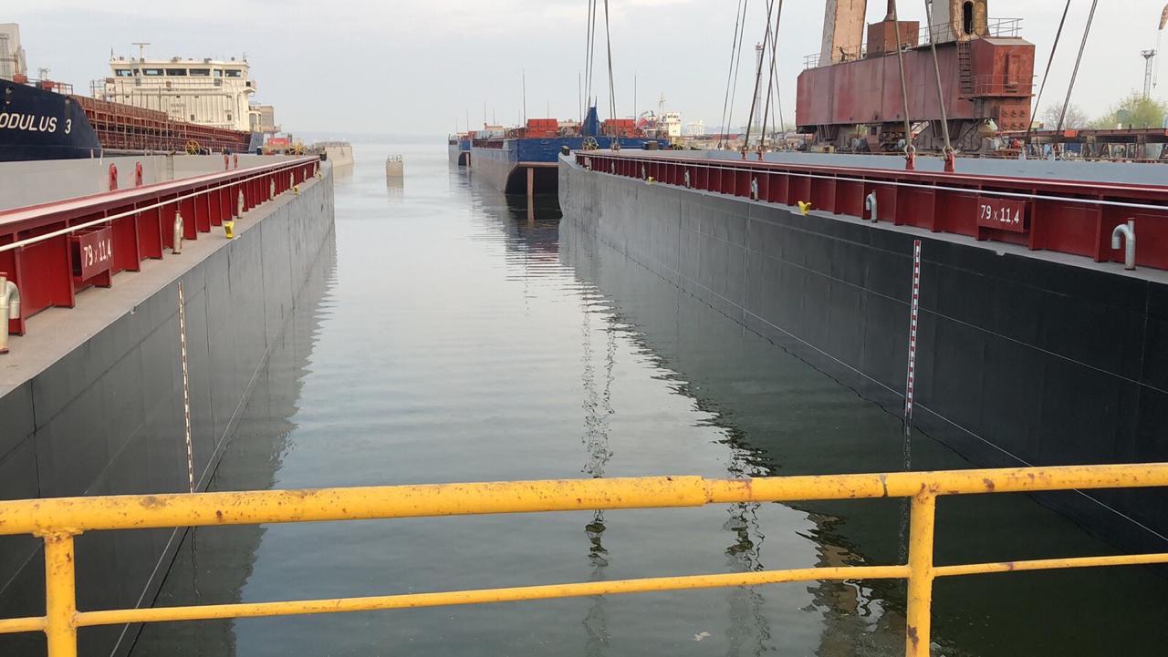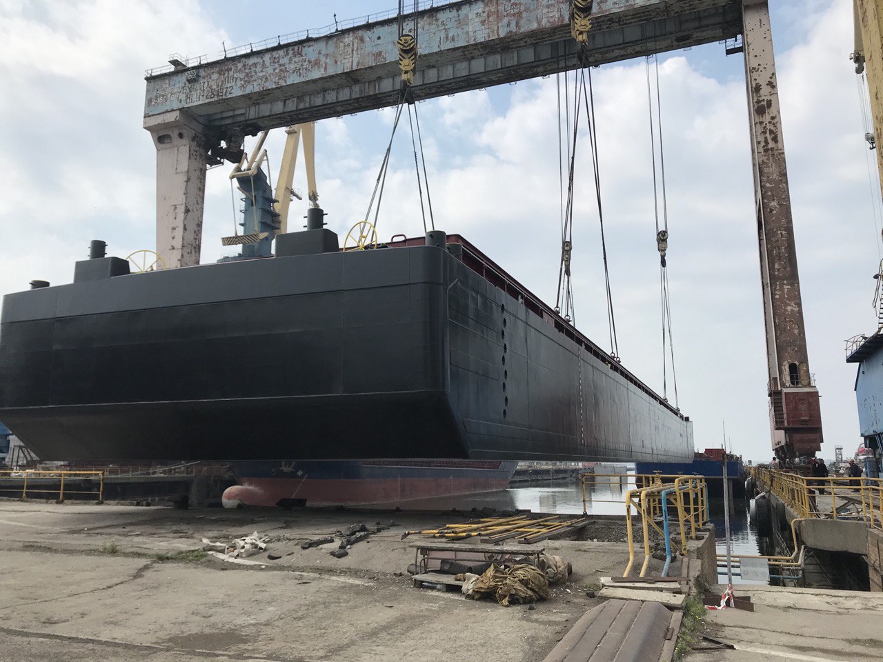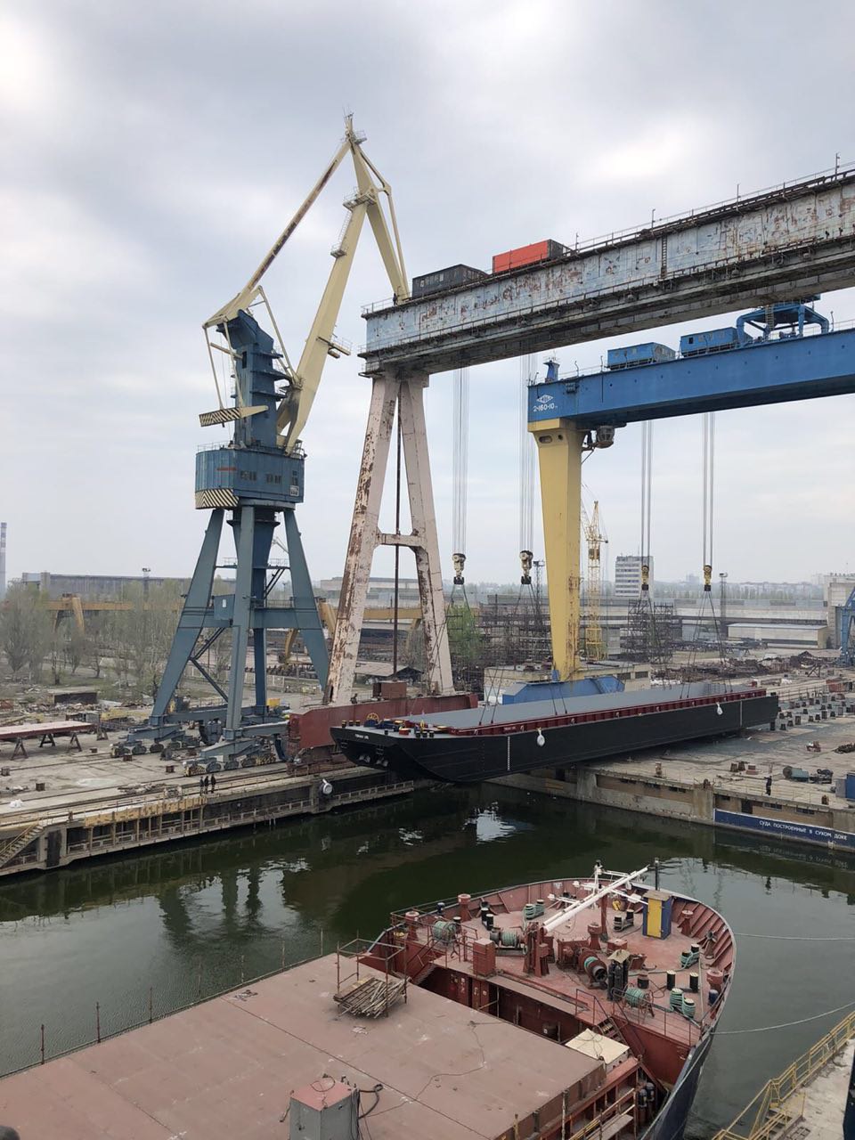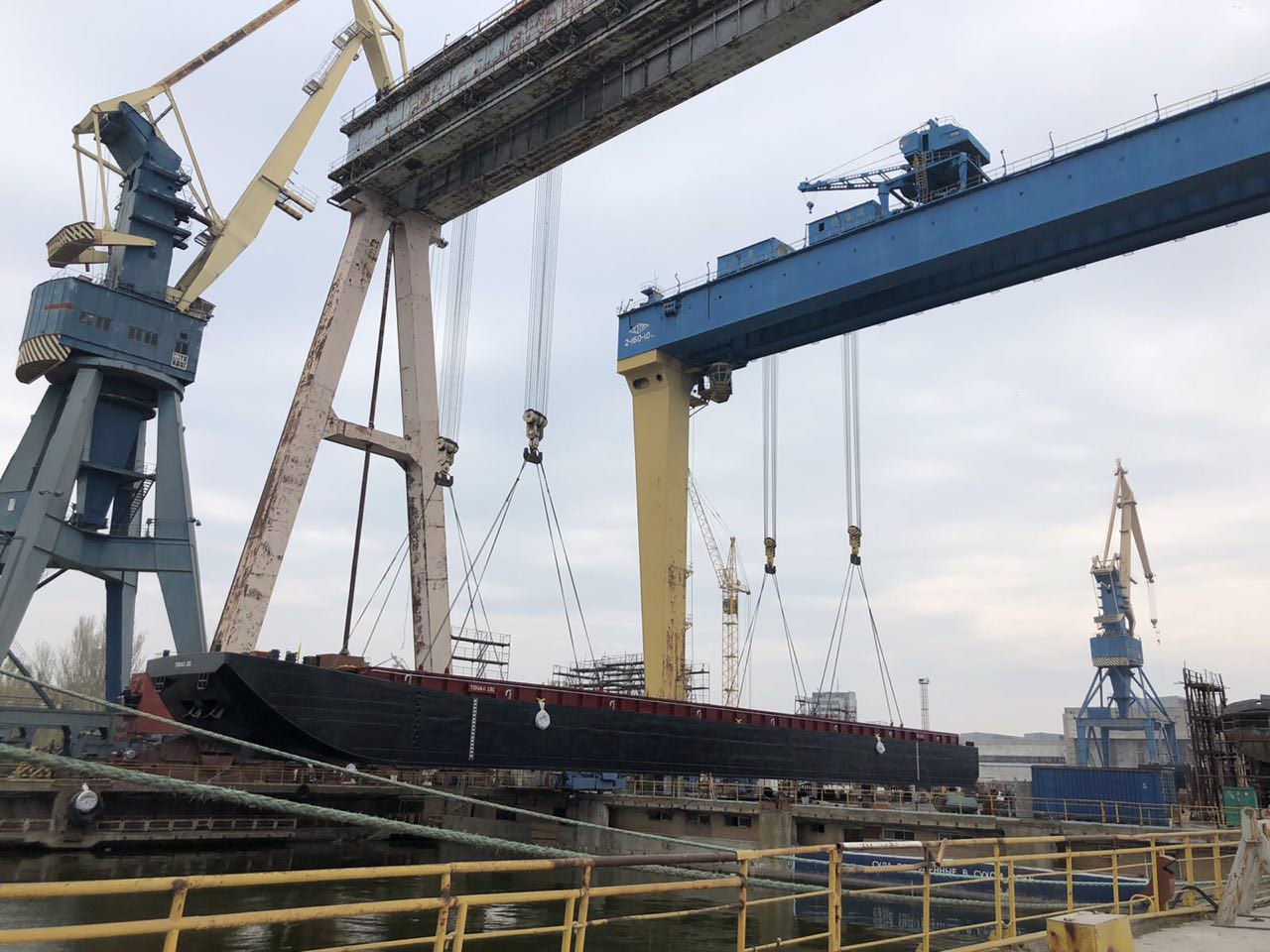 Он рассказал, что работы по спуску судов длились почти сутки. Баржи были спущены на воду двумя кранами, каждый грузоподъемностью по 320 тонн.