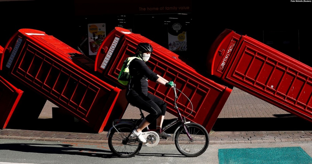 10. Велосипедист едет в защитной маске мимо инсталляции «Out of Order» скульптора Дэвида Мача. Двенадцать красных телефонных будок классической модели, которые являются столь же узнаваемым символом Великобритании, как и почтовые ящики и двухэтажные автобусы, сложены на сторону по «принципу домино».