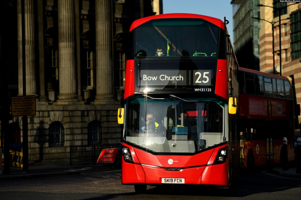 3. Однако городской транспорт продолжает работать. На фото водитель и пассажиры в защитных масках едут в автобусе в центре Лондона.