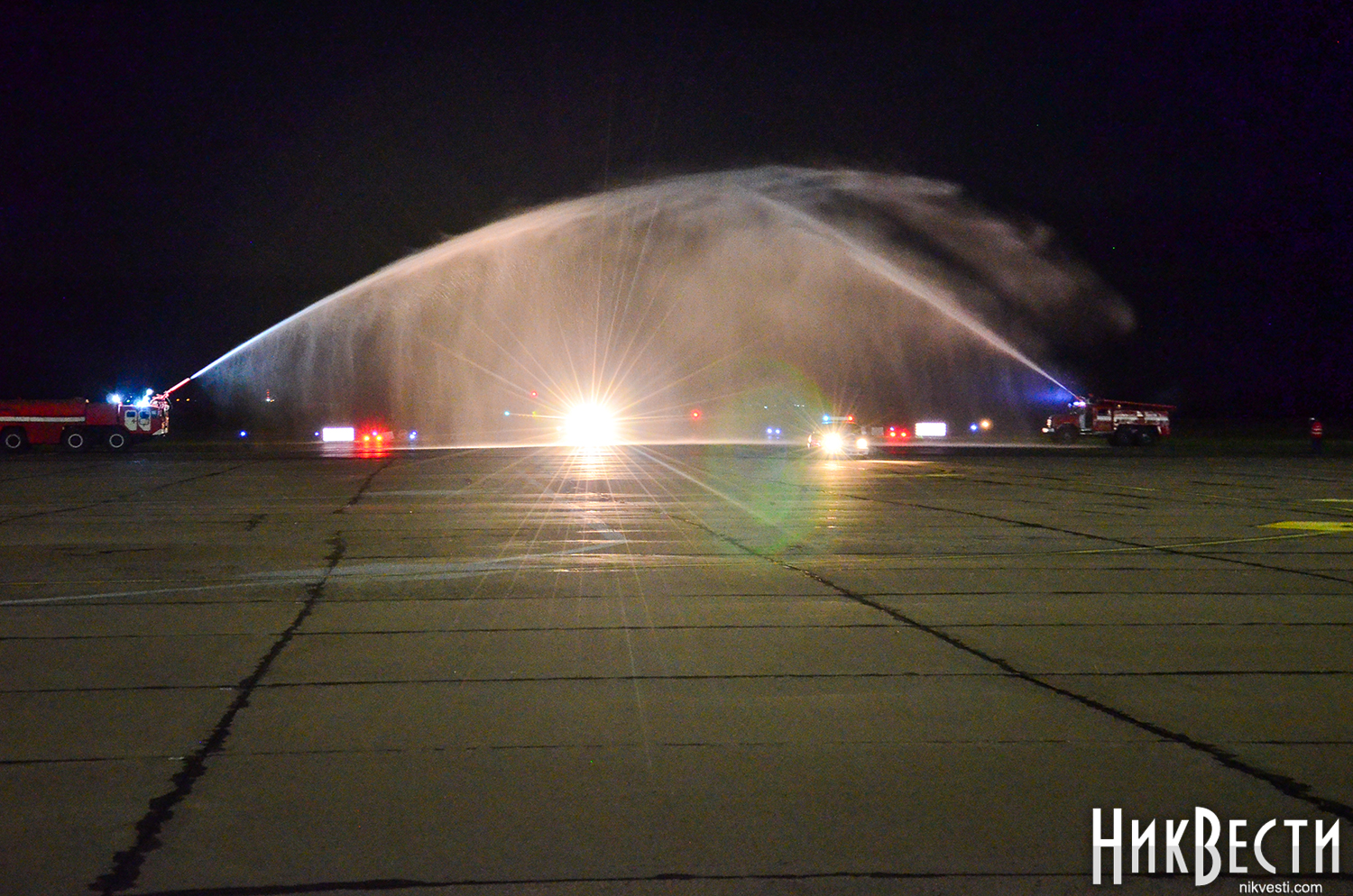 После того как самолет с первыми пассажирами приземлился в аэропорту его по традиции провели через водную арку, а гости, которые в этот вечер пришли посмотреть на запуск регулярных рейсов, с овациями встретили гостей из Киева.