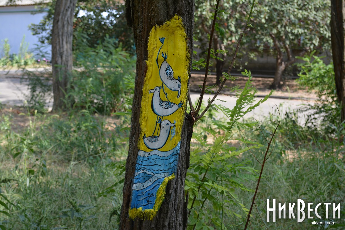 Художница и организатор экскурсий картинной галереи имени Николая Прокопенко Ирина Баранова-Антоненко тоже нарисовала несколько рисунков на деревьях.