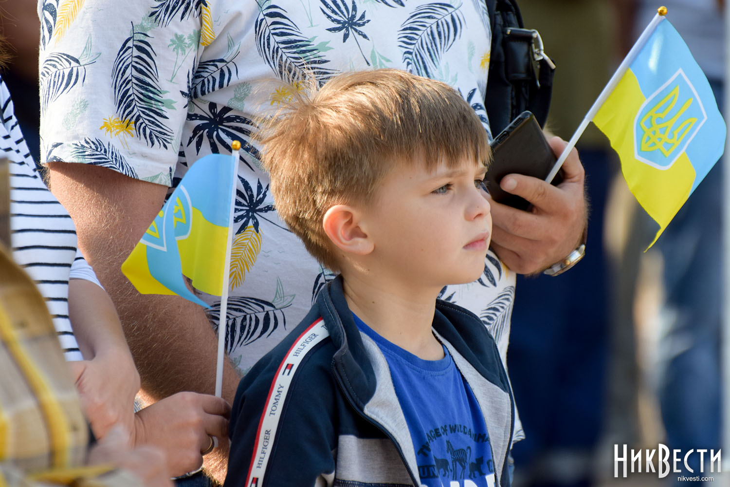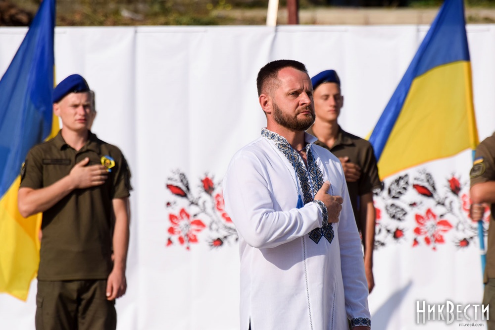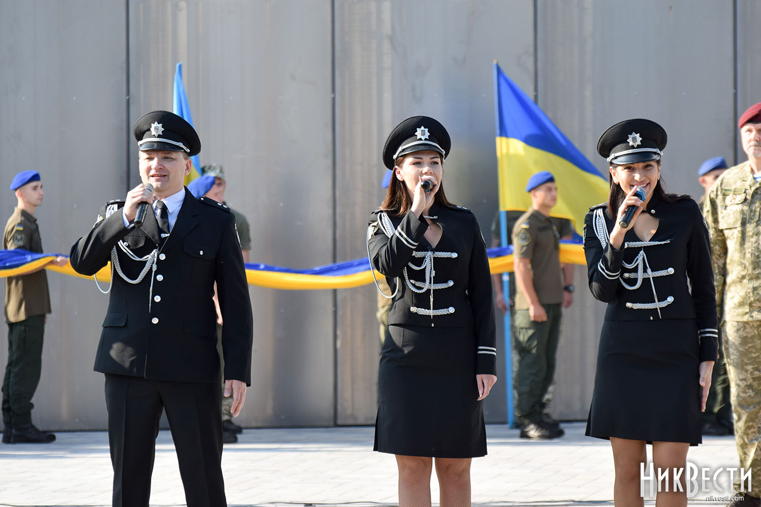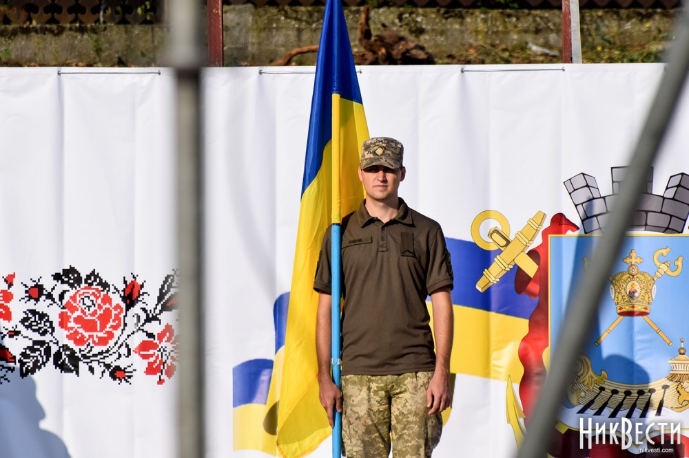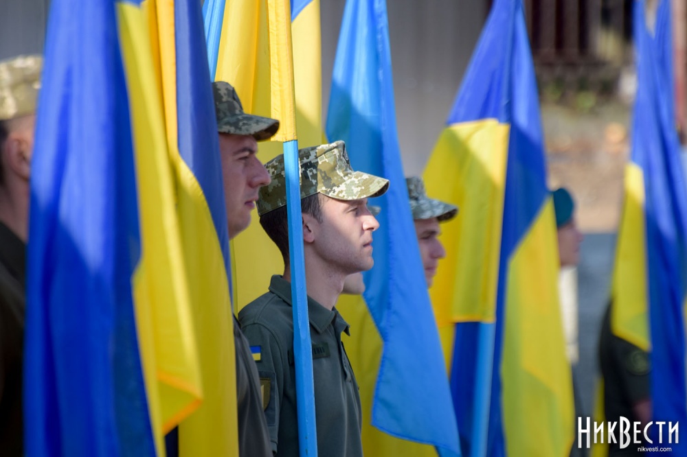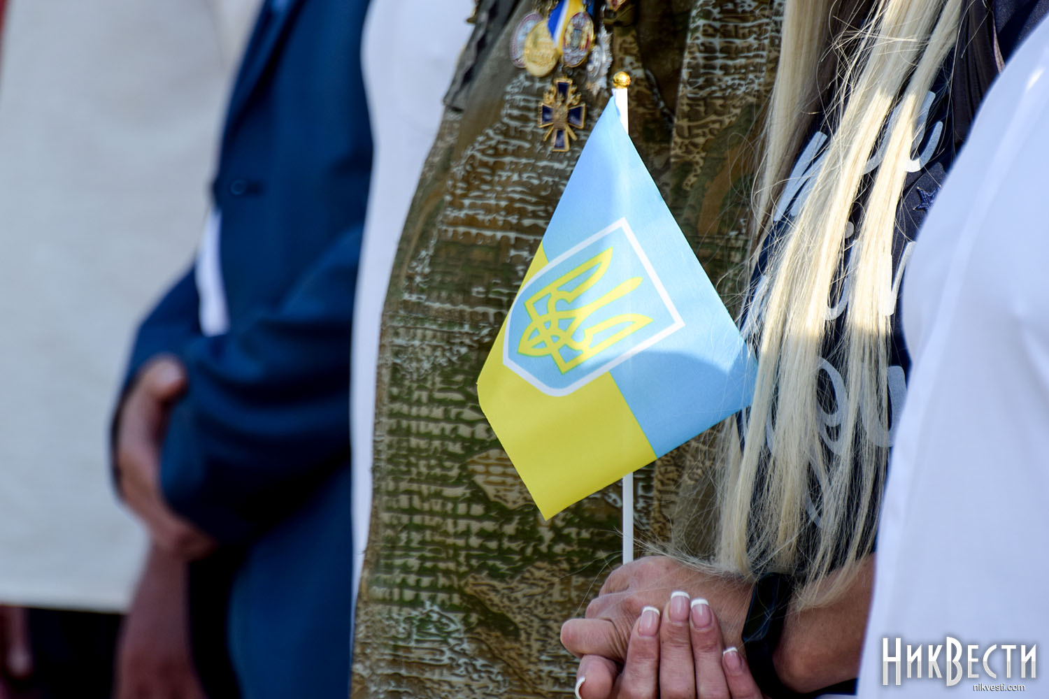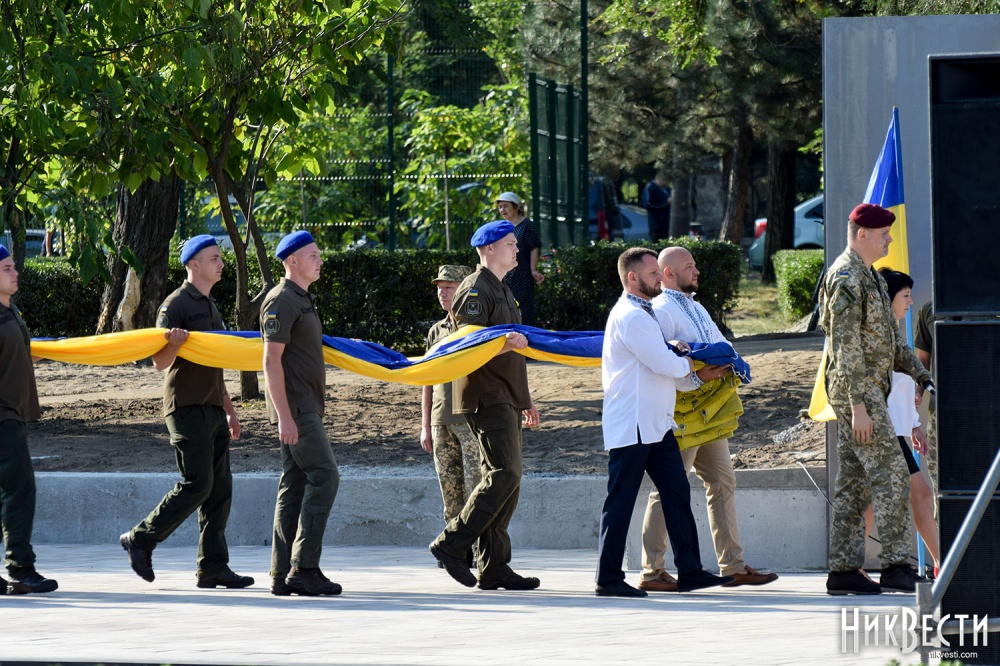 Внесли флаг перед поднятием военнослужащие Национальной гвардии. Колонну возглавил николаевский киборг Александр Терещенко и мать погибшего бойца АТО Алексея Волкова Руслана Миронюк.