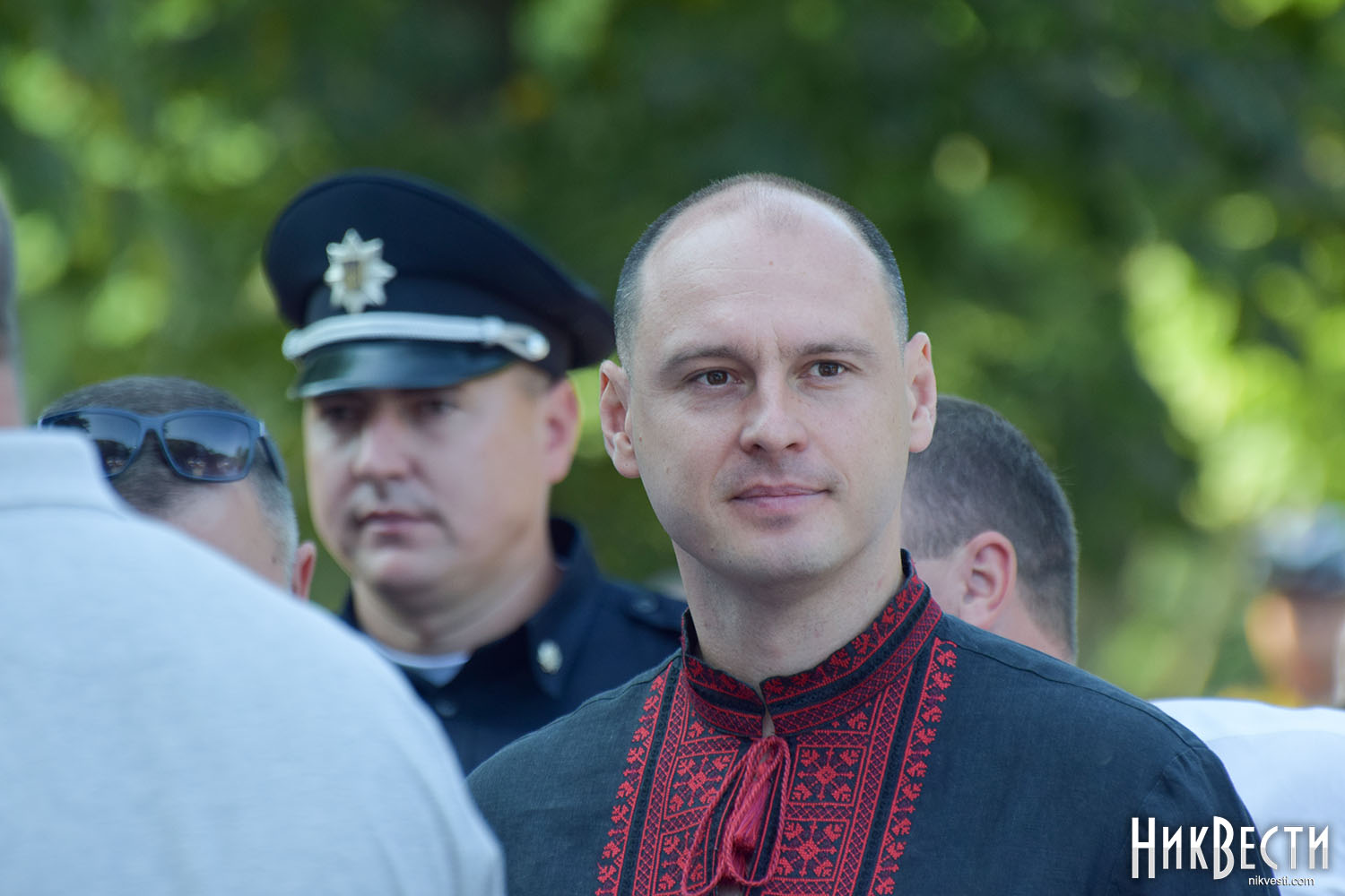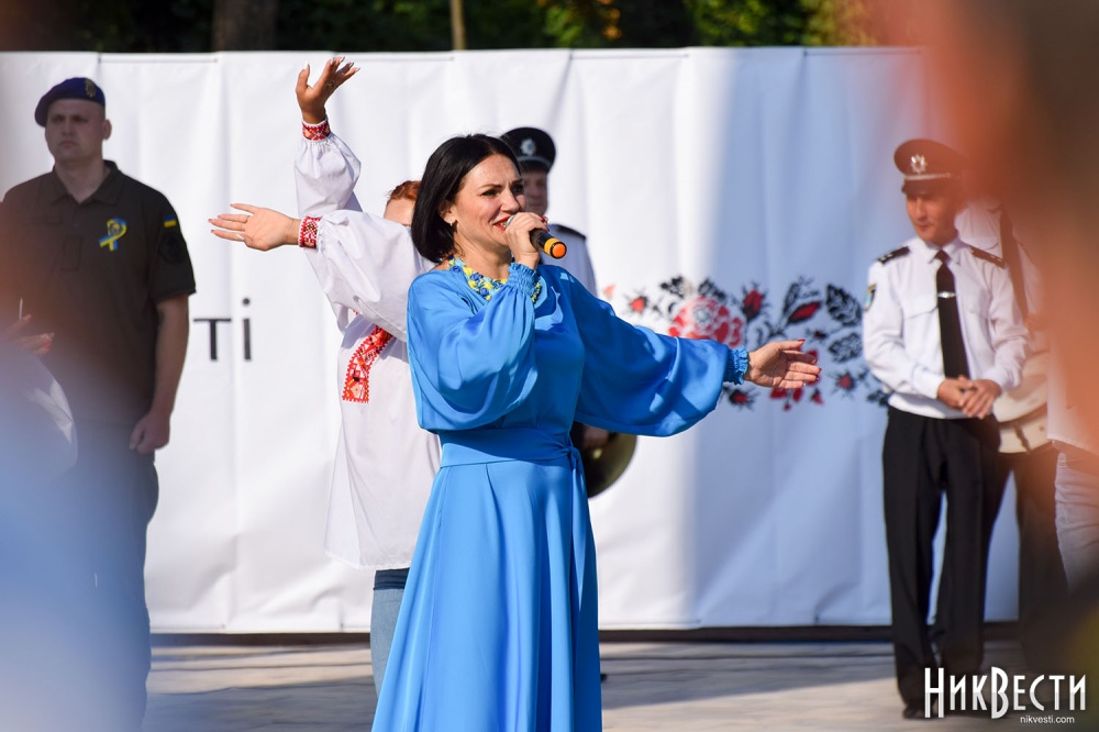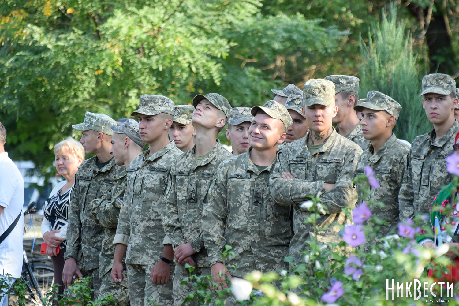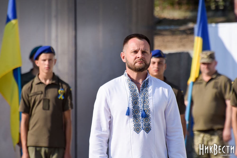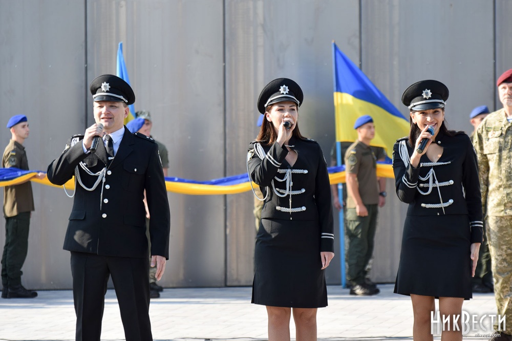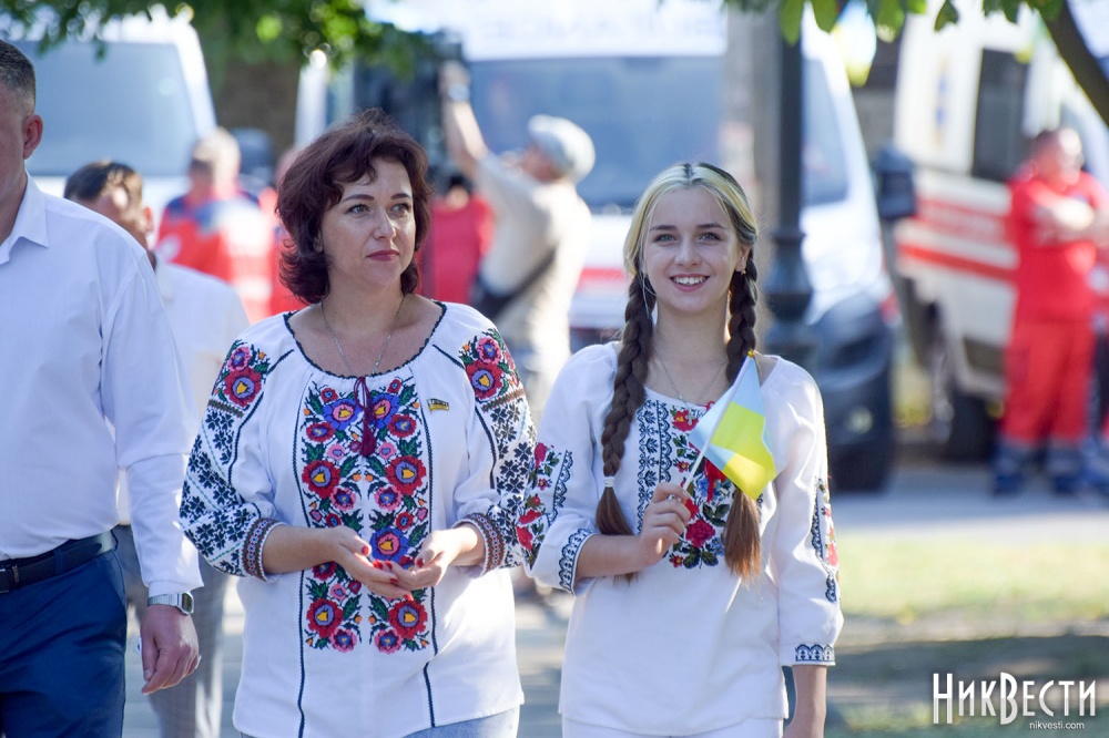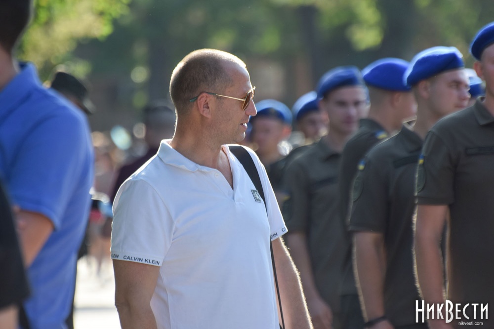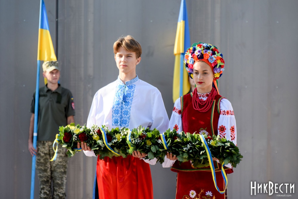 Внесли флаг перед поднятием военнослужащие Национальной гвардии. Колонну возглавил николаевский киборг Александр Терещенко и мать погибшего бойца АТО Алексея Волкова Руслана Миронюк.