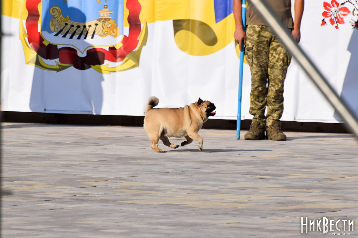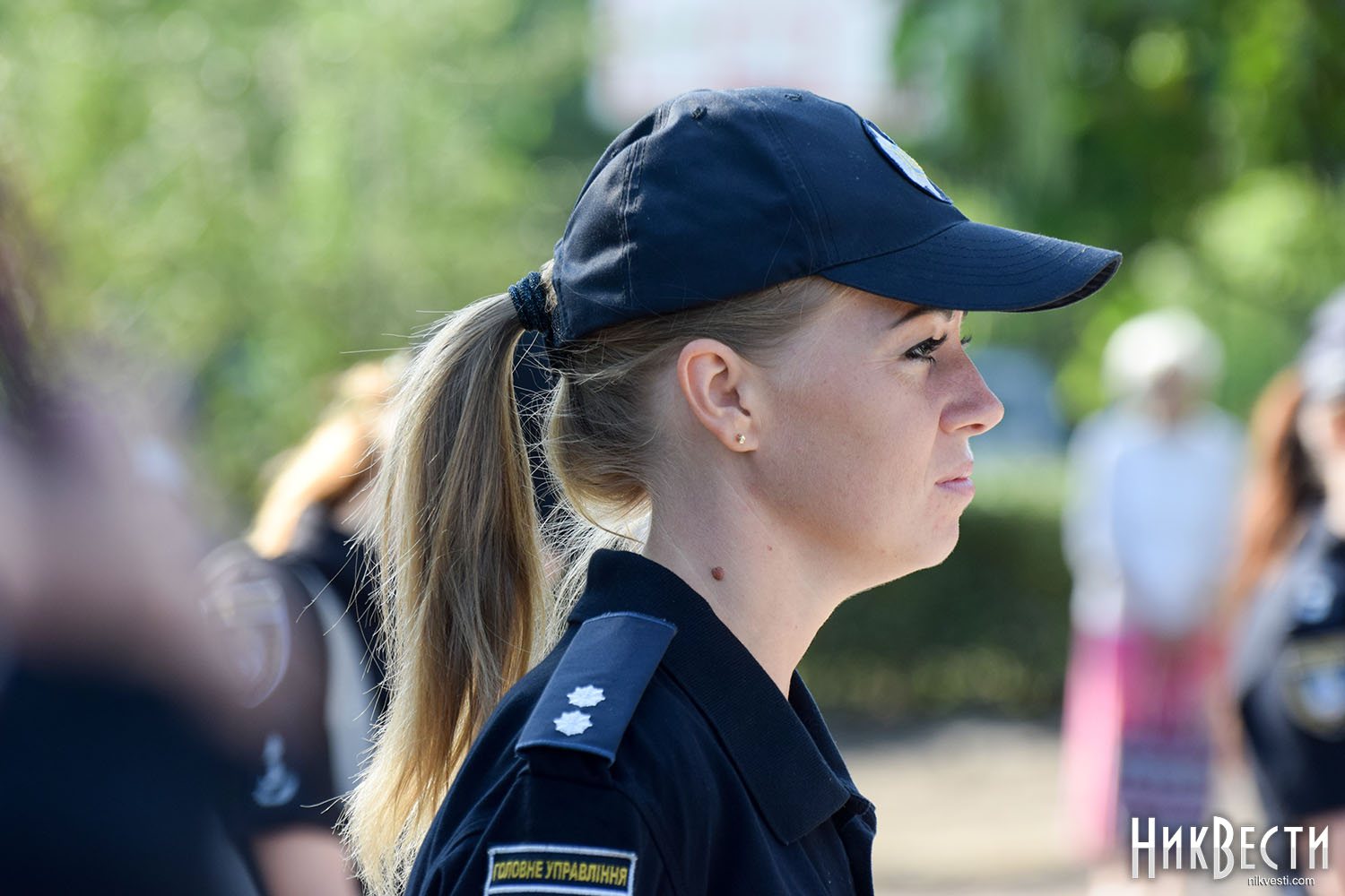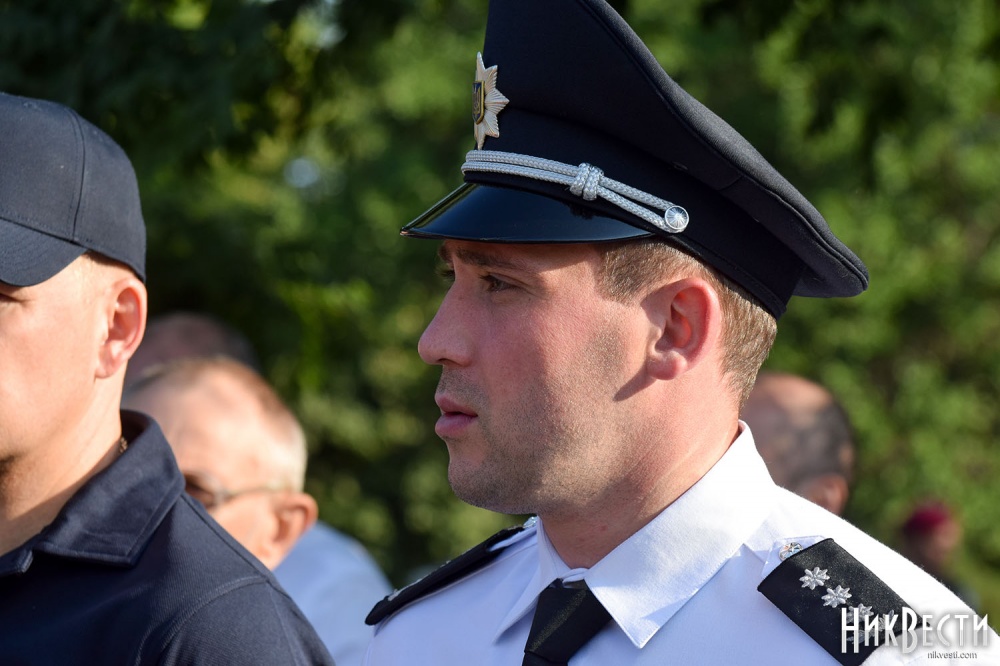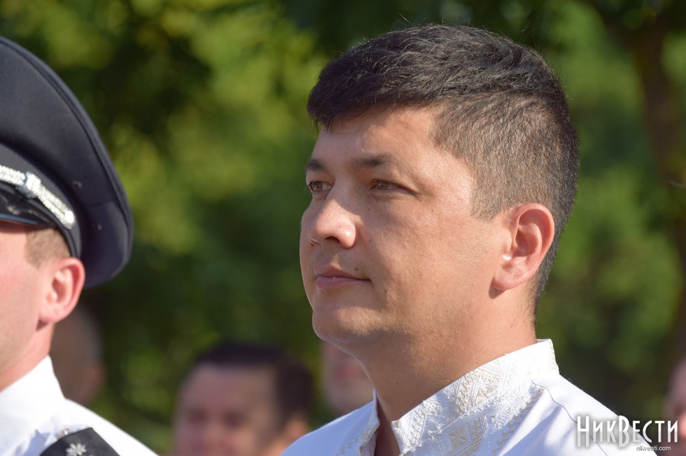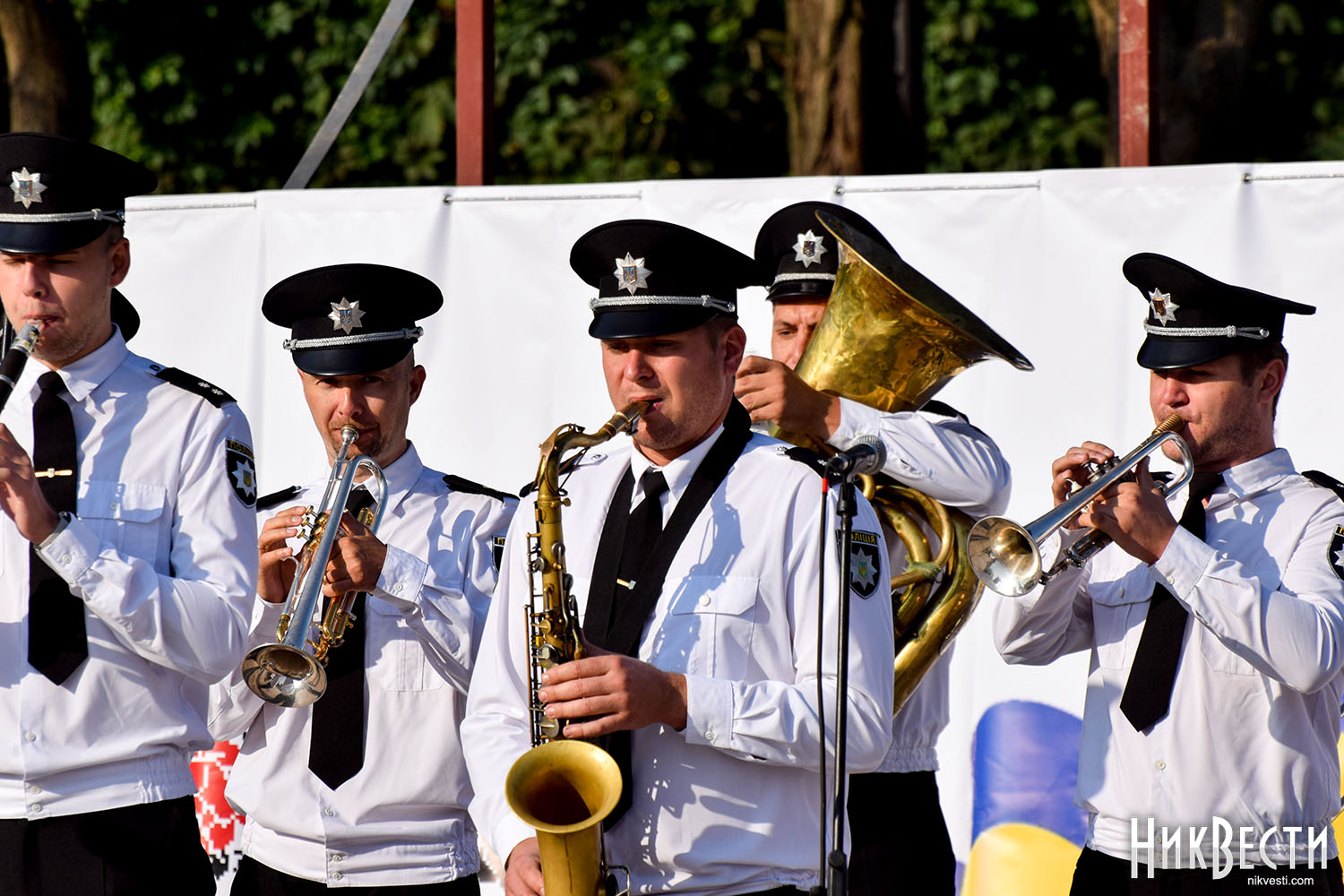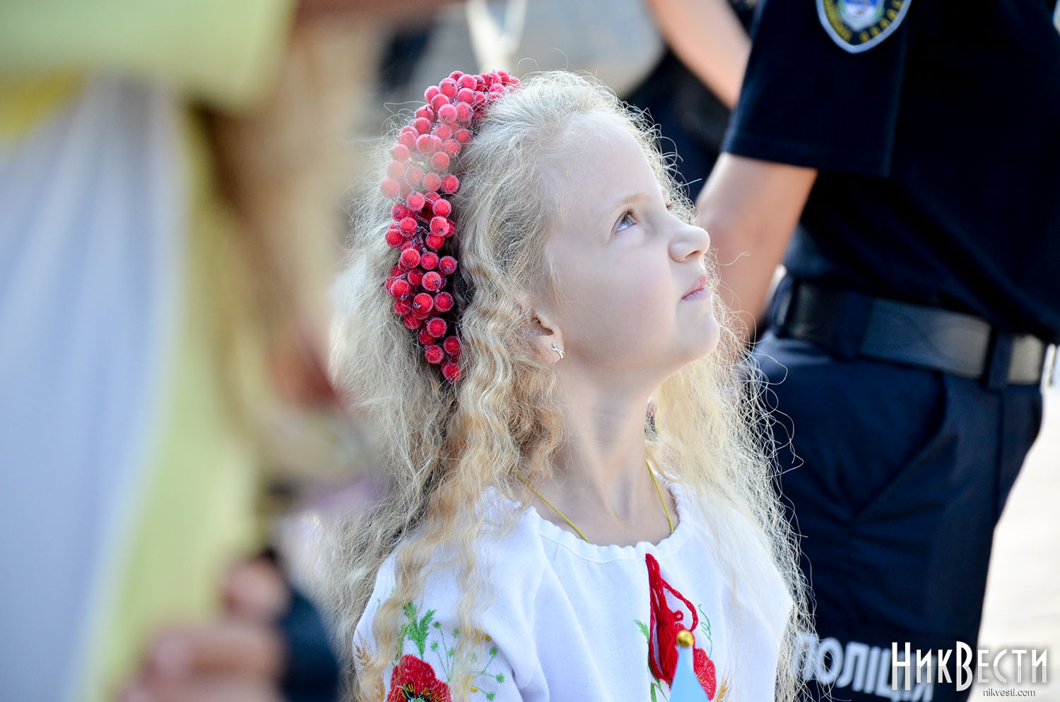 Внесли флаг перед поднятием военнослужащие Национальной гвардии. Колонну возглавил николаевский киборг Александр Терещенко и мать погибшего бойца АТО Алексея Волкова Руслана Миронюк.