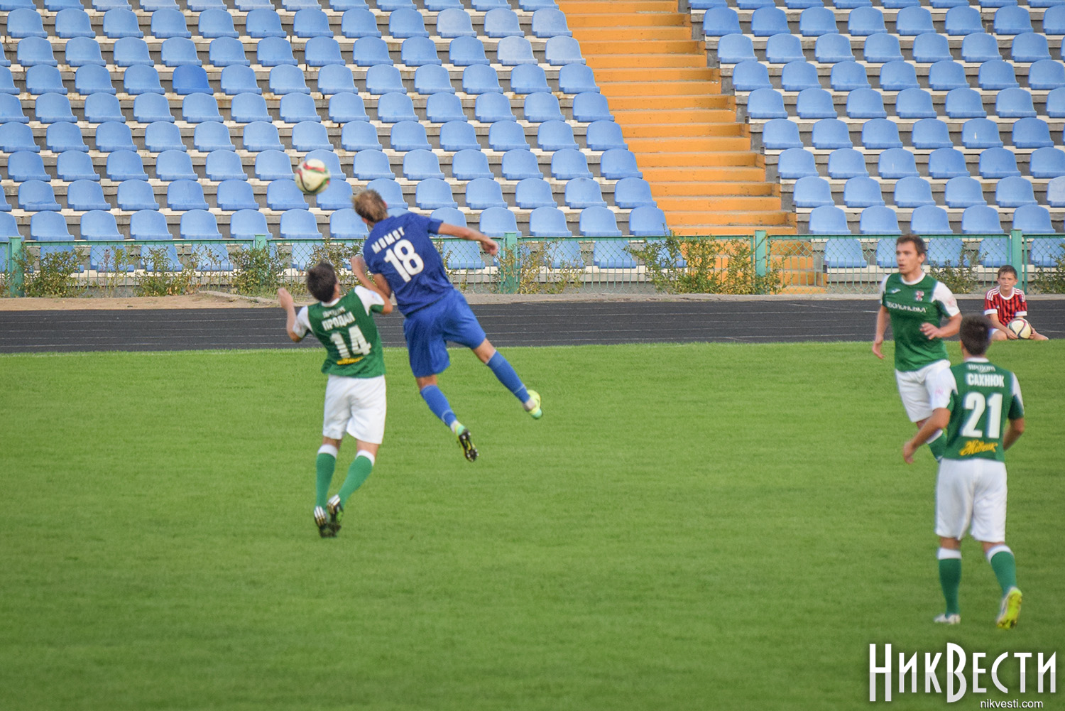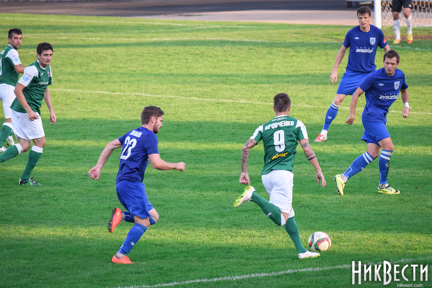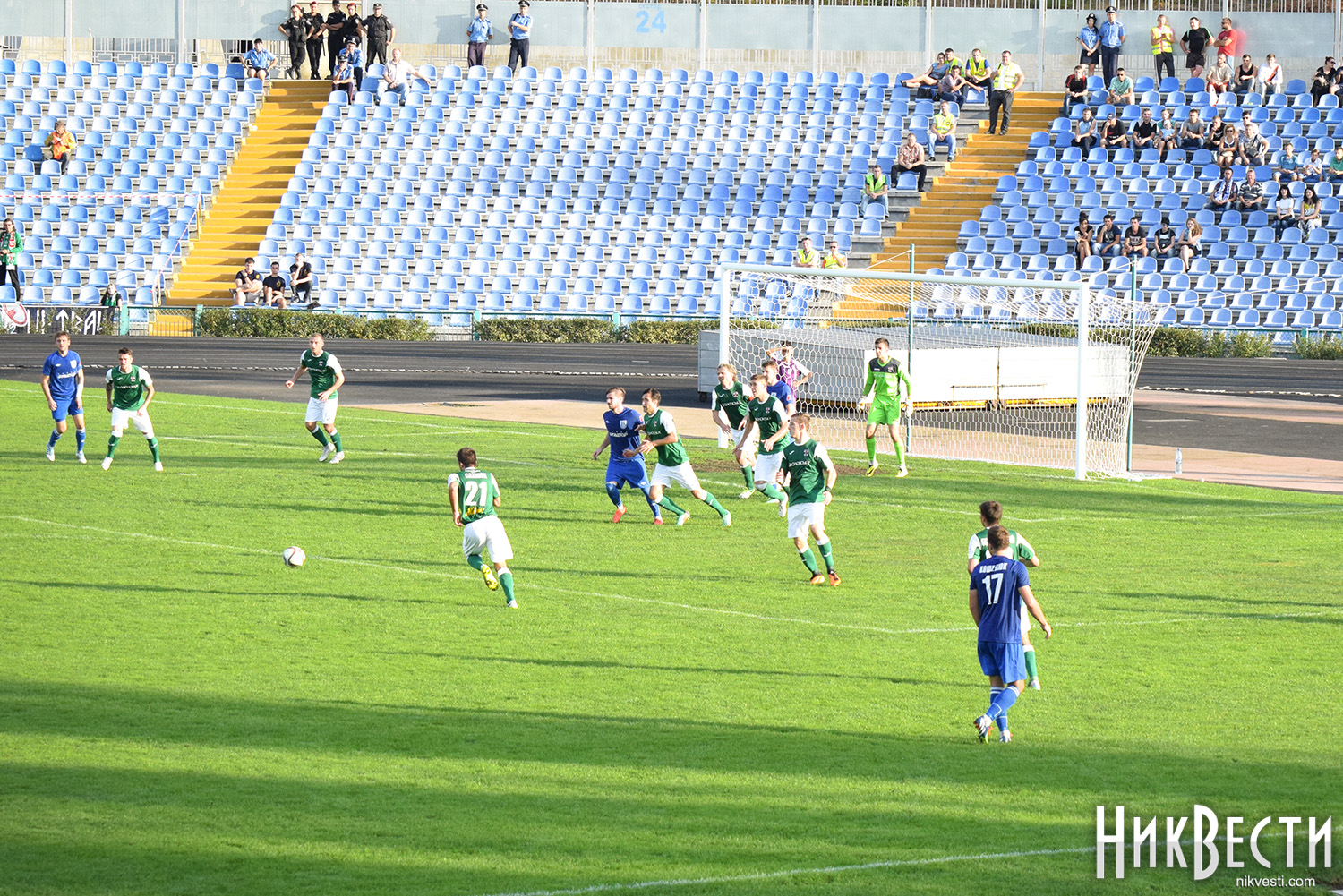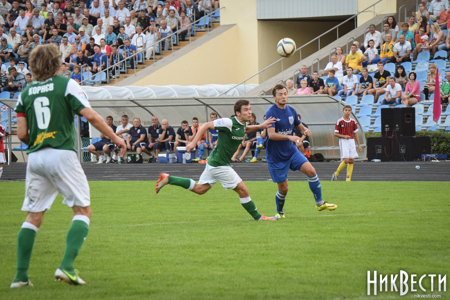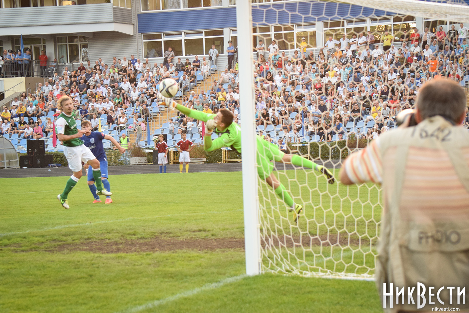 «В дебюте матча поуверенней выглядела «Оболонь», но извлечь дивиденды из ударов Бидловского и Сахнюка не смогла - в обоих случаях мяч пролетел мимо рамки. МФК «Николаев» впервые создал остроту у ворот Федоривского на 18-й минуте: Батюшин со штрафного пальнул в нижний угол, голкипер отразил мяч перед собой, но набежавший Сикорский пробил мимо цели. На 20-й минуте уже «Оболонь» была близка к успеху после хлесткого удара Фаворова метров с двадцати - Чумак в прыжке отвел угрозу. А на 24-й минуте голкипер МФК «Николаев» оказался бессилен, когда Сахнюк из пределов штрафной с разворота метко пробил под штангу. 0:1», - пишут «Николаевские новости».