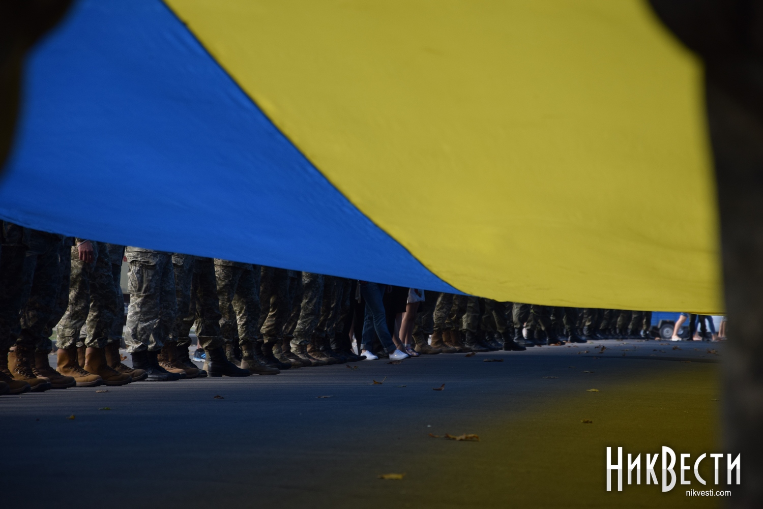 Колонну из военных сформировали на пересечении проспекта Центрального и улицы Соборной, после чего они развернули 150-метровый флаг. Среди участников акции – воины 79-й отдельной аэромобильной бригады, бойцы Морской пехоты, представители Национальной гвардии, воины из полка «Азов», а также военные моряки и летчики.