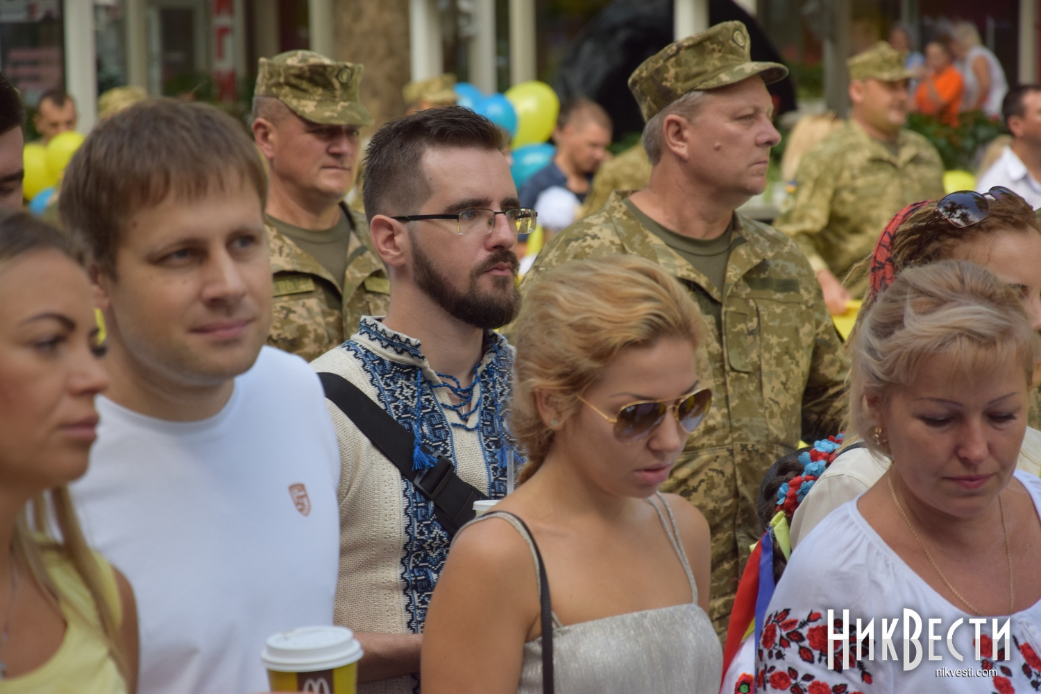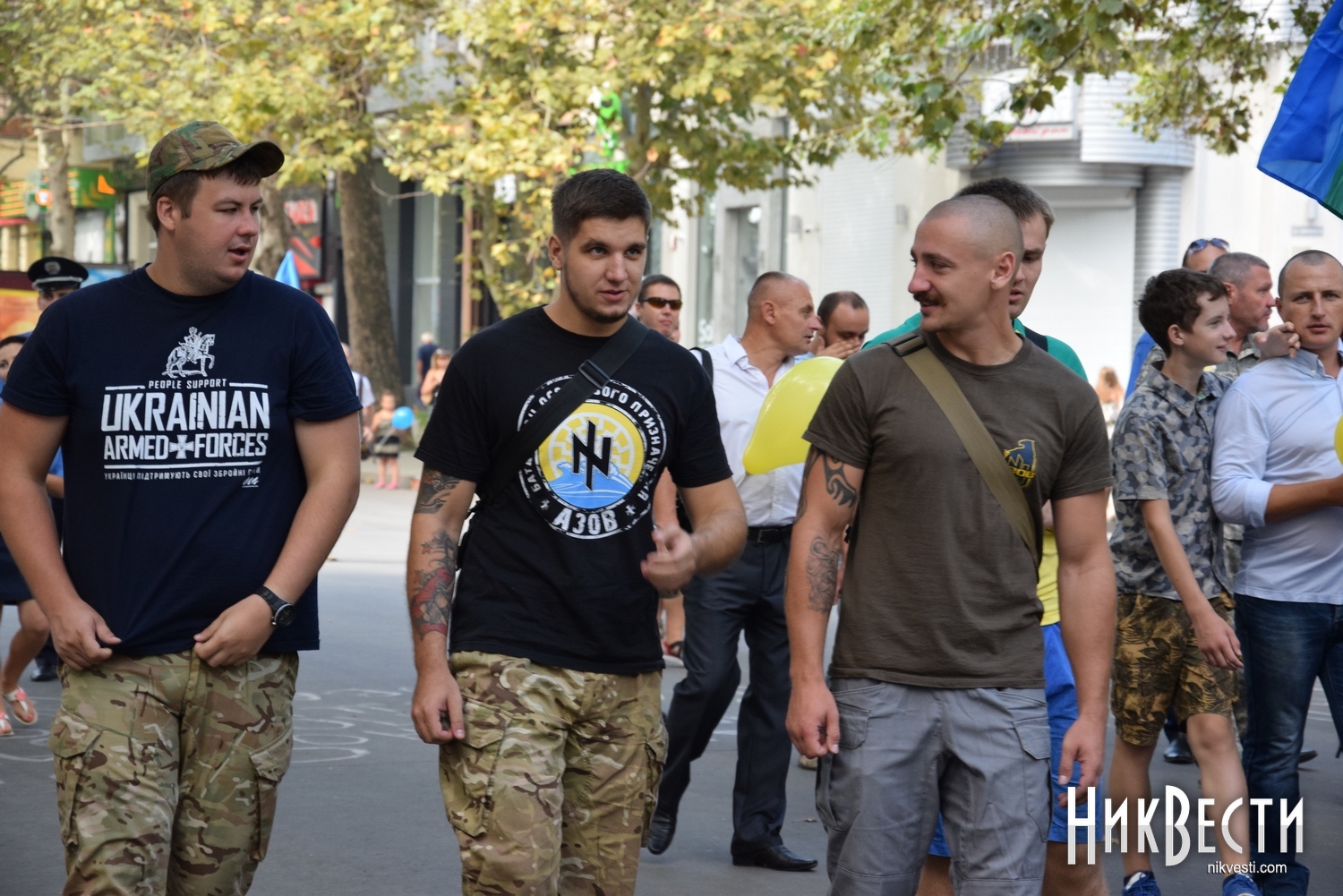 Вместе с военными и волонтерами по улице Соборной прошлись горожане, большинство из них было в вышиванках, с сине-желтыми флажками и шариками.