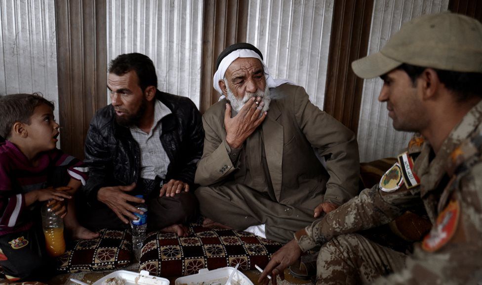 Первый лейтенант Алаа сидит с группой местных жителей в Кукджали. Как ожидается, операция по освобождению Мосула займет несколько недель, если не месяцевФото: Ayman Oghanna для BBC