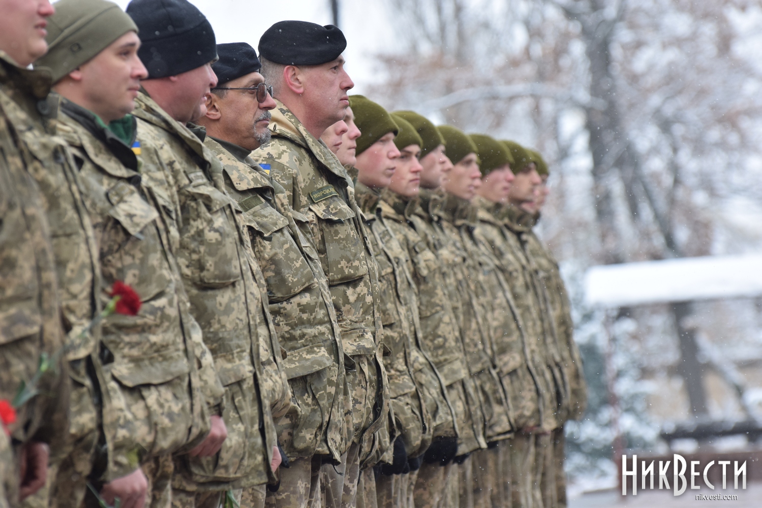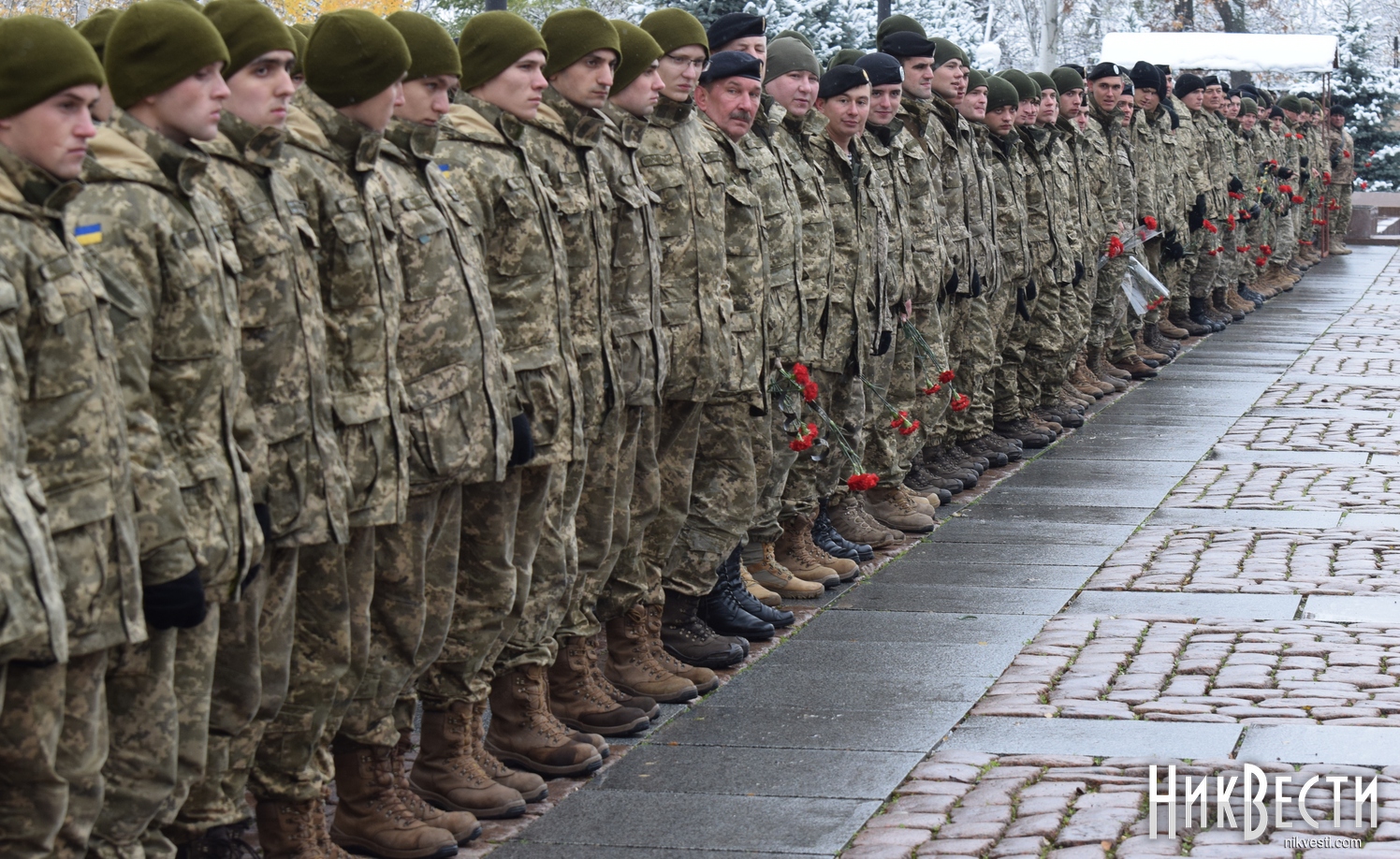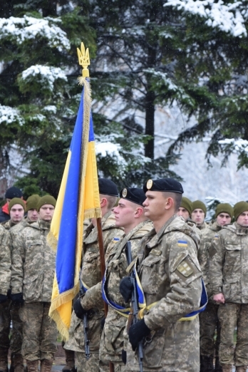 Перед вручением беретов бойцы минутой молчания почтили павших товарищей по оружию, которые погибли, защищая суверенитет и независимость страны в войне, которую развязала Россия в Донбассе.