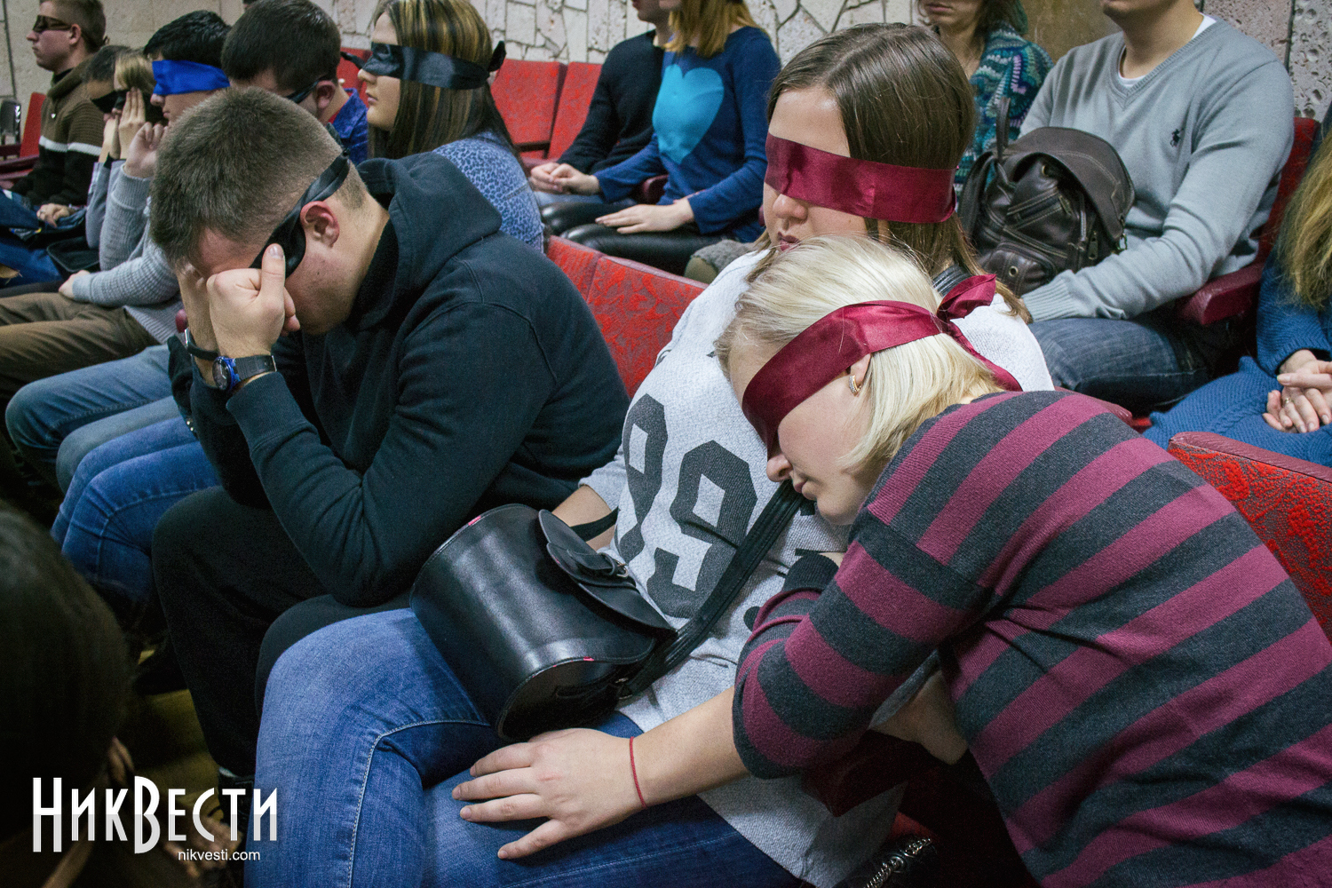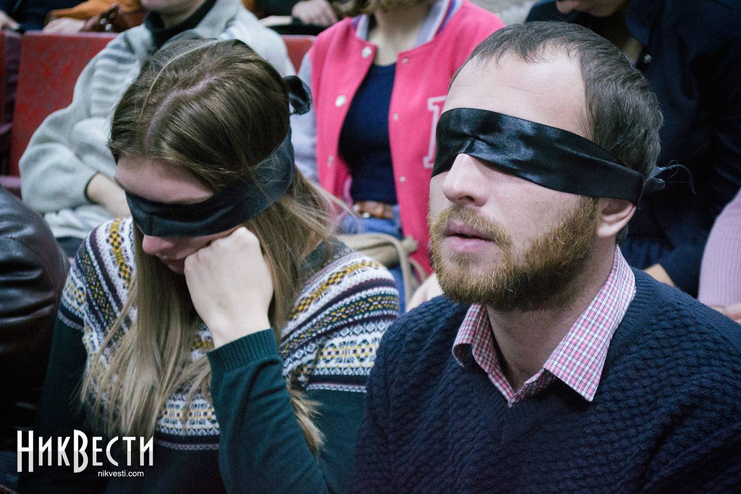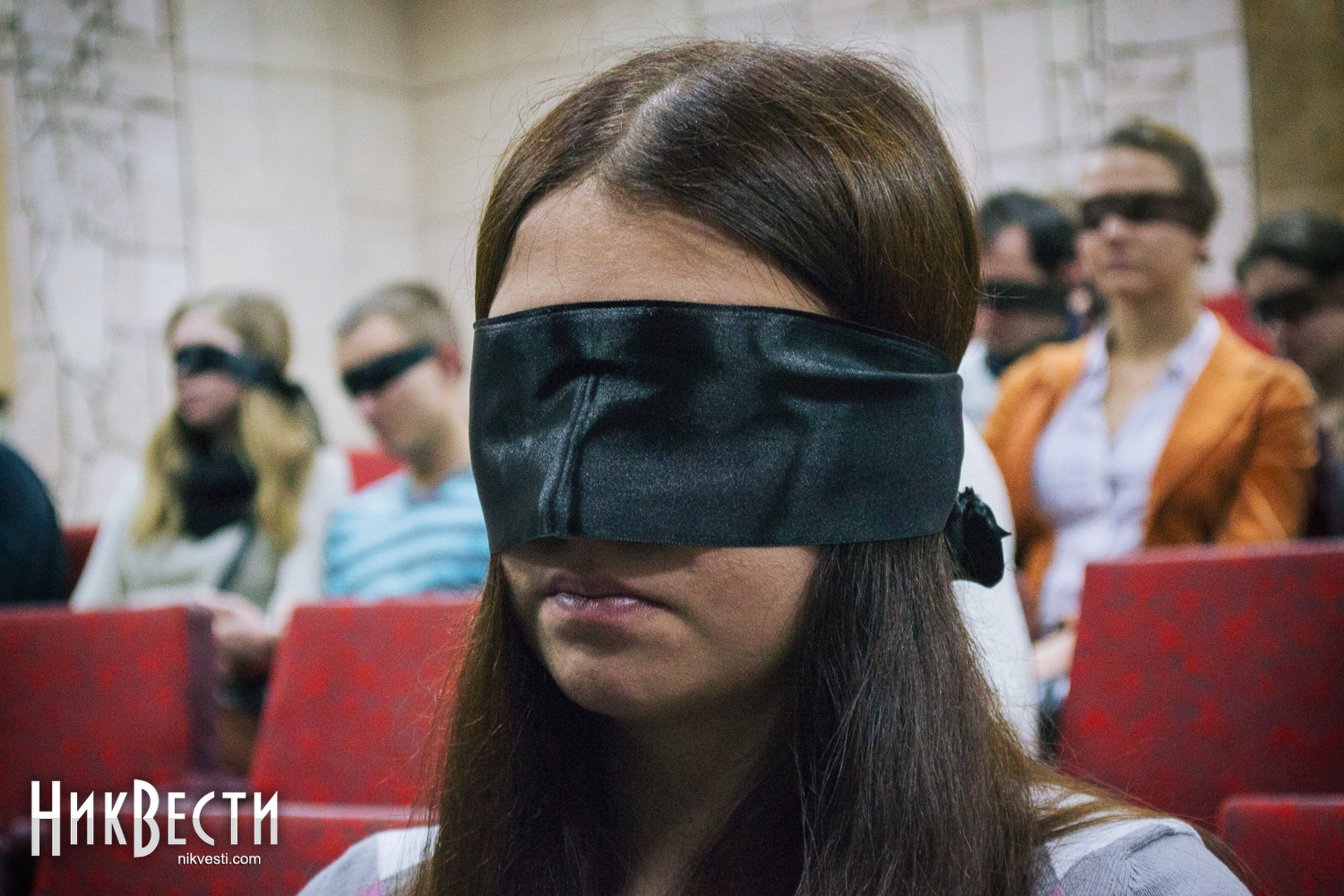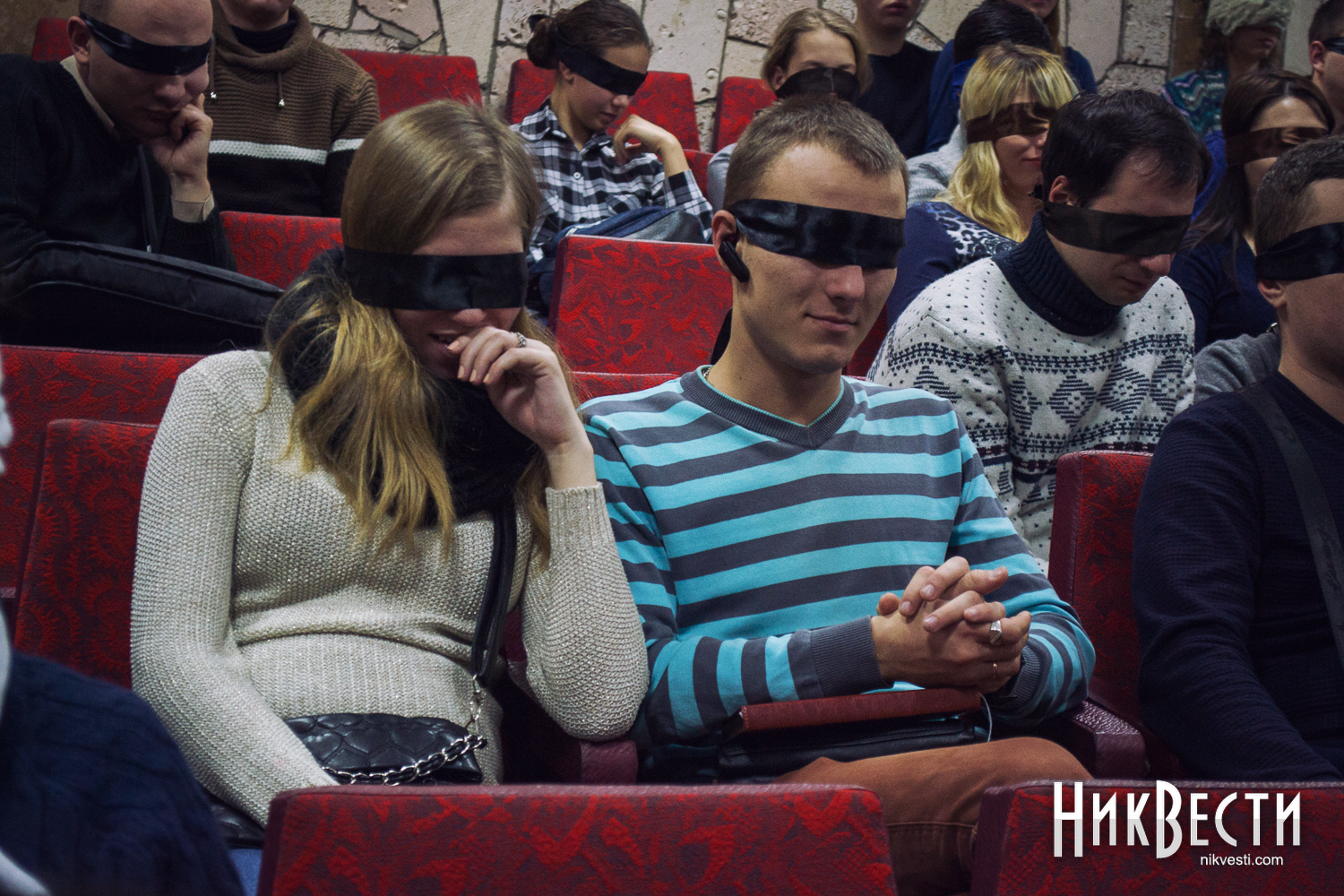 Даже на порог зала впускали только тех, кто уже сам или с легкой помощью друзей завязал глаза. Актеры театра и организаторы в буквальном смысле за руку провожали гостей на их места.