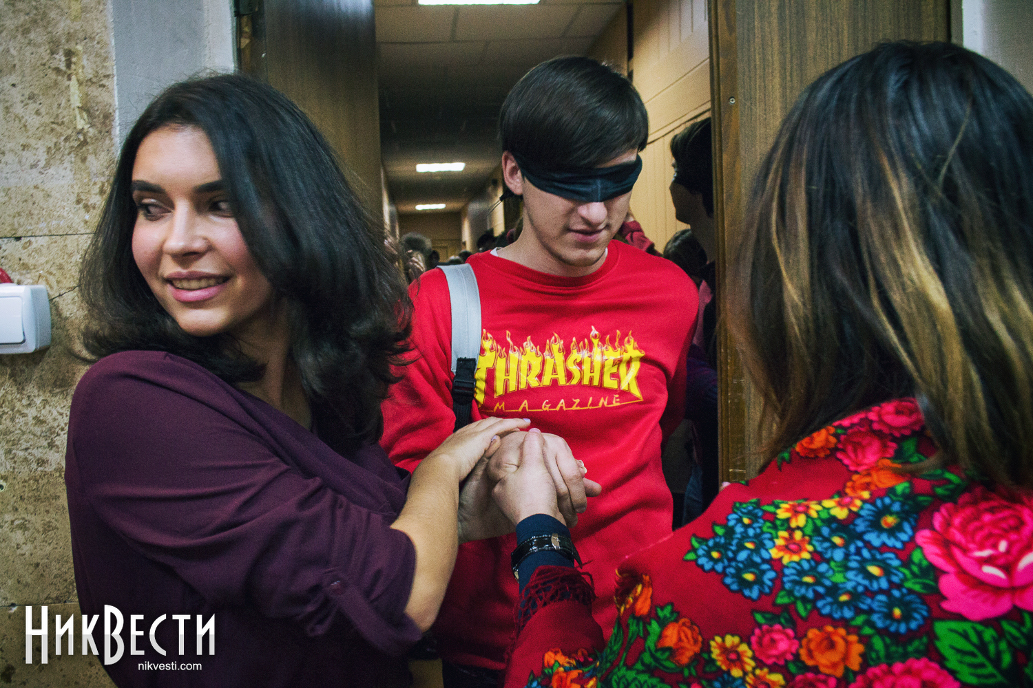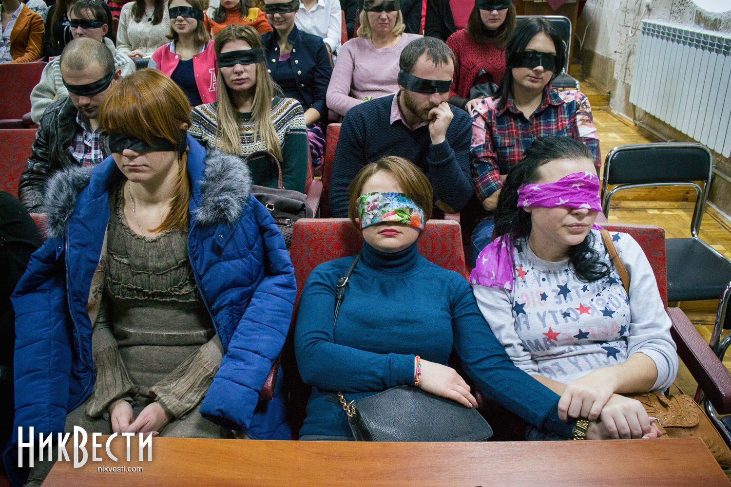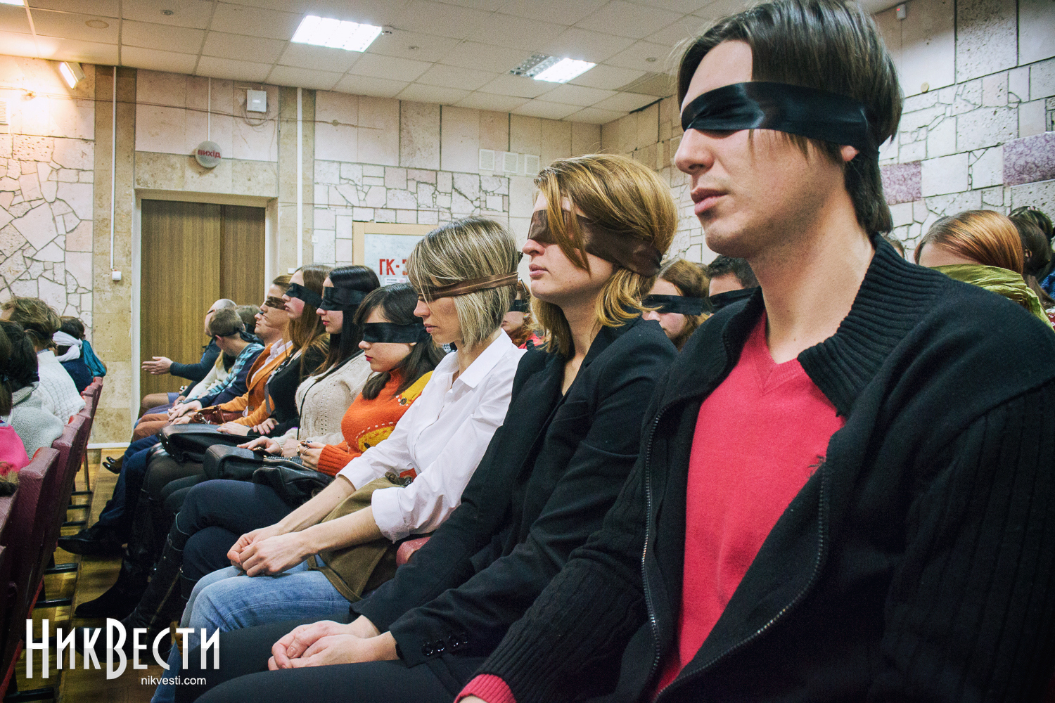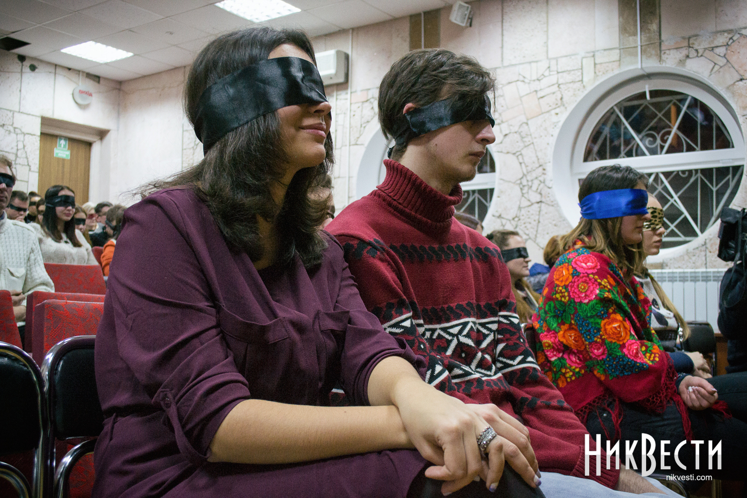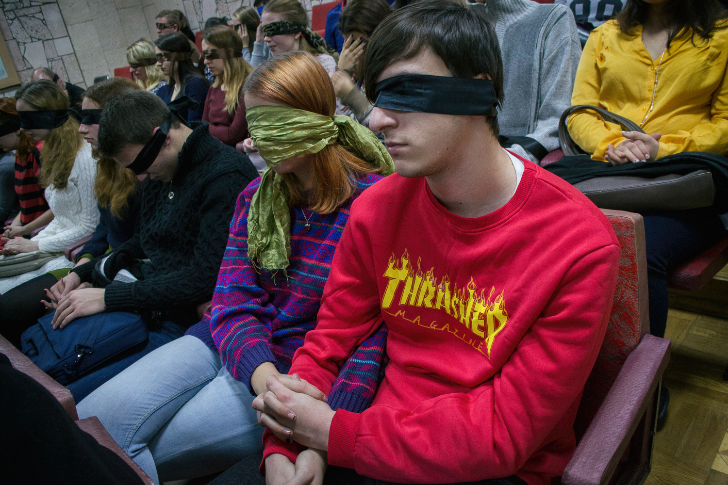 Даже на порог зала впускали только тех, кто уже сам или с легкой помощью друзей завязал глаза. Актеры театра и организаторы в буквальном смысле за руку провожали гостей на их места.