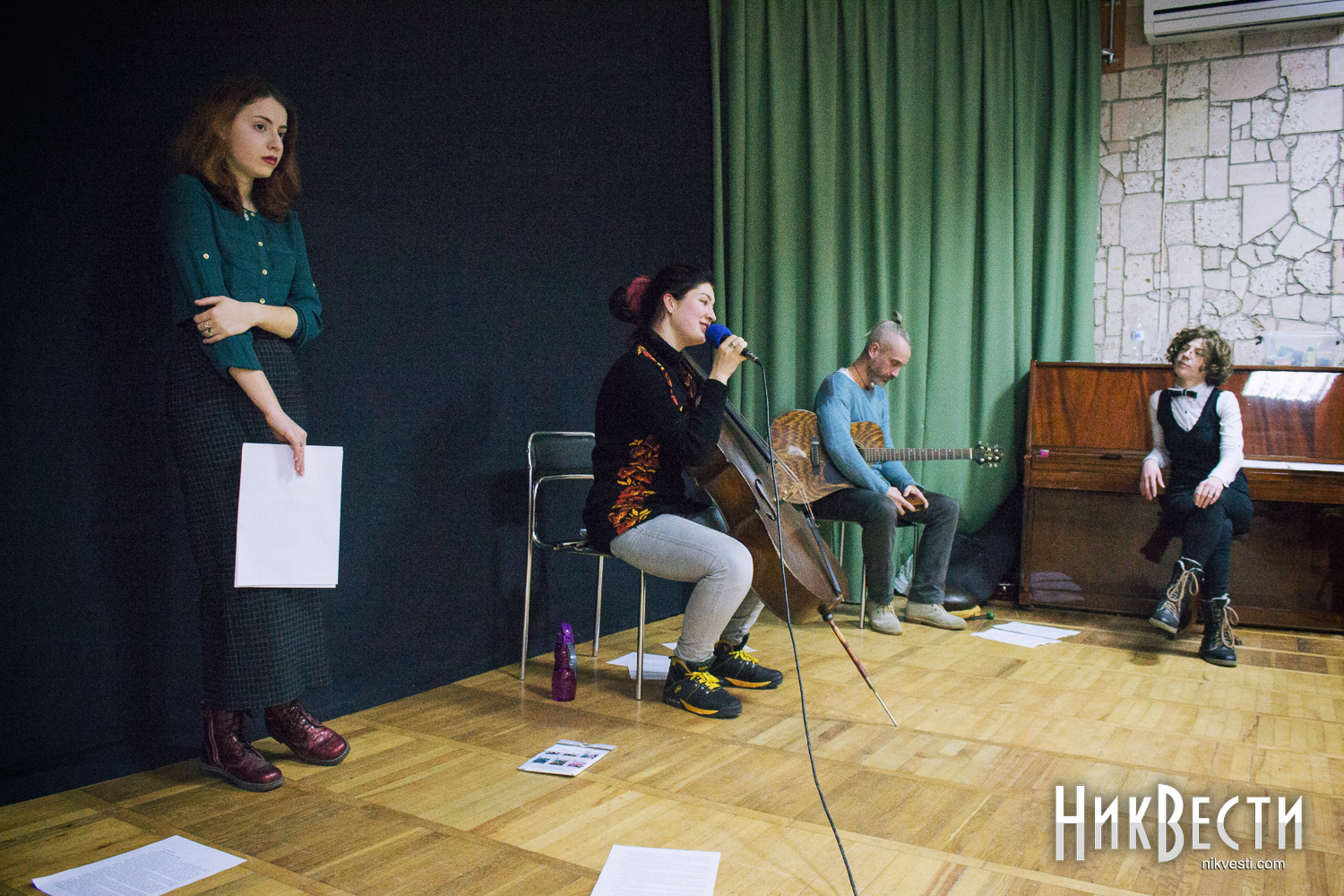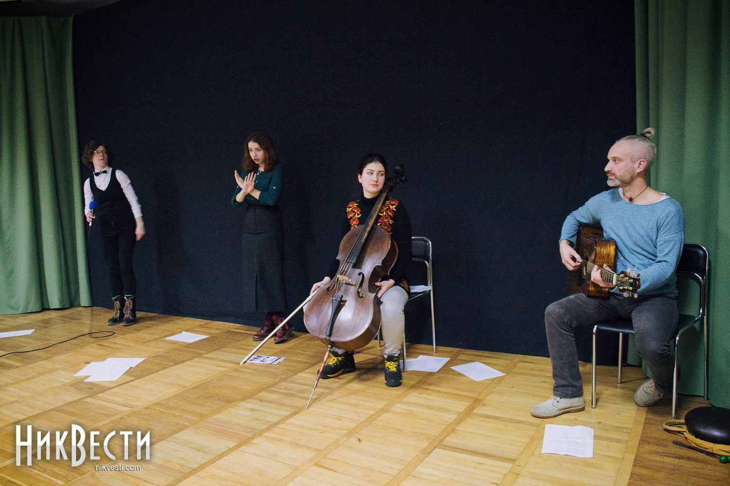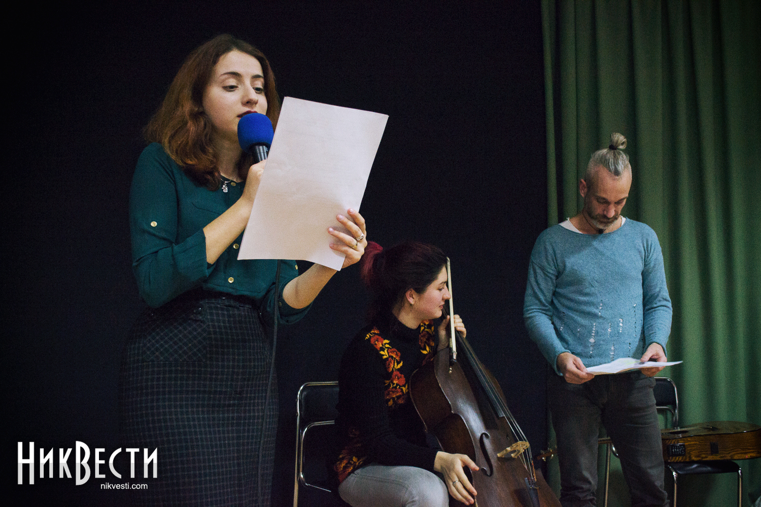 В Николаев Театр ушей приехал в таком составе: Ирина Фингерова – прозаик, журналист, создатель театра, Влада Ильинская – поэт, София Вишневская – поэзия, виолончель и Тимур Белкин – глюкофон, гитара.