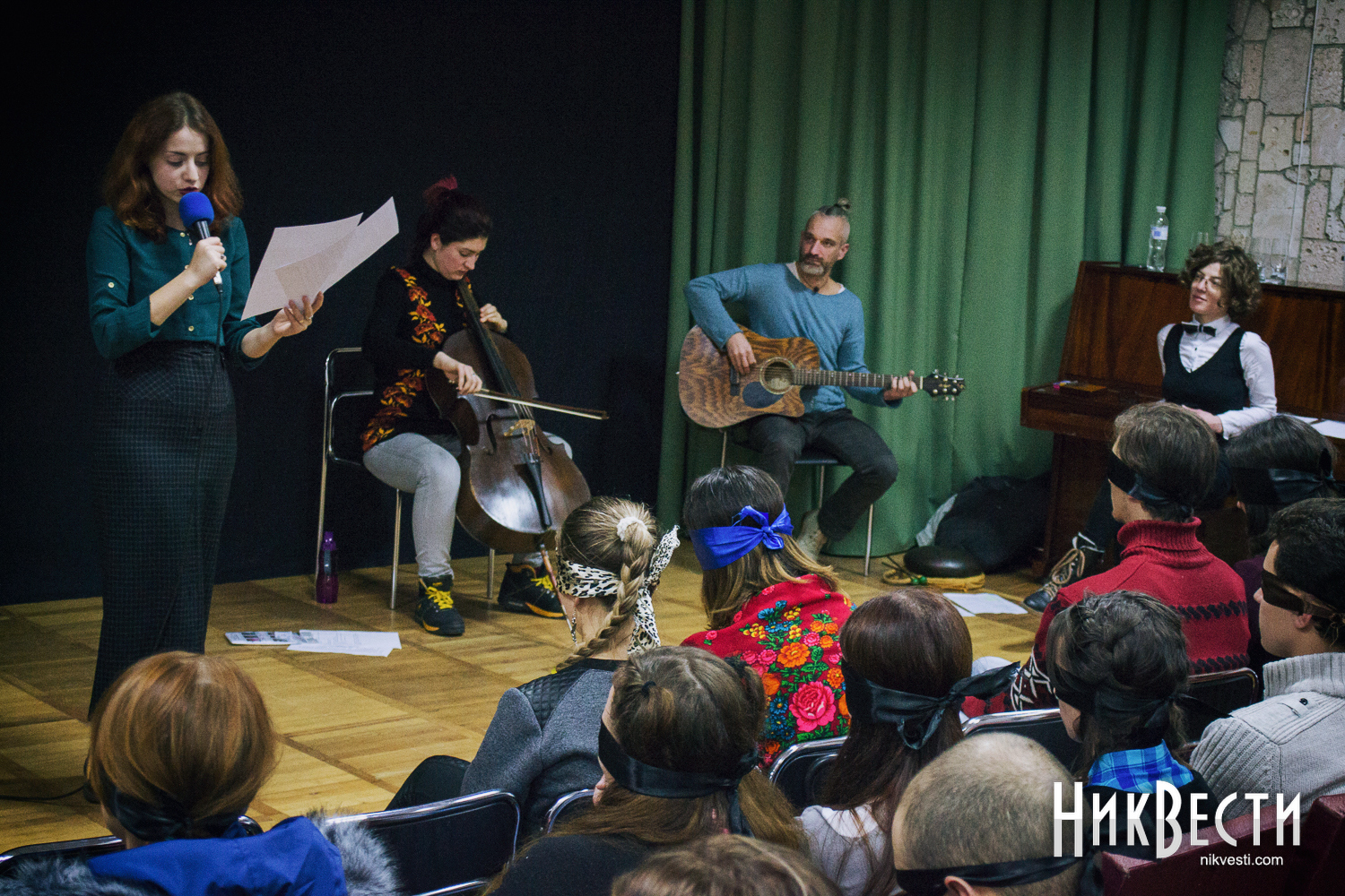 Вечером 2 декабря состоялся дебют на николаевской сцене одесского Театра ушей. Главная особенность этого коллектива заключается в том, что на представлении всем без исключения зрителям завязывают глаза, заставляя тем самым глубже погружаться в царство звука.