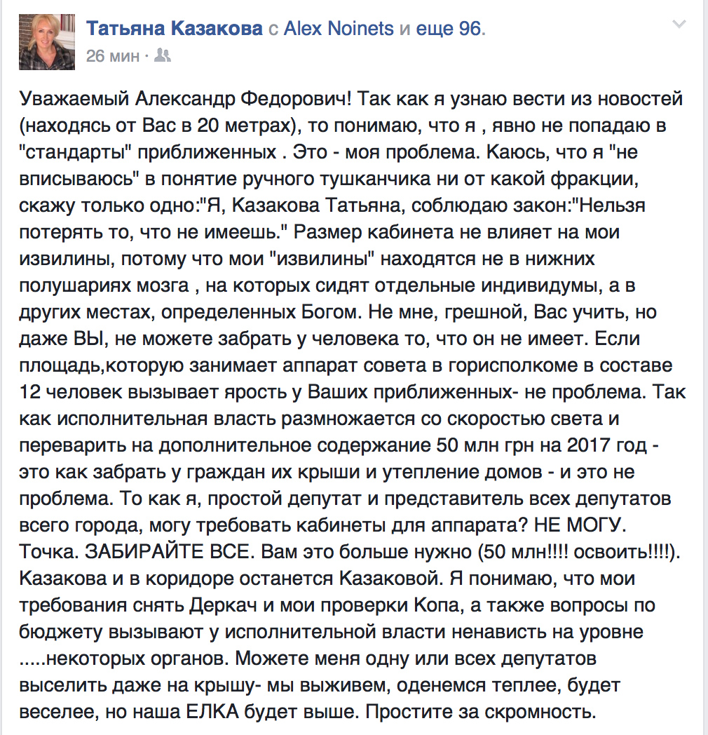 — Если площадь, которую занимает аппарат совета в горисполкоме в составе 12 человек, вызывает ярость у ваших приближенных — не проблема. Так как исполнительная власть со скоростью света, и переварить на дополнительное содержание 50 миллионов гривен в 2017 году — это как забрать у граждан их крыши и утепление домов, и это не проблема. То как я, простой депутат и представитель всех депутатов города, могу требовать кабинеты для аппарата? Не могу. Точка. Забирайте все. Вам больше нужно! 50 миллионов освоить, - написала Татьяна Казакова.